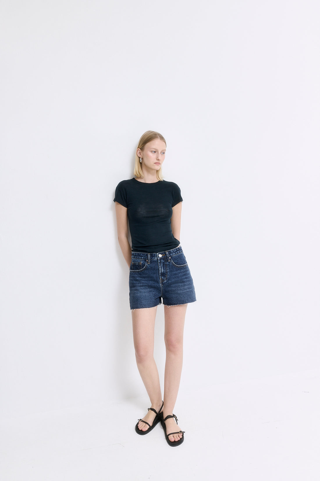 Our new mid rise denim shorts is your new go-to summer piece. Mid rise. A classic zipper closure. Raw Finish. Delicate belt loops. Luxurious logo leather patch detailing on the back. Contrasted embroidered logo featuring on the back pocket. Two front pockets and back pockets. Style it with our shirred top, wide buckle belt and our leather Rodika for the perfect everyday look.