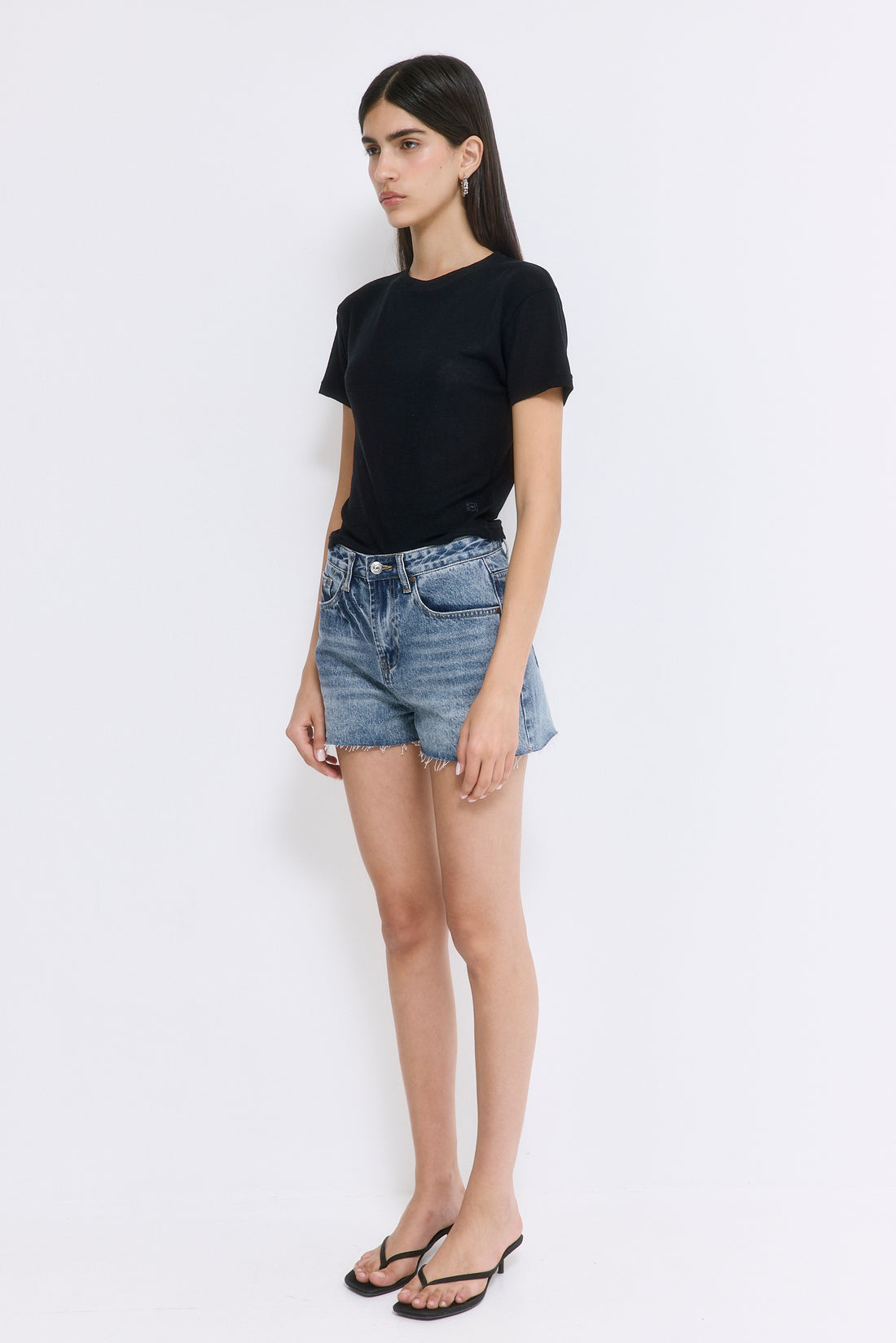Our new mid rise denim shorts is your new go-to summer piece. Mid rise. A classic zipper closure. Raw Finish. Delicate belt loops. Luxurious logo leather patch detaling on the back. Contrasted embroidered logo featuring on the back pocket. Two front pockets and back pockets. Style it with our shirred top, wide buckle belt and our leather Rodika for the perfect everyday look.