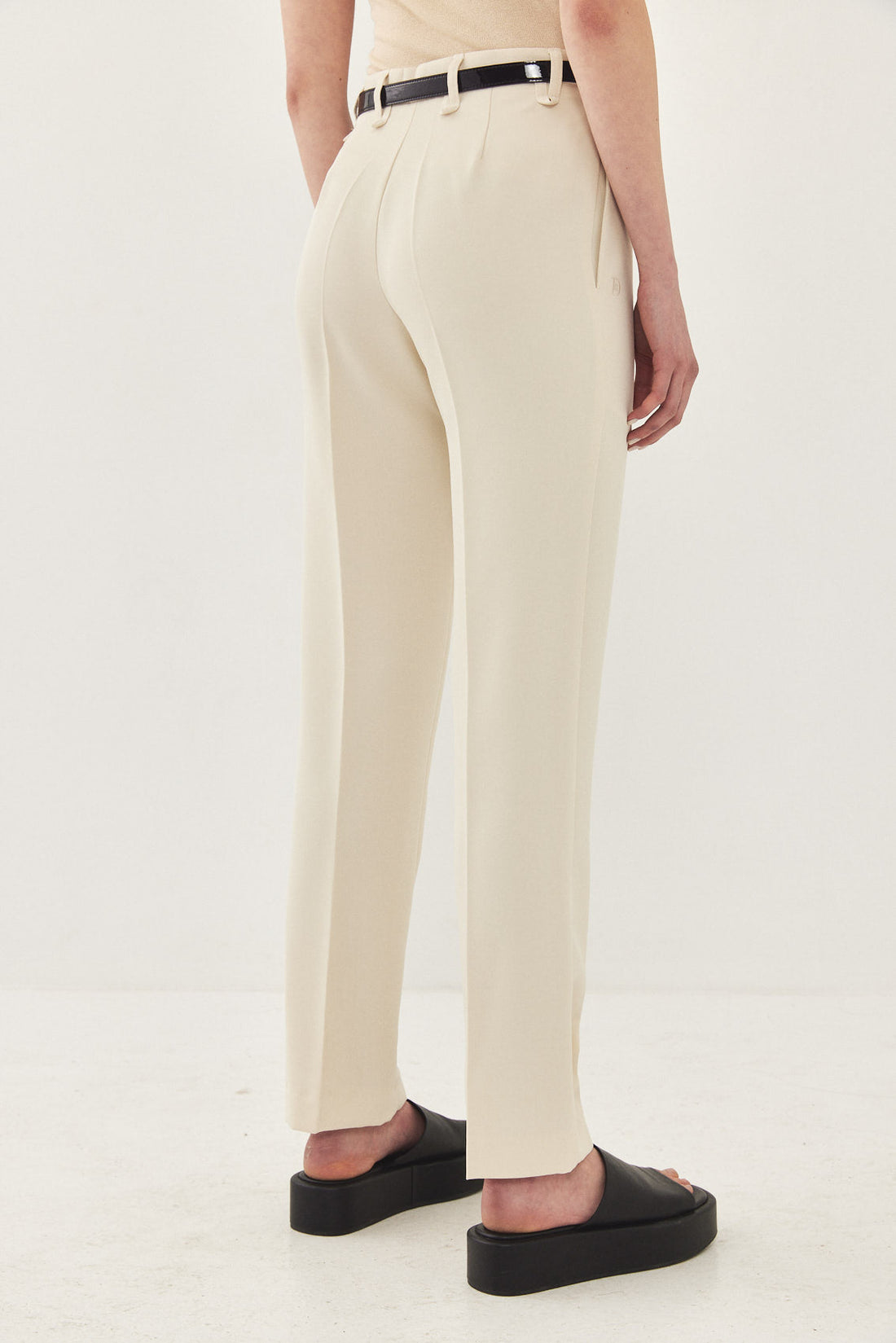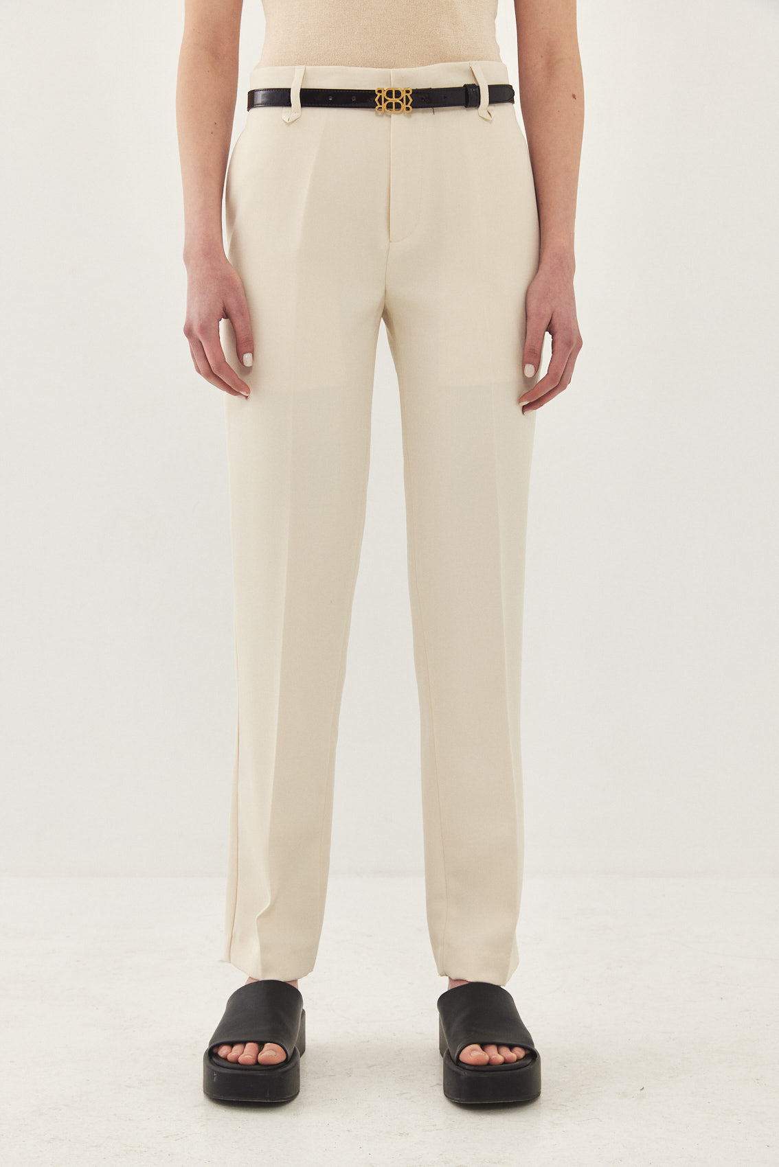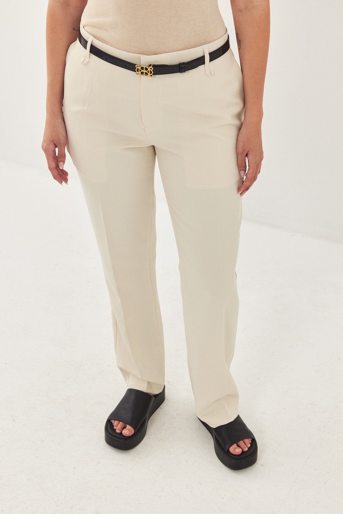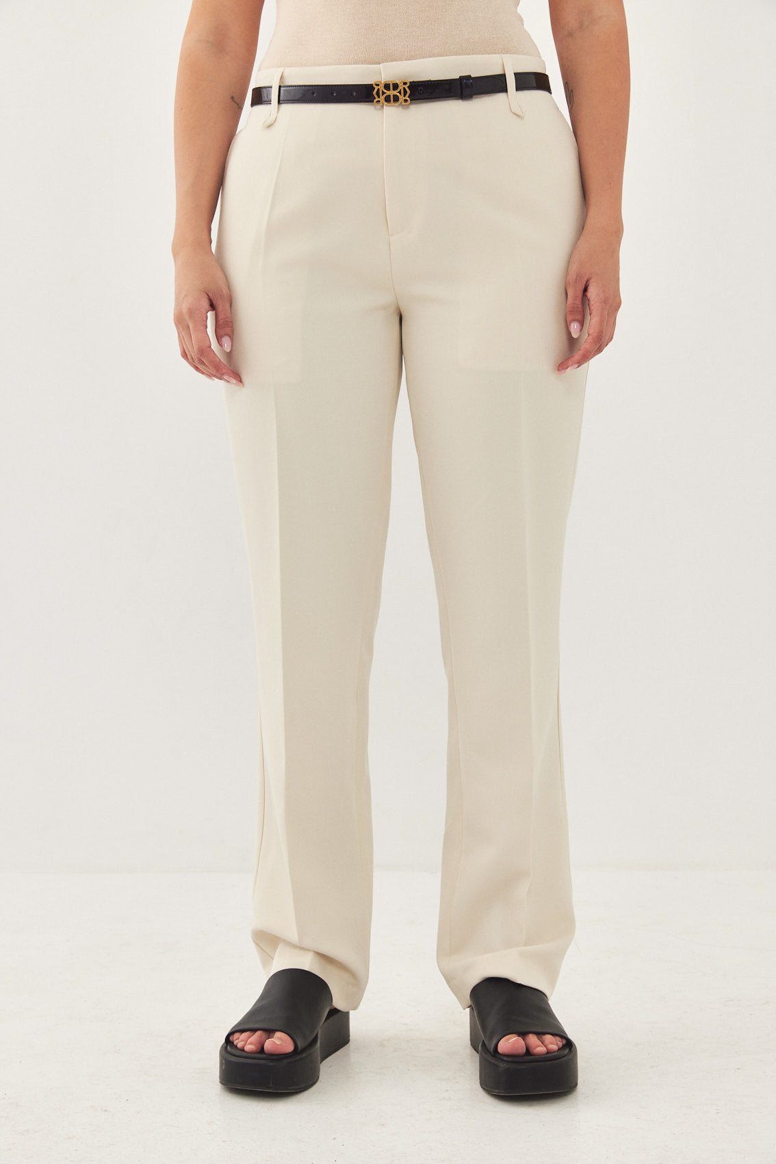 Straight fit mid rise tailored pants. Featuring side pockets, front pleat detail, belt loops and front metal hook and zip closure. Printed logo across inner belt. Style yours with a basic top and matching Daddy blazer.