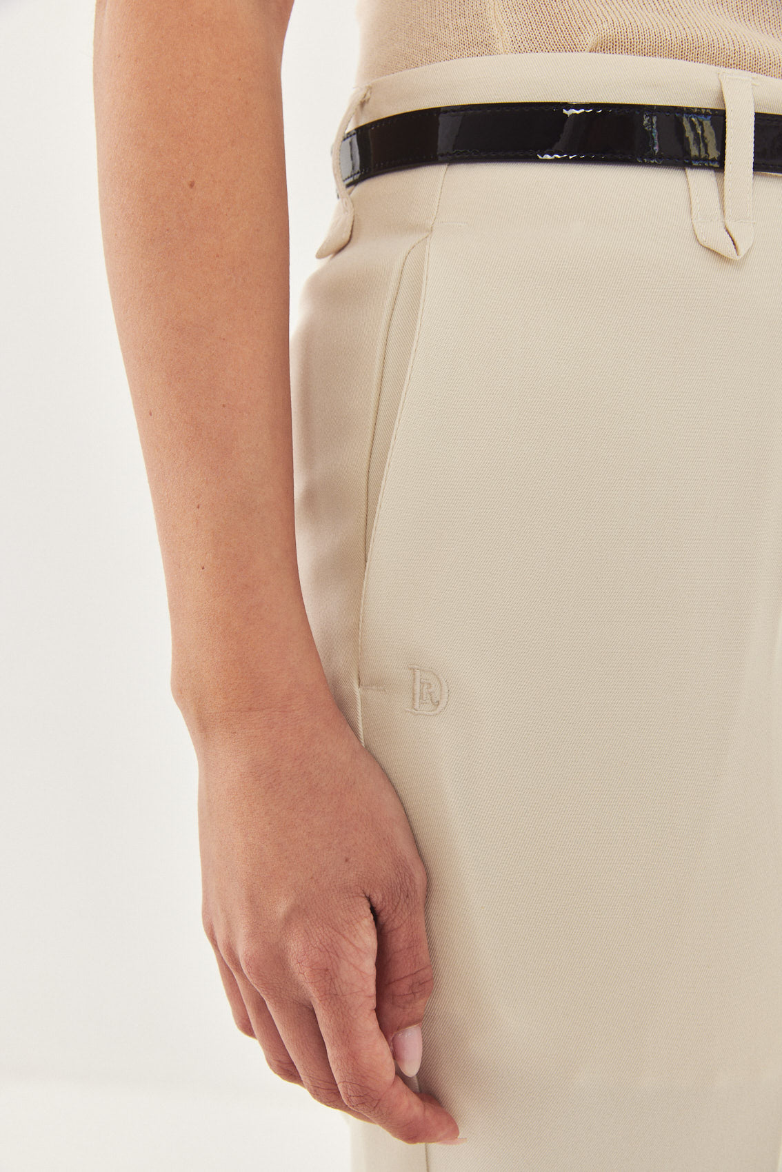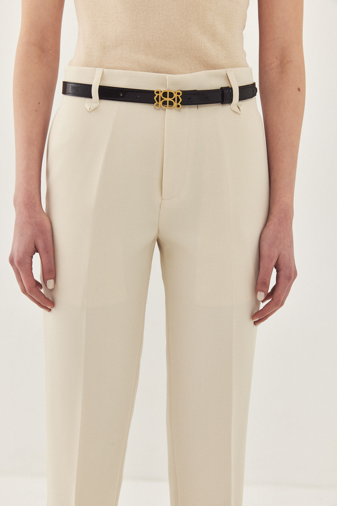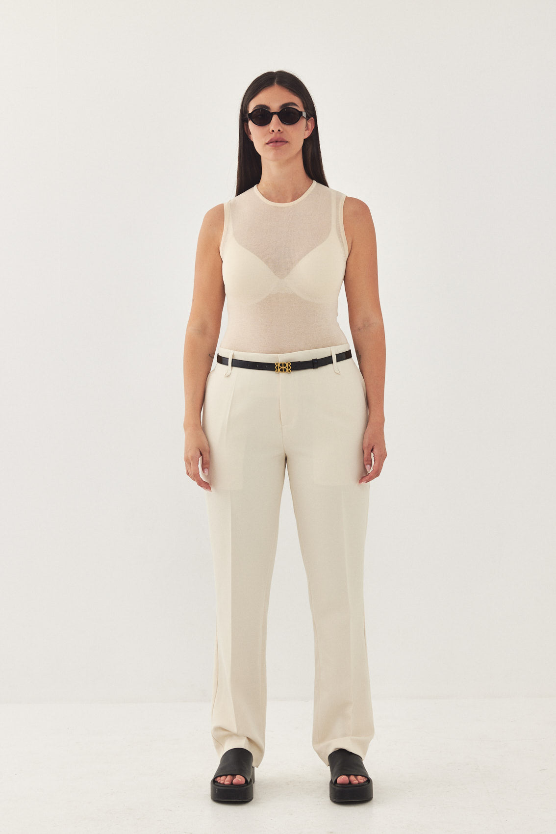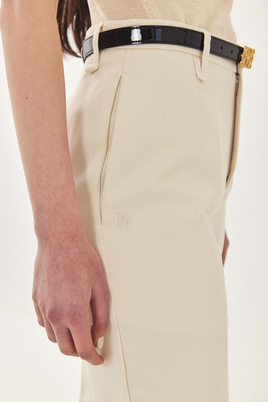 Straight fit mid rise tailored pants. Featuring side pockets, front pleat detail, belt loops and front metal hook and zip closure. Printed logo across inner belt. Style yours with a basic top and matching Daddy blazer.