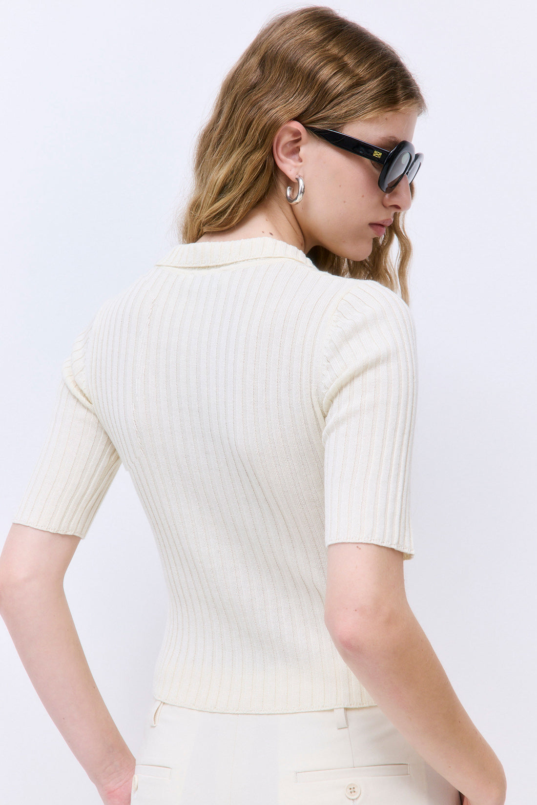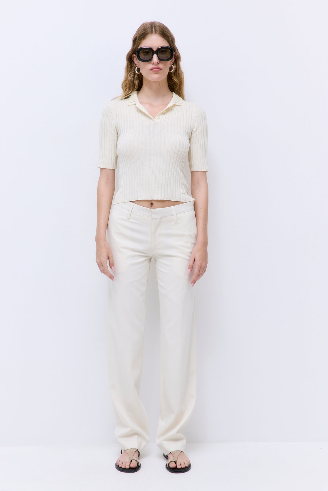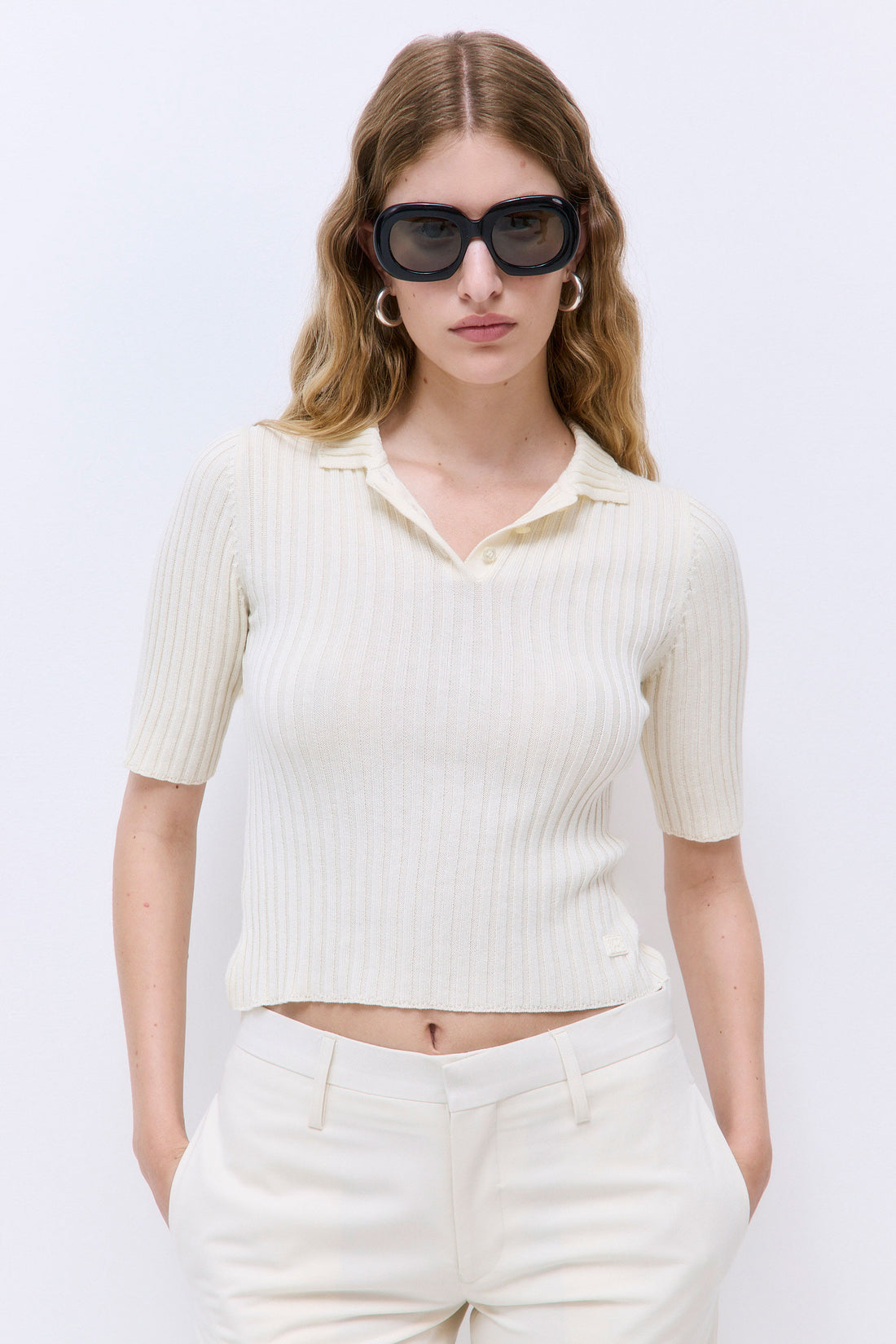 The ultimate fall essential, designed for effortless wear. Polo collar. Mid length sleeves. Featuring 3 tonal buttons. Ribbed fabric. Fitted. Fully fashioned. Clean finishes. Detailed with a tonal silicon logo on the front side. Style it with our iconic Tapered Leg Daddy Pants and sleek Rodika tote bag for a refined, modern look.