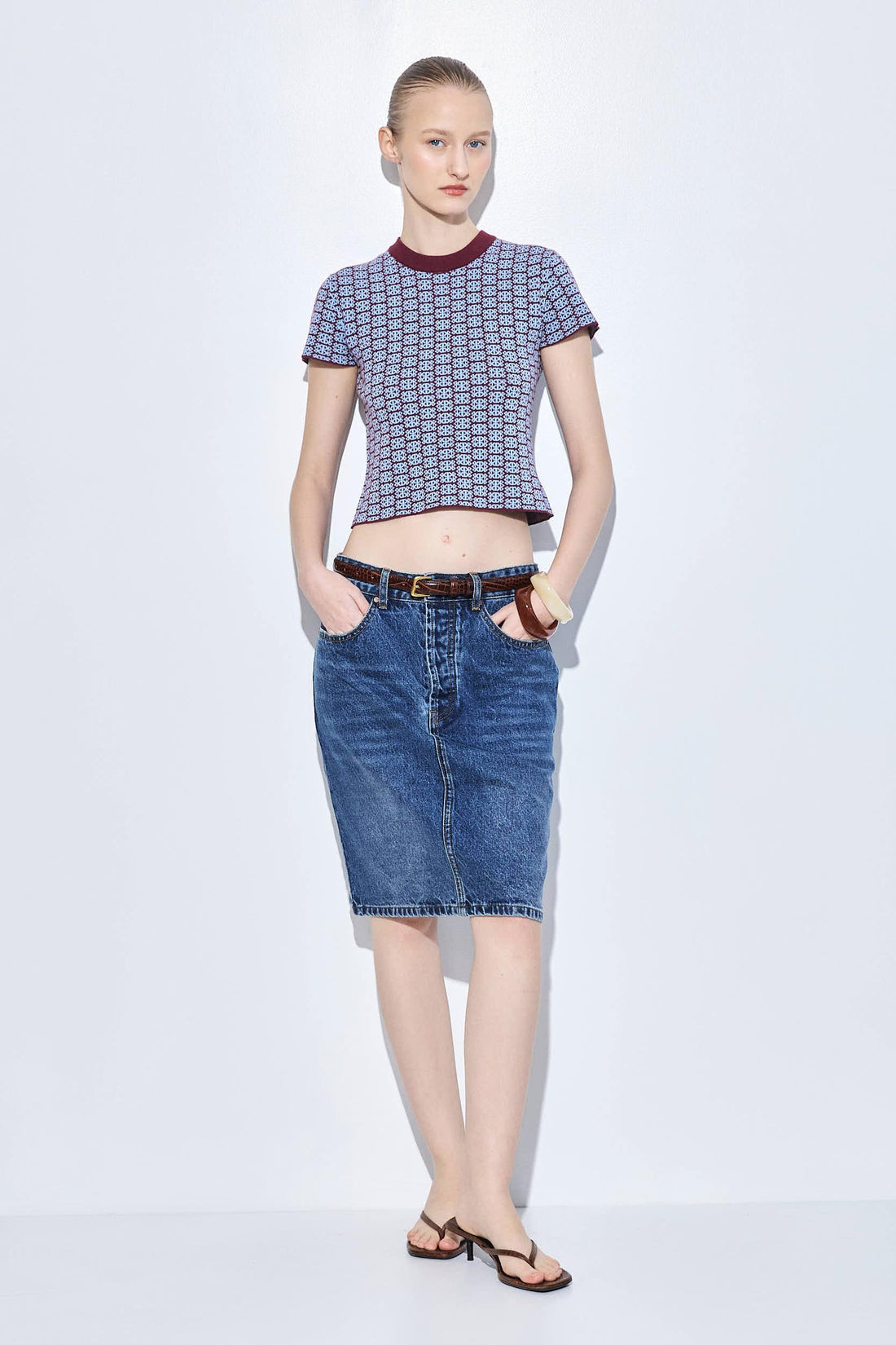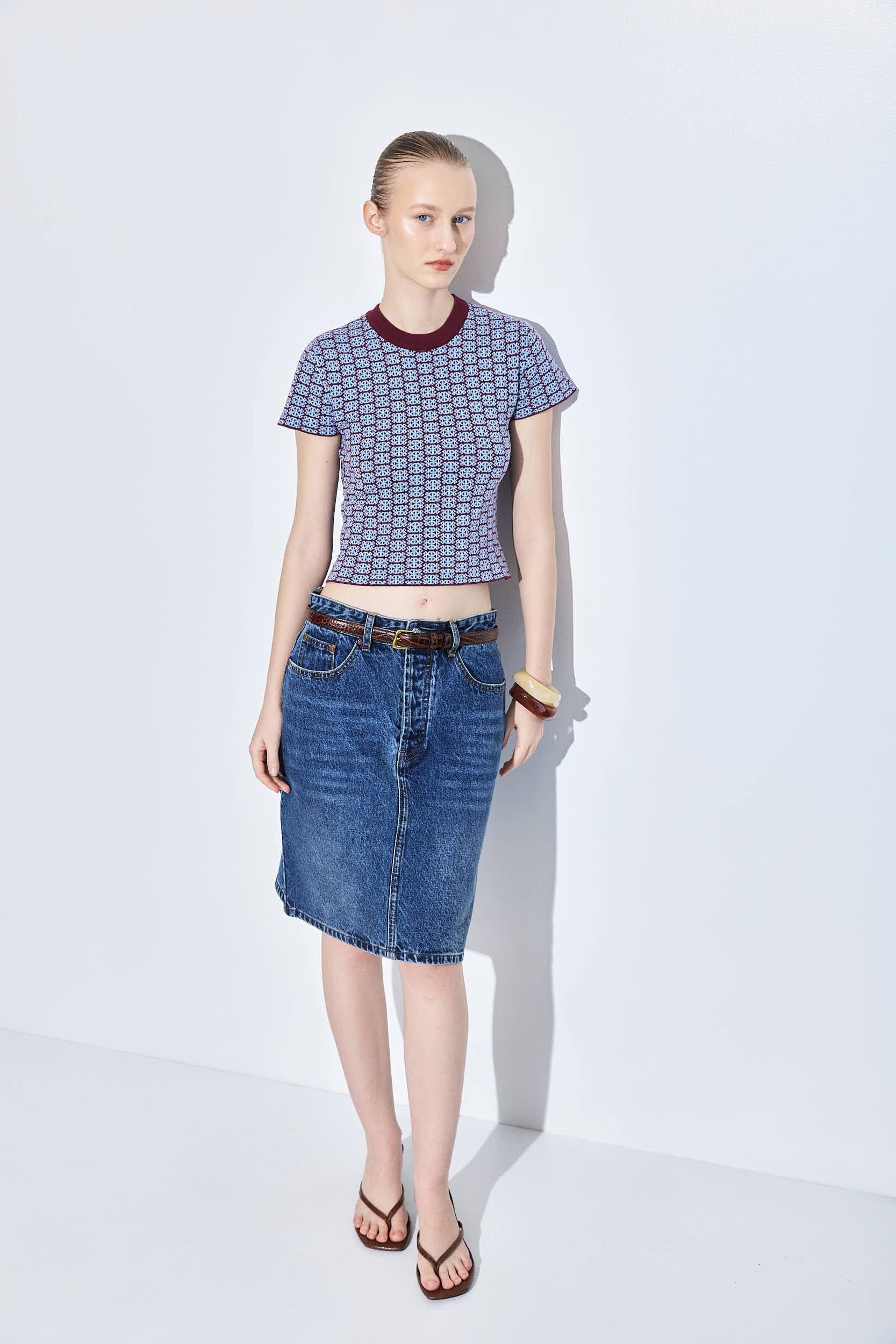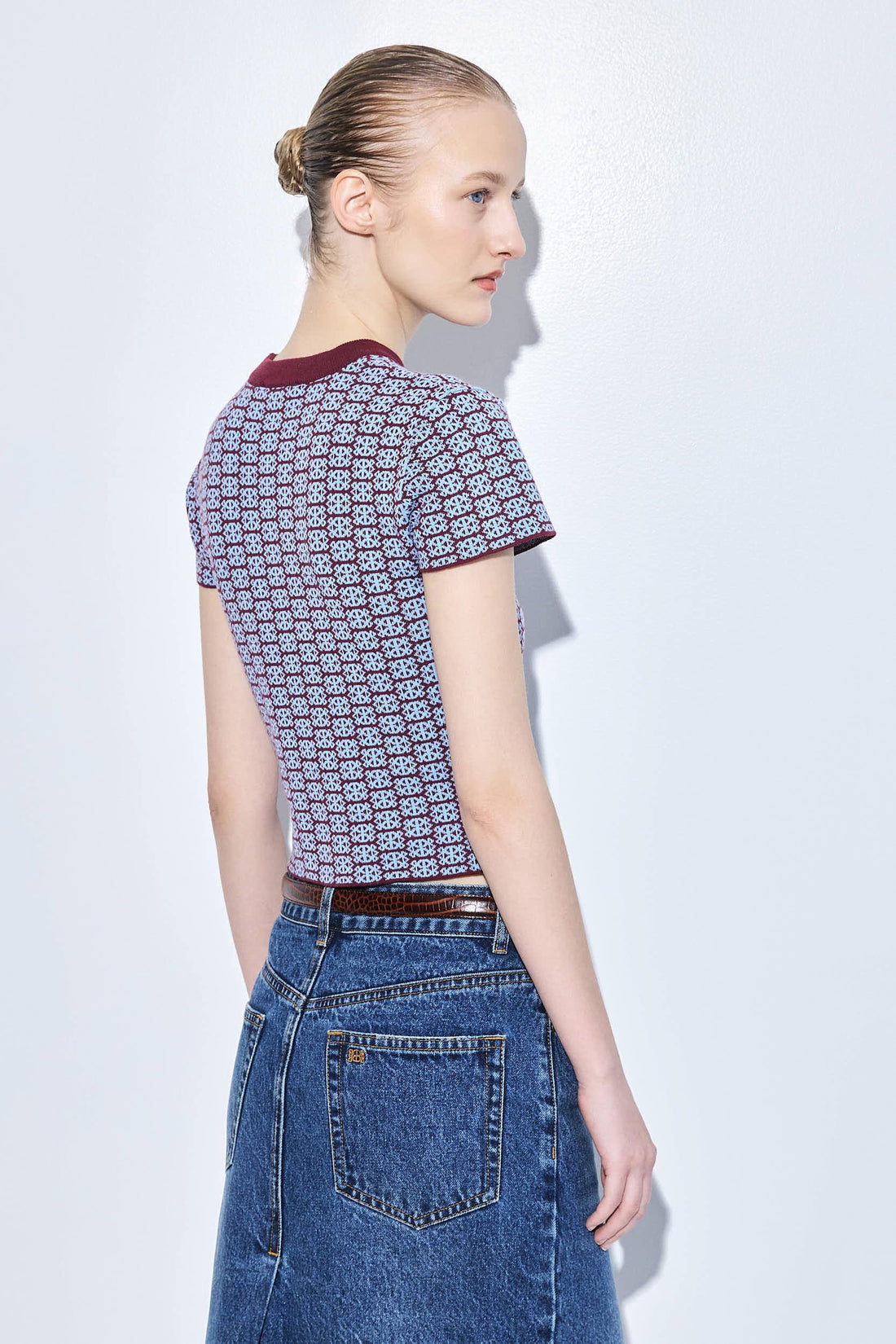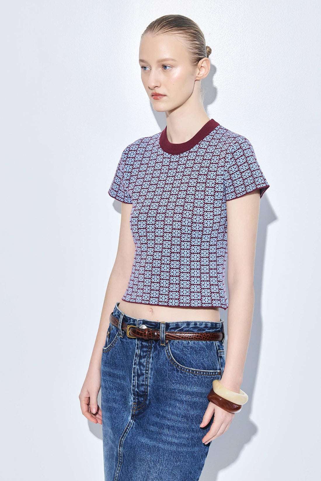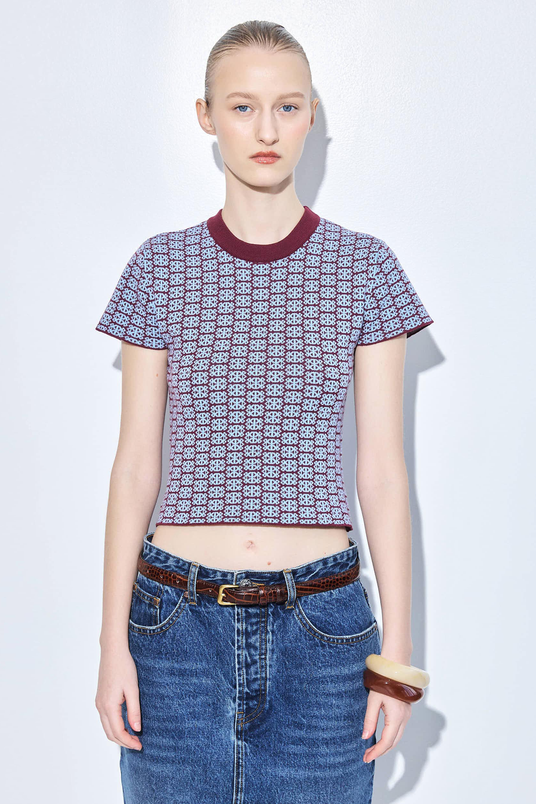 An essential staple with a luxe twist. Our new monogram baby tee features a ribbed crew neckline and an all-over contrasting monogram intarsia logo. Crafted in a soft knit, it's designed to flatter while making a statement. Style it with our beautiful linen pants, a pair of our oval sunglasses and our cool scrunchie for an everyday summer look.