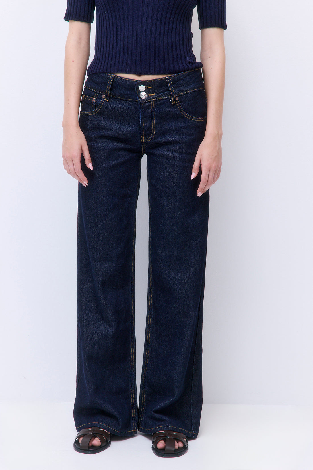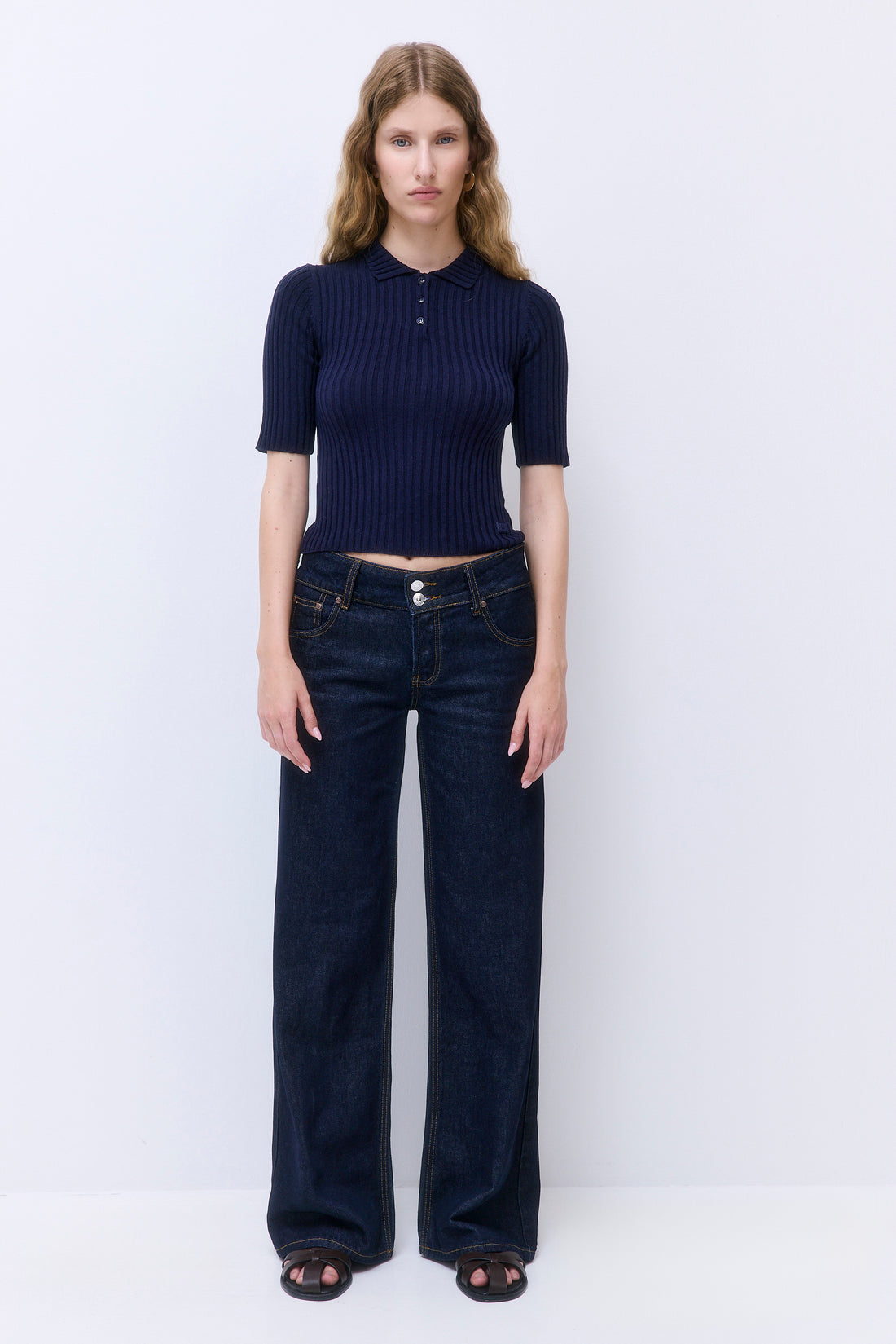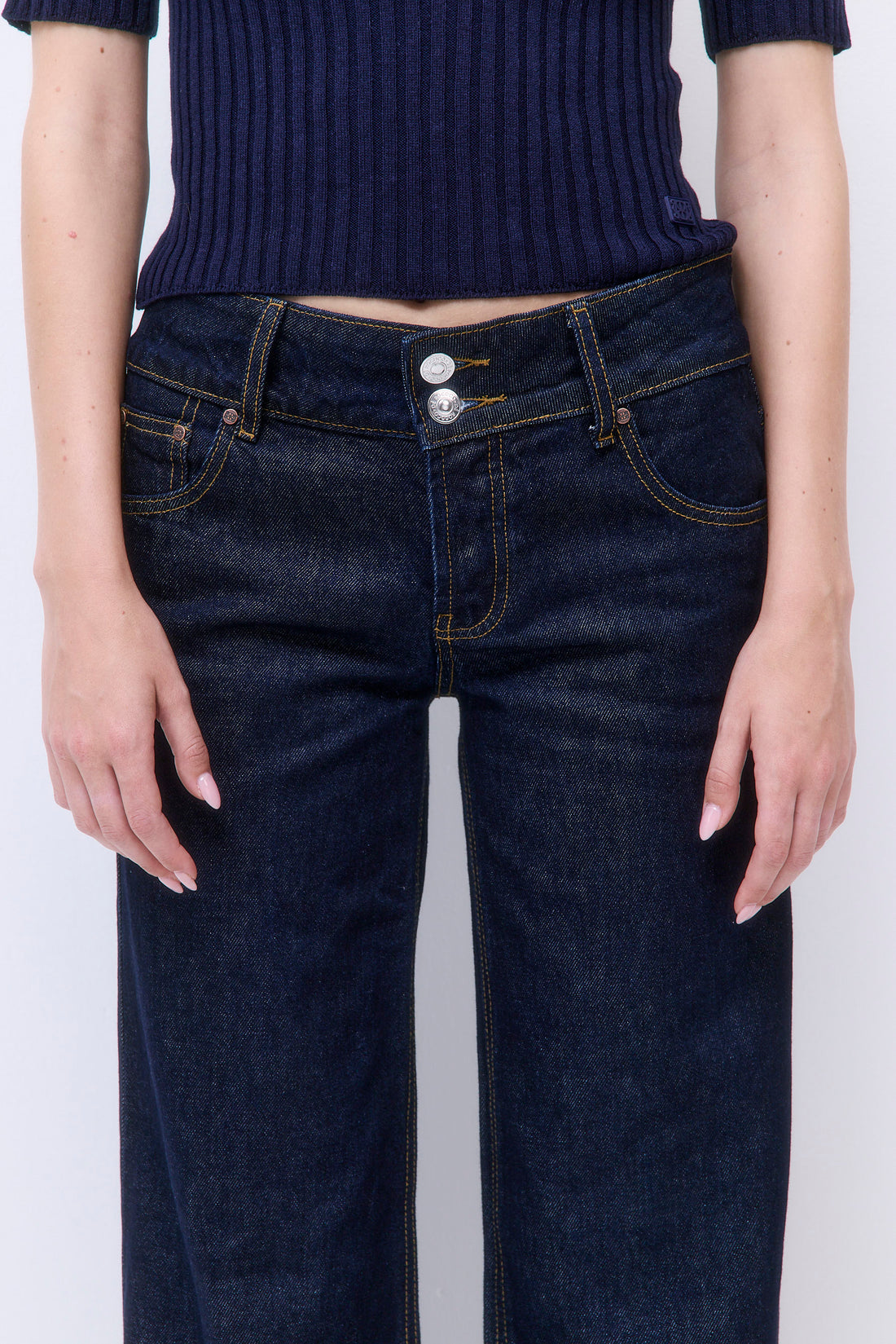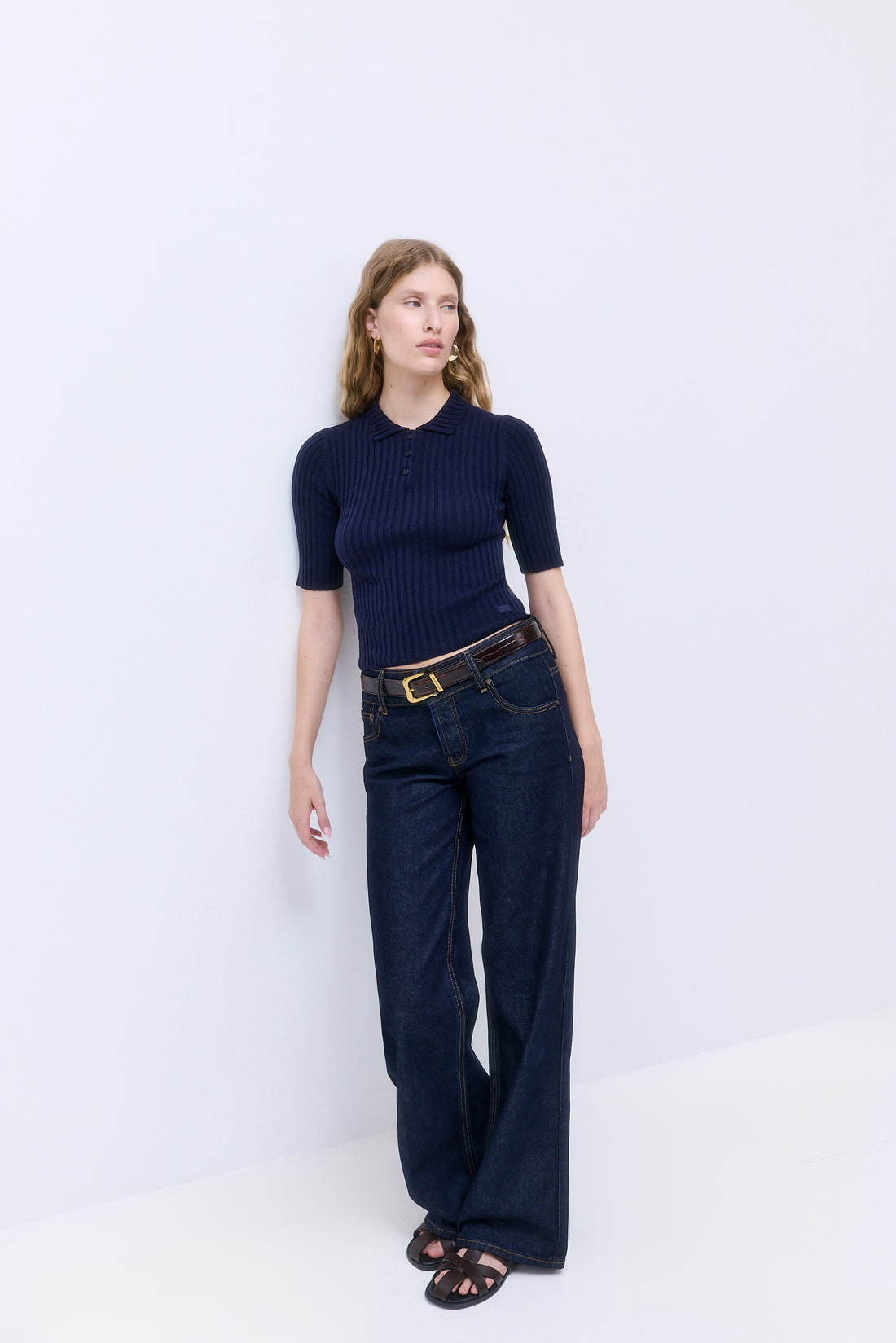 The newest addition to our iconic Denim collection. No.19 is a low-waist, wide leg denim that combines a timeless design with an effortless fit. Cut from a raw-wash fabric. Featuring a wide waistband with a double-button and zip closure, two front pockets, two back patch pockets, and a classic coin pocket. Detailed with metallic rivets. Refined with a contrasting embroidered logo, as well as an embossed leather patch on the back. Finished with our signature jean buttons. Style it with our sleek Oval Sunglasses and refined Sheer Polo Tee for the ultimate fall look.