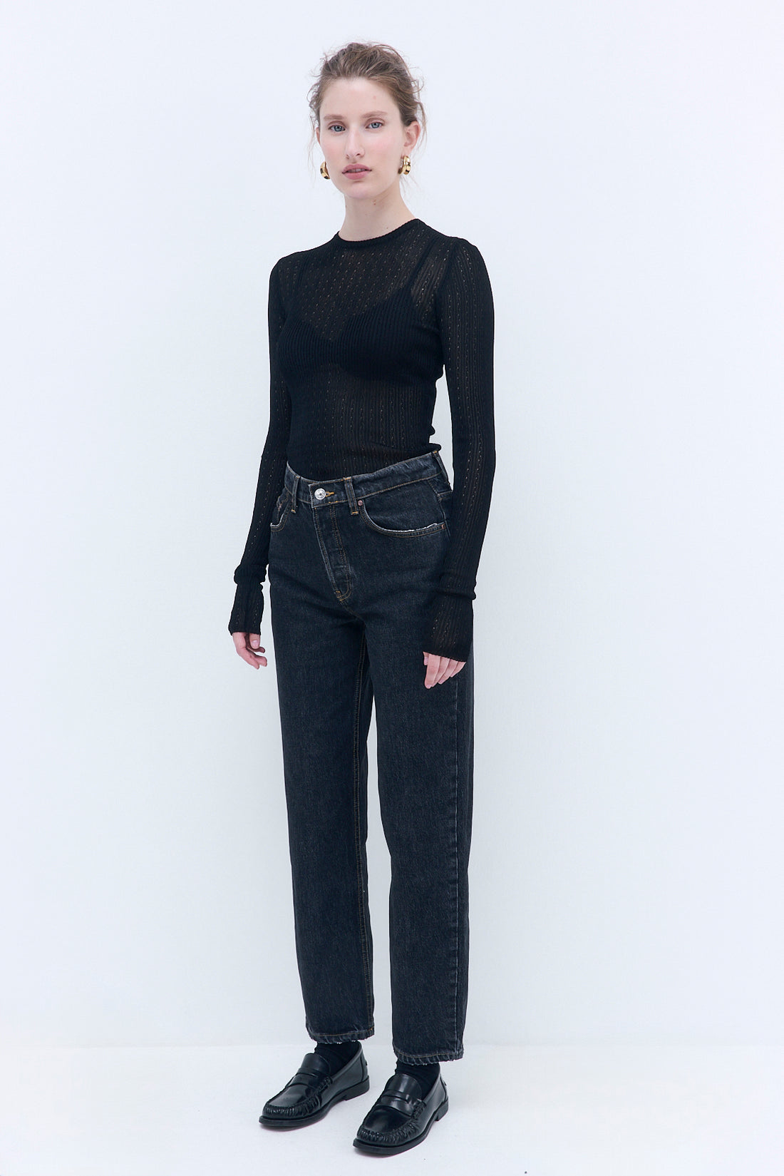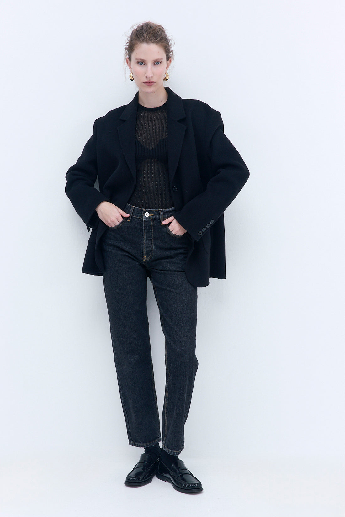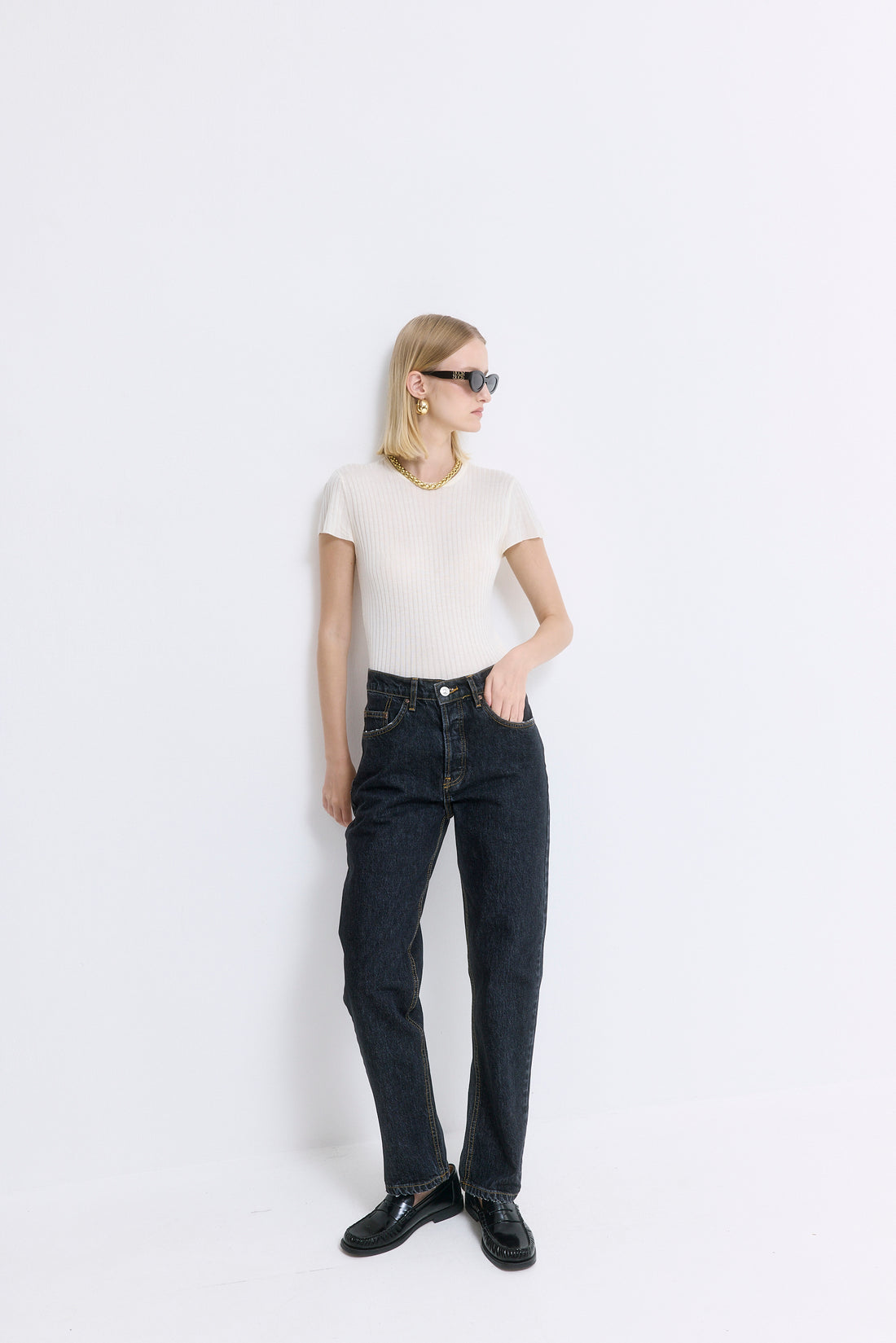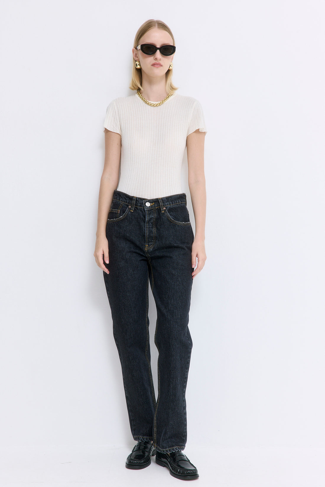 Our No.5 denim is a high waisted straight with a cropped fit. The perfect addition to your summer wardrobe. Front buttoned closure. Features a logo detail embroidered at the back pocket. Style it with your favorite crewneck and a pair of kitten heels.