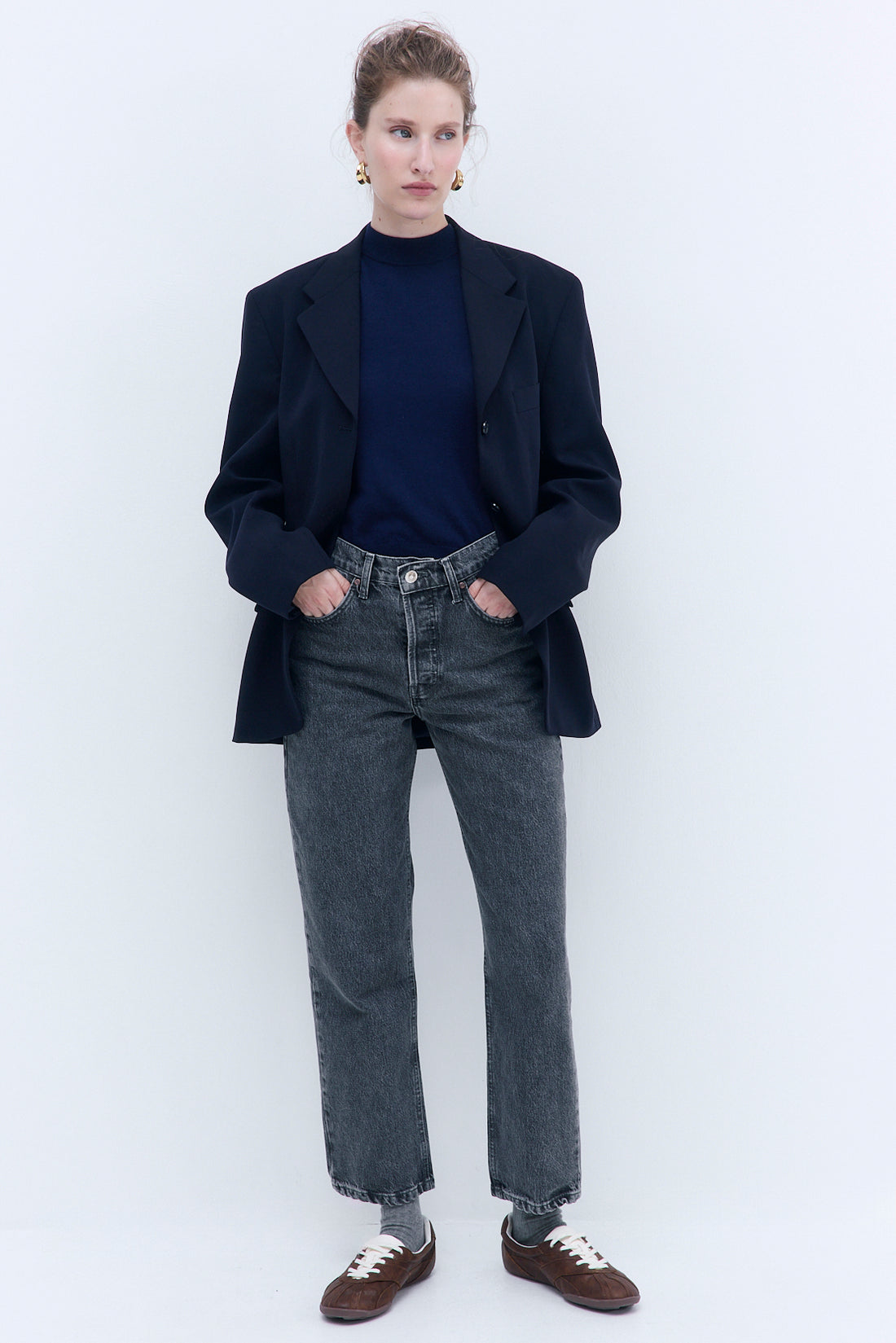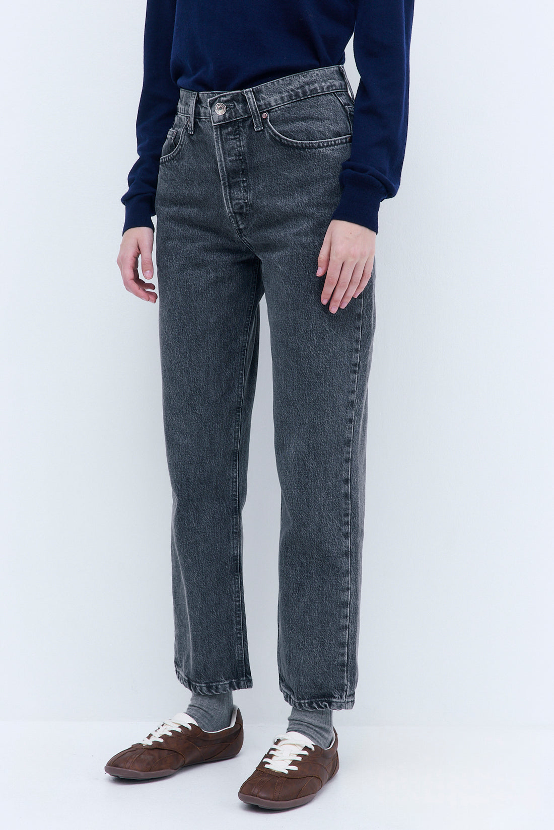 Our No.5 denim is a high waisted straight with a cropped fit. The perfect addition to your summer wardrobe. Front buttoned closure. Features a logo detail embroidered at the back pocket. Style it with your favorite crewneck and a pair of kitten heels.