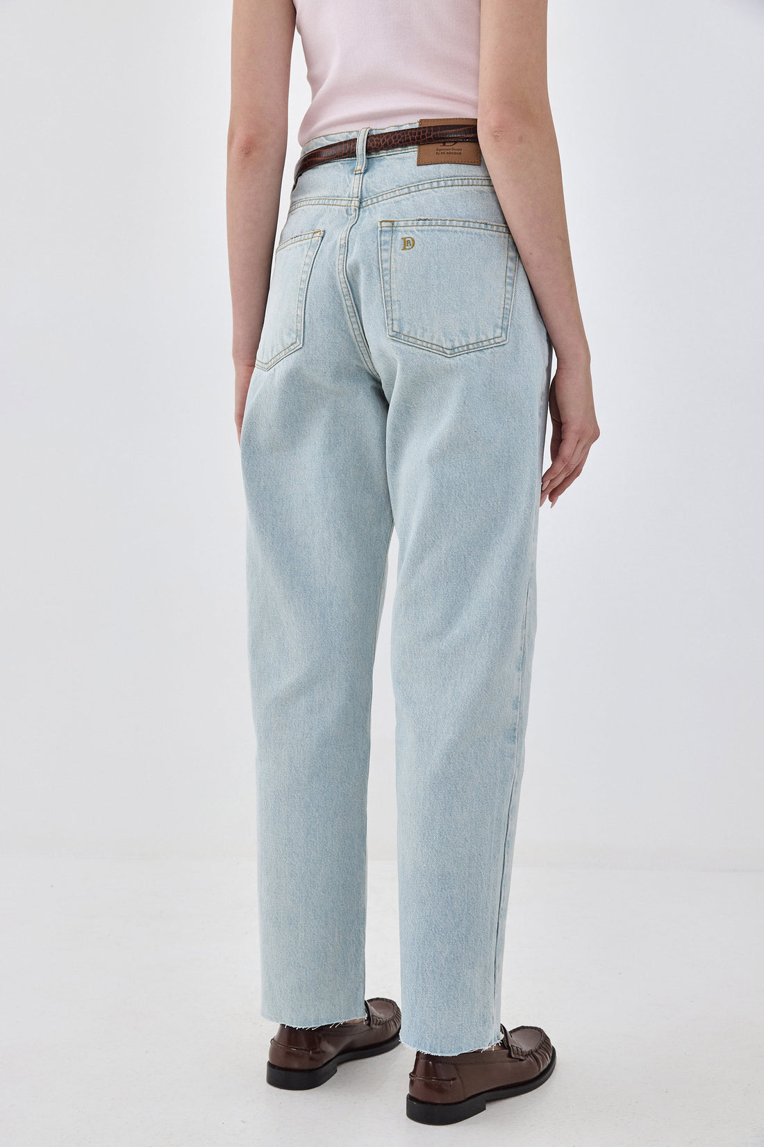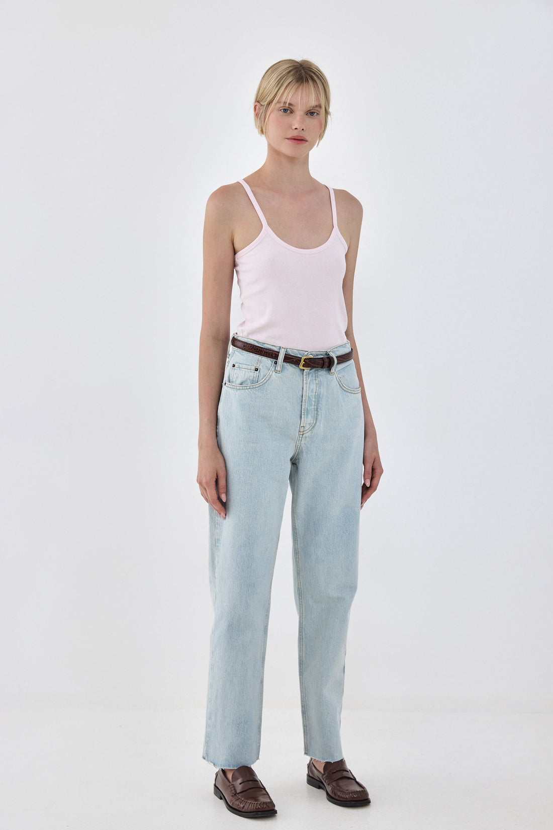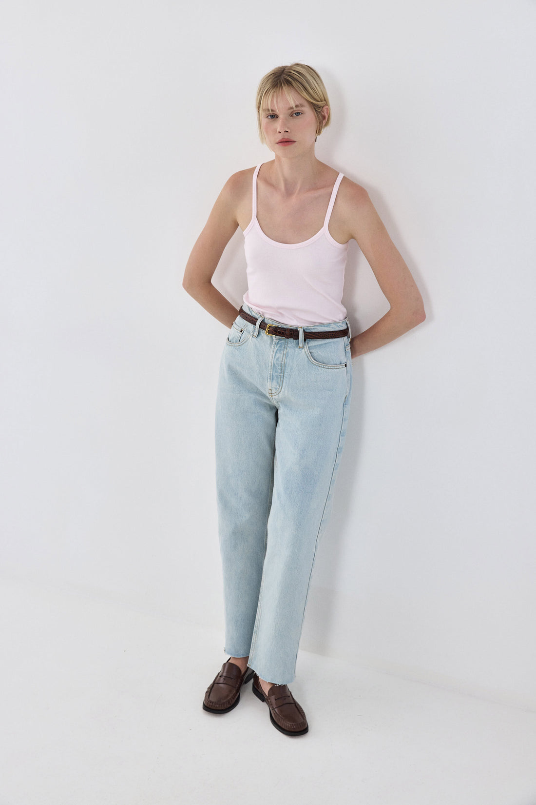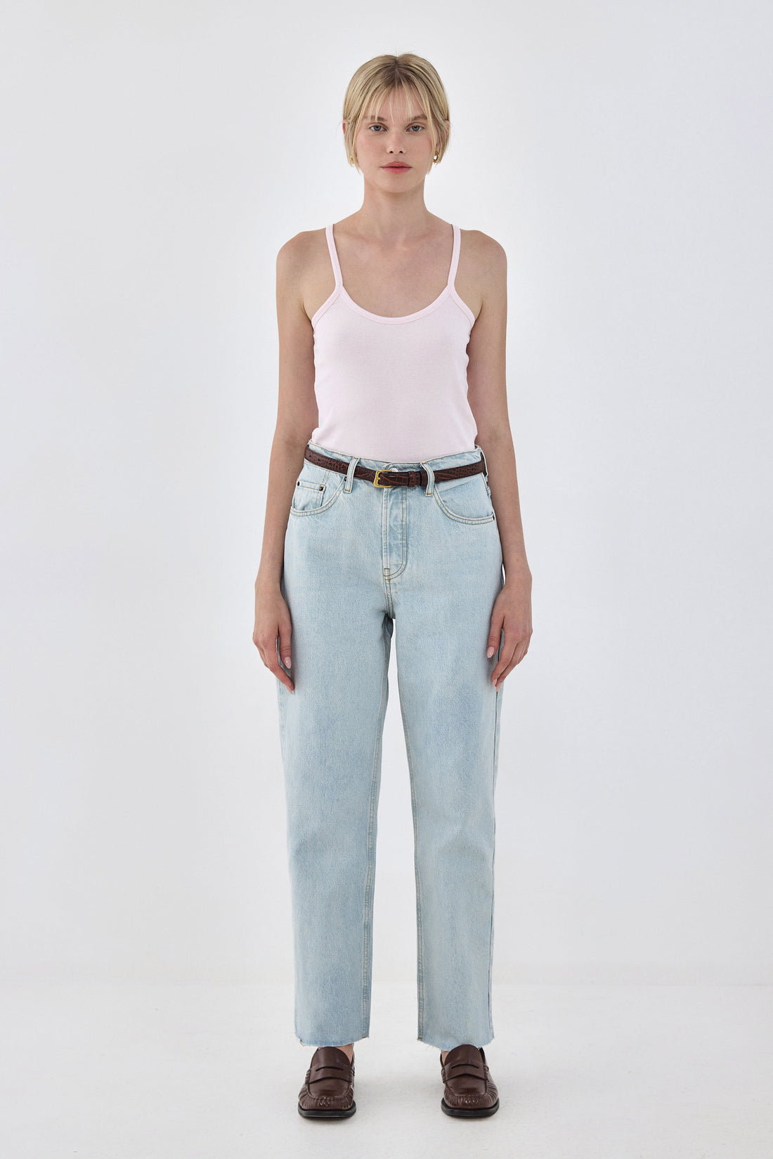 Our No.5 denim is a high waisted straight with a cropped fit. The perfect addition to your summer wardrobe. Front buttoned closure. Raw cut hemline. Features a logo detail embroidered at the back pocket. Style it with your favorite basic tank and a pair of sandals for an effortlessly chic look.