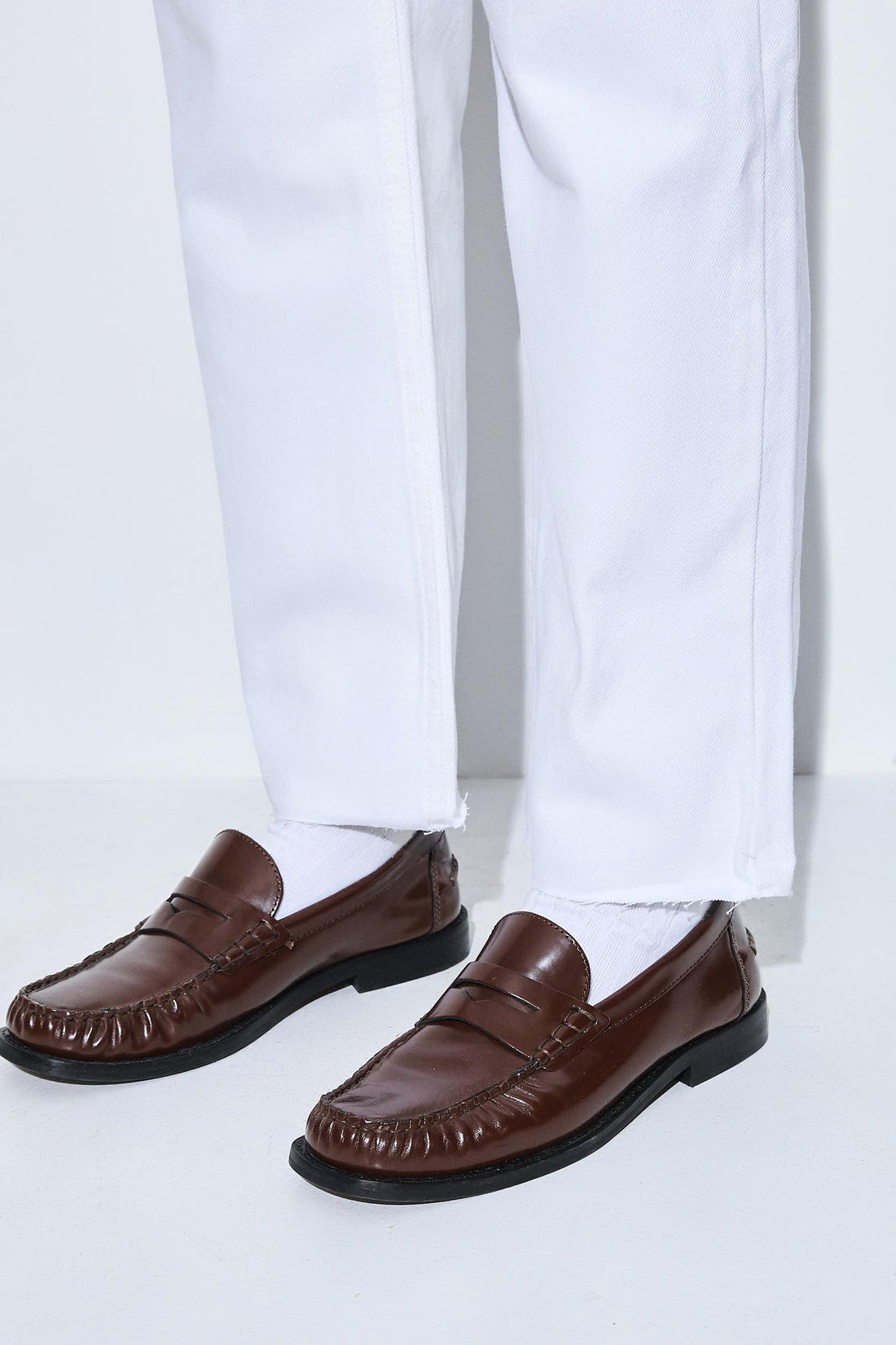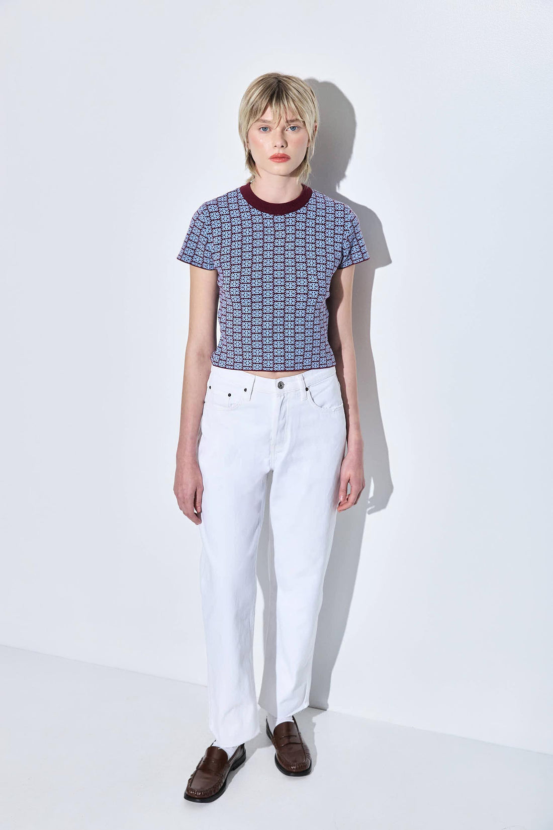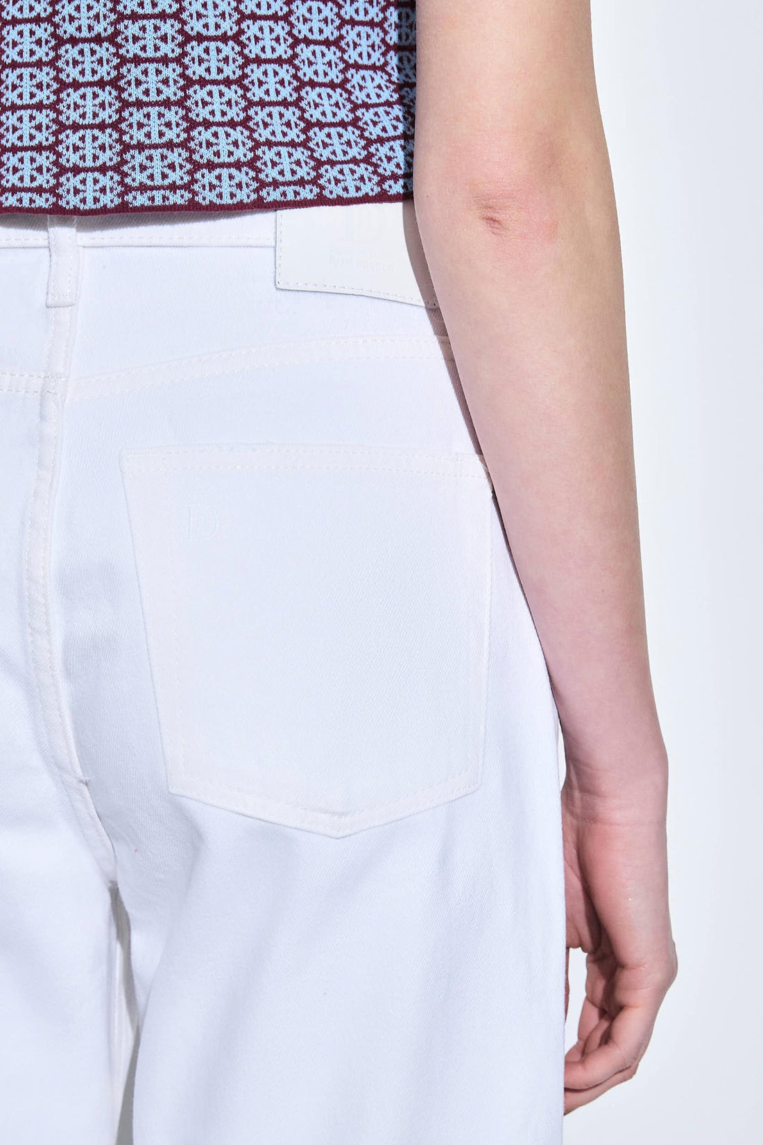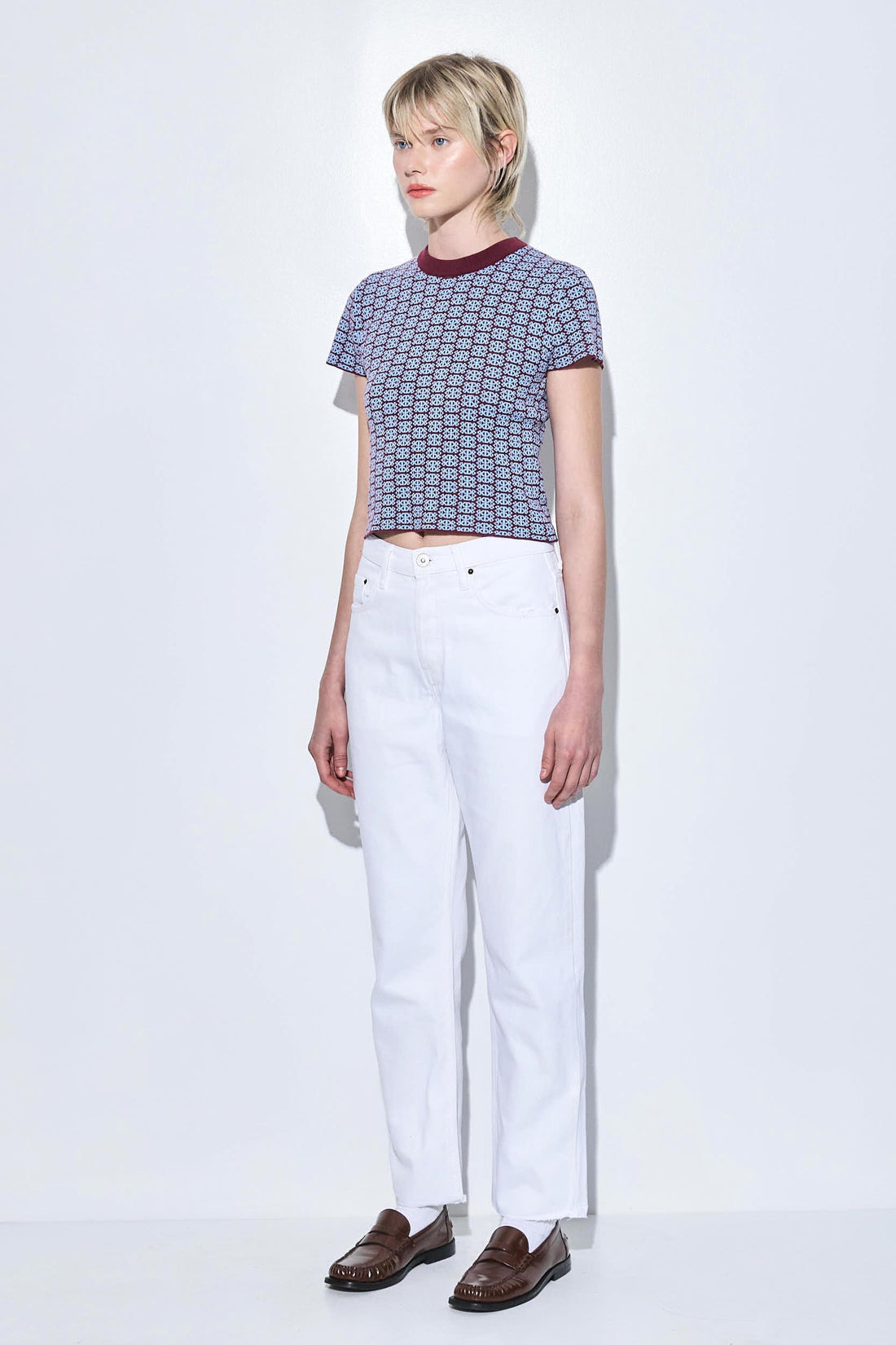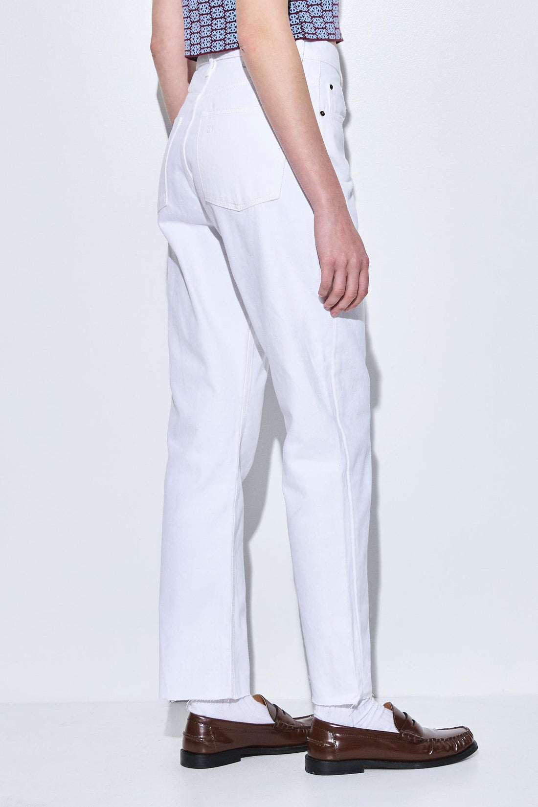 Our No.5 denim is a high waisted straight with a cropped fit. The perfect addition to your summer wardrobe. Front buttoned closure. Raw cut hemline. Features a logo detail embroidered at the back pocket. Style it with your favorite basic tank and a pair of sneakers.
