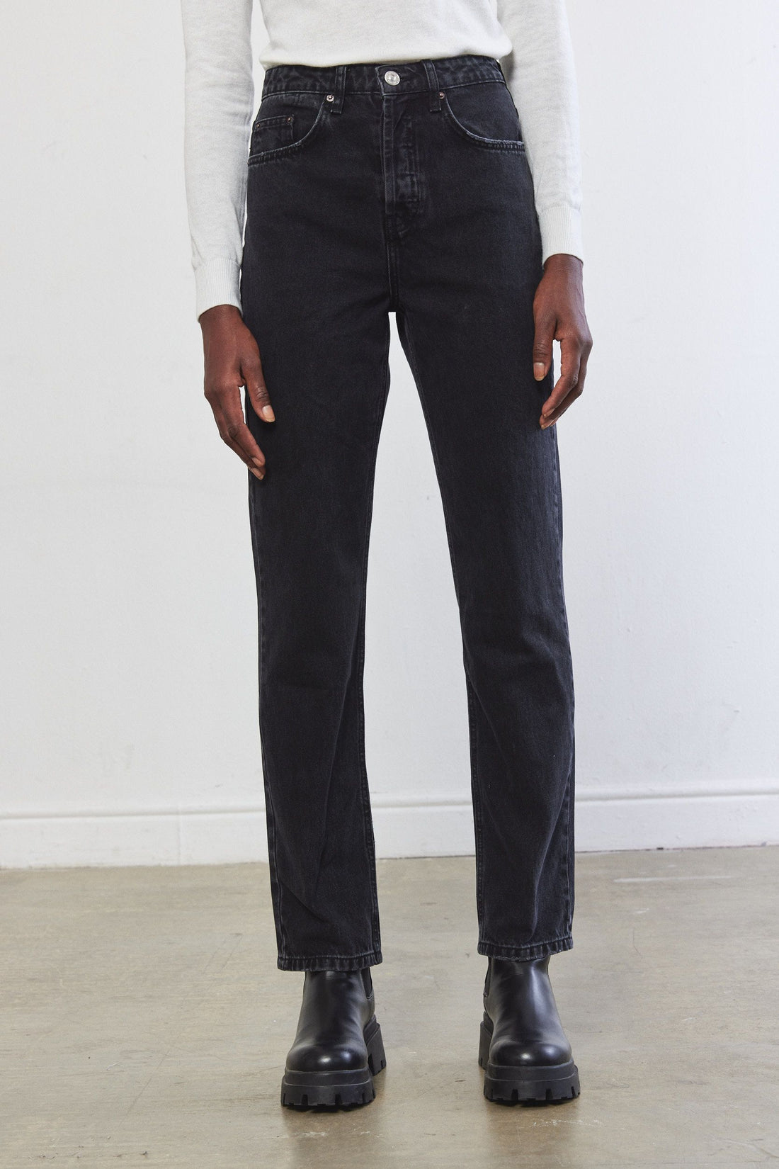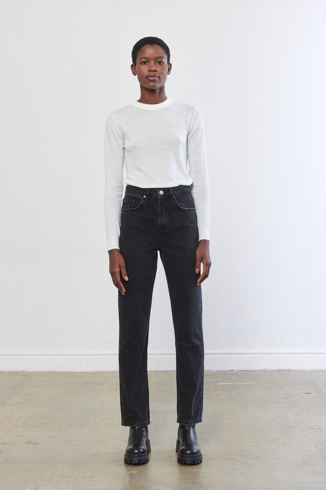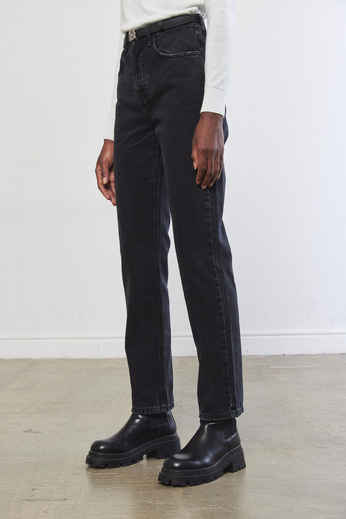 No.6 high waisted jeans features a straight full length fit. Front buttoned closure and back embroidered logo detail at pocket. Made from 100% thick cotton. Wear yours with anything from T shirts to chunky knits.