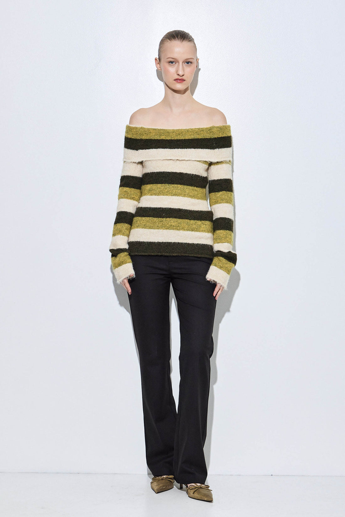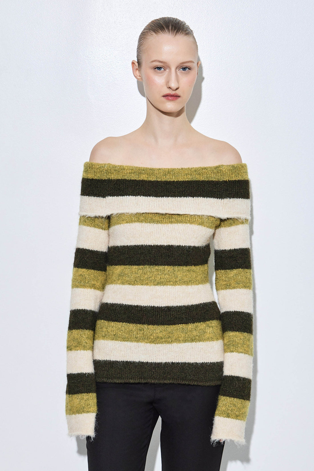 The newest addition to our Fuzzy collection. Our new off shoulder fuzzy sweater was made to elevate your day to night look. Fitted silhouette. Folded panel for a flattering and feminine look. Soft and cozy fabric. Clean finish. Style it with a pair of our flattering denim, our cool oval sunnies and throw our classic trench coat on top to seal this classy look.