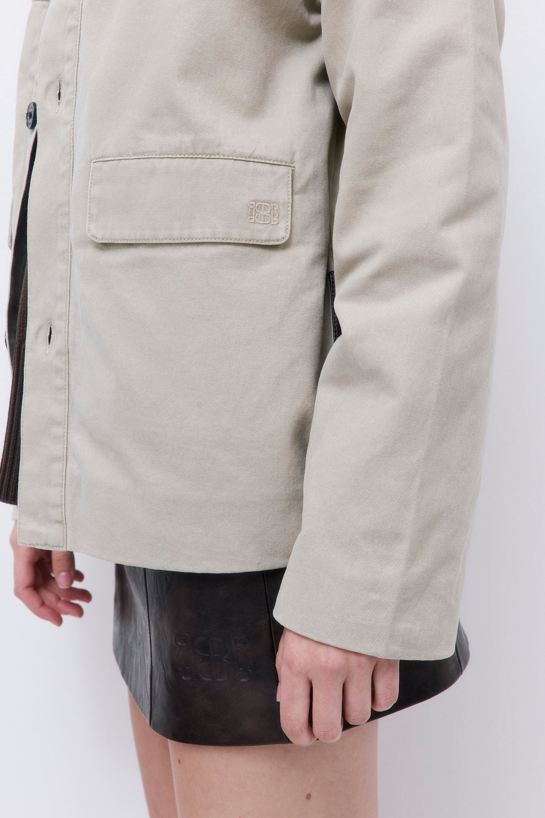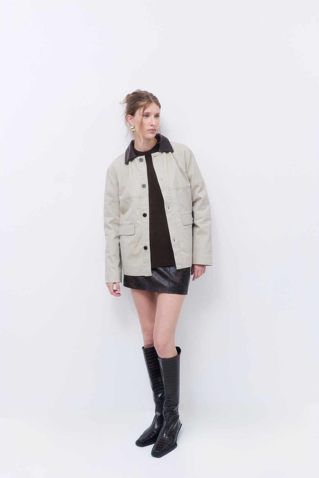 The kind of jacket that instantly pulls every look together. Oversized barn jacket with contrasting, chocolate brown genuine leather detailing at the collar and at the belt loops. Washed effect. Fully lined. Double flap welt pockets, and a back vent. Featuring double stitching along the sleeves and chest. Finished with contrasting, logo engraved buttons and embroidered logo on the pocket. Style it with our new, matching Washed Straight Pants and iconic Oval Sunglasses for the ultimate monochromatic look.