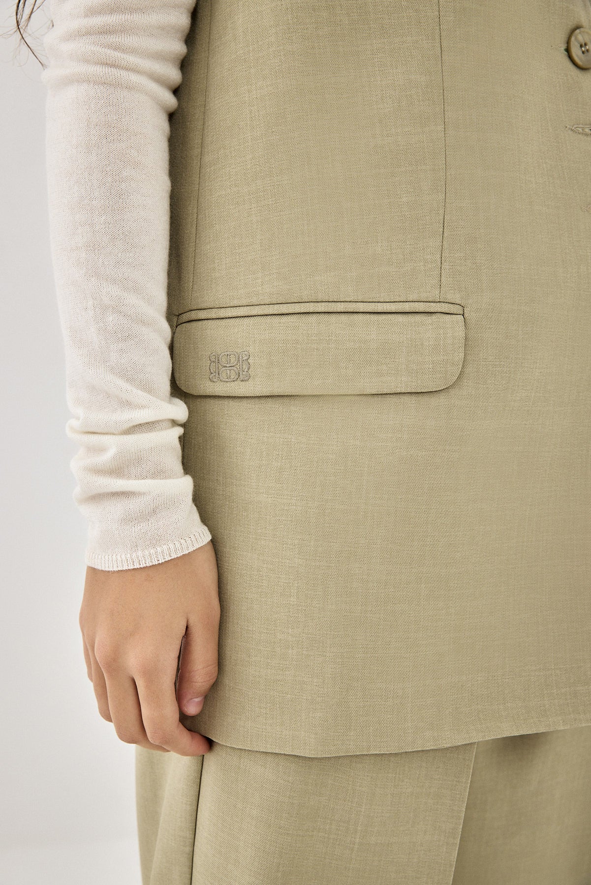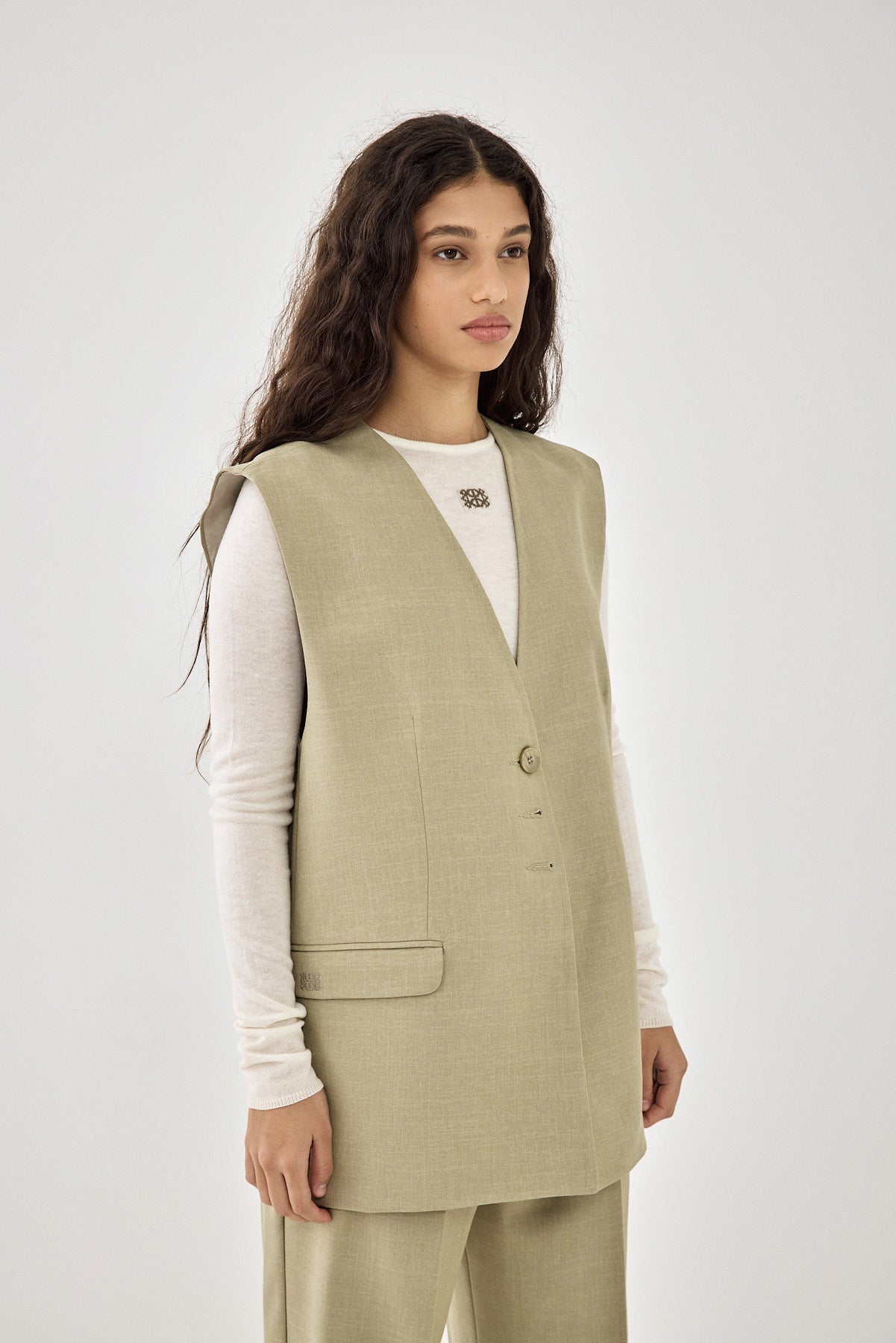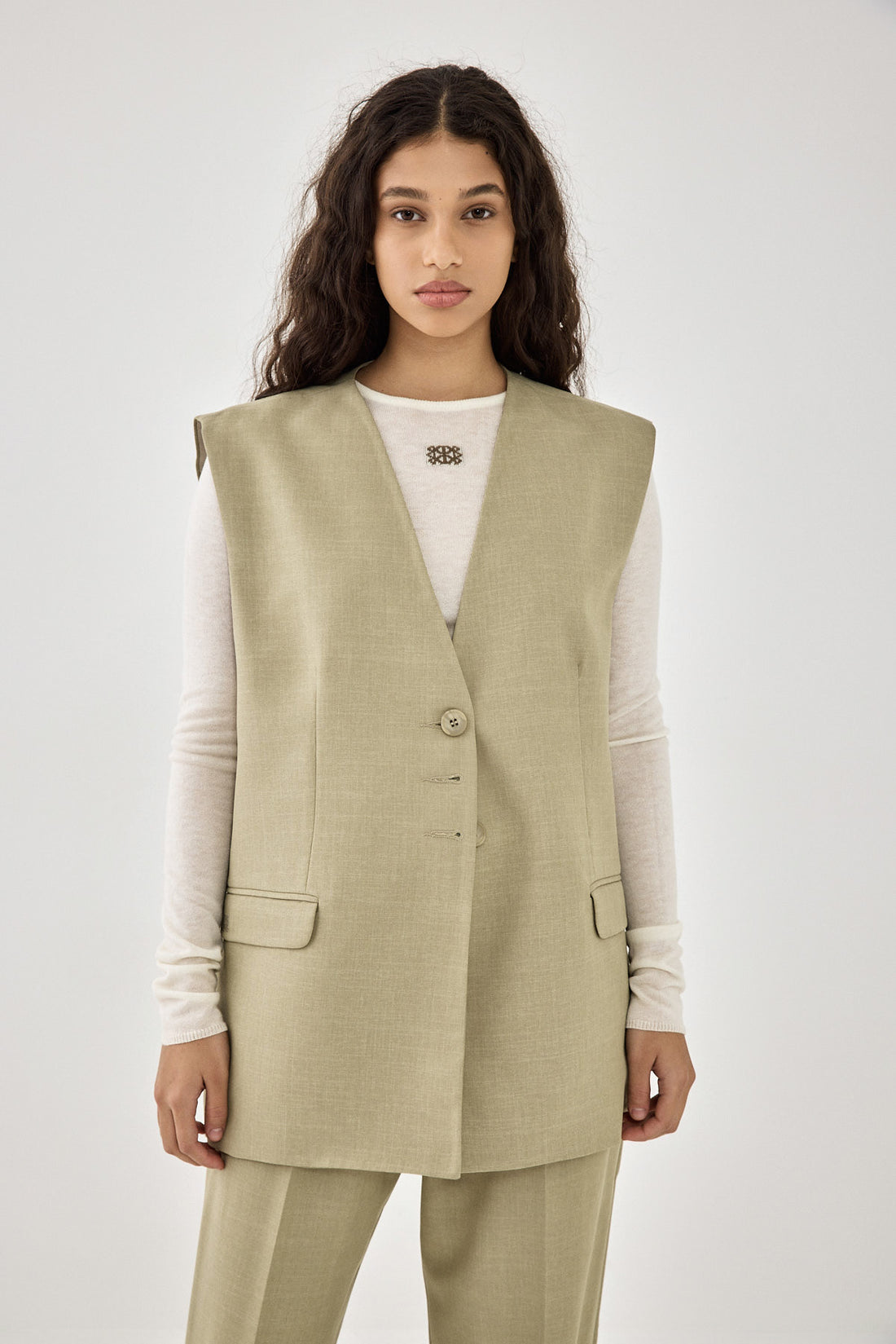 Oversized tailored vest made from our signature daddy collection. Features front button closure. Slightly accentuated shoulders. Double lined. Two faux welt pockets with a satin lining for smooth layering. Style it with your favorite daddy bottoms, and add a kick with a playful flat for the perfect everyday look.