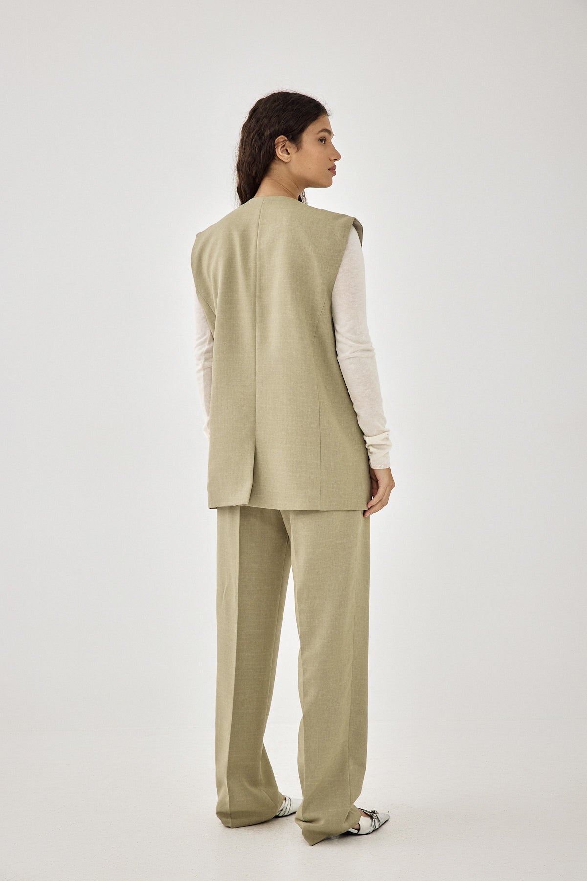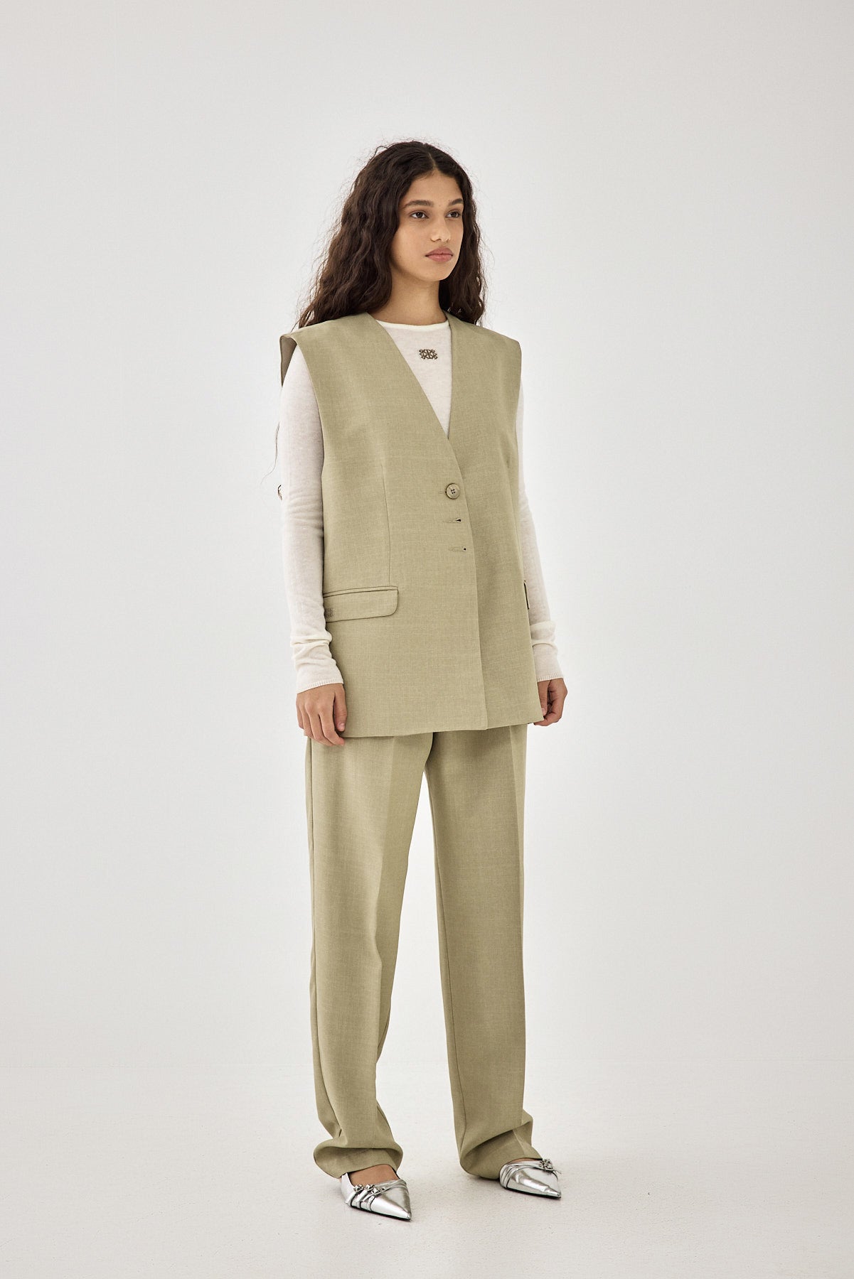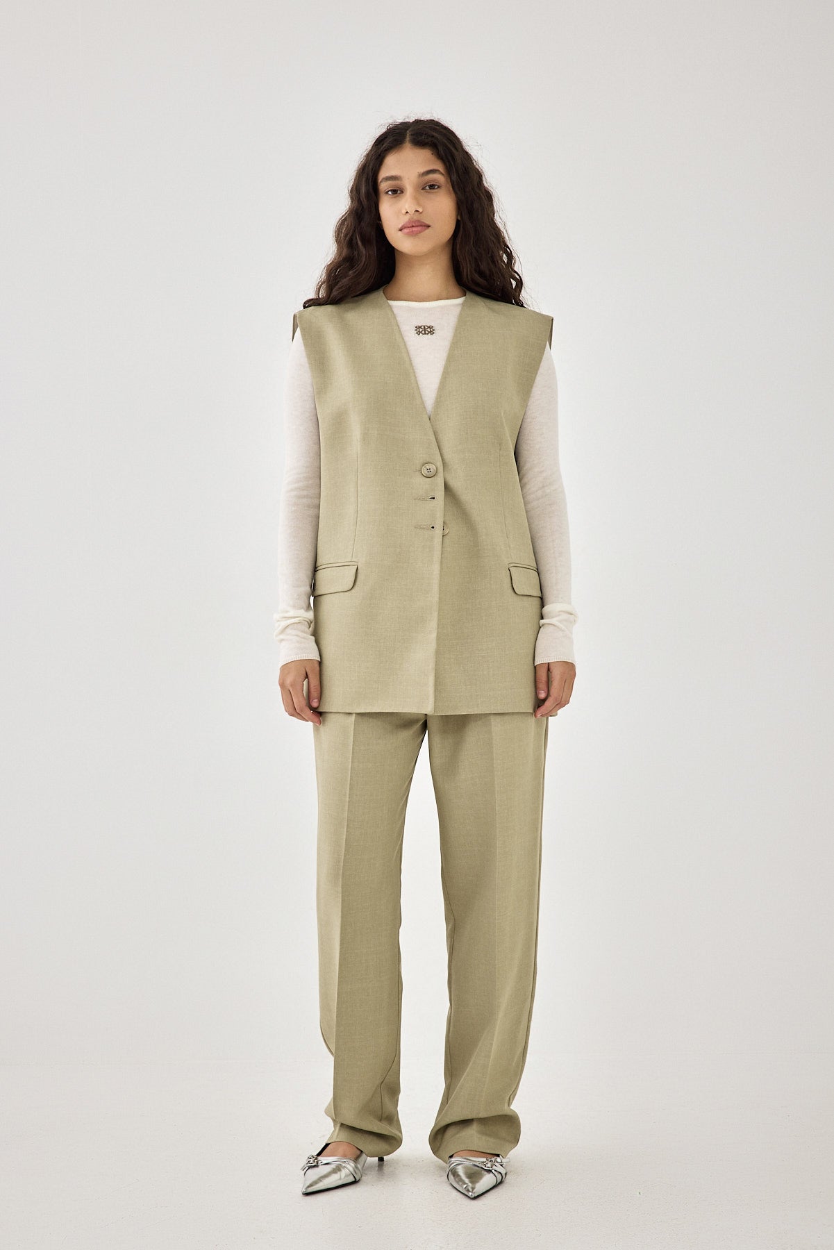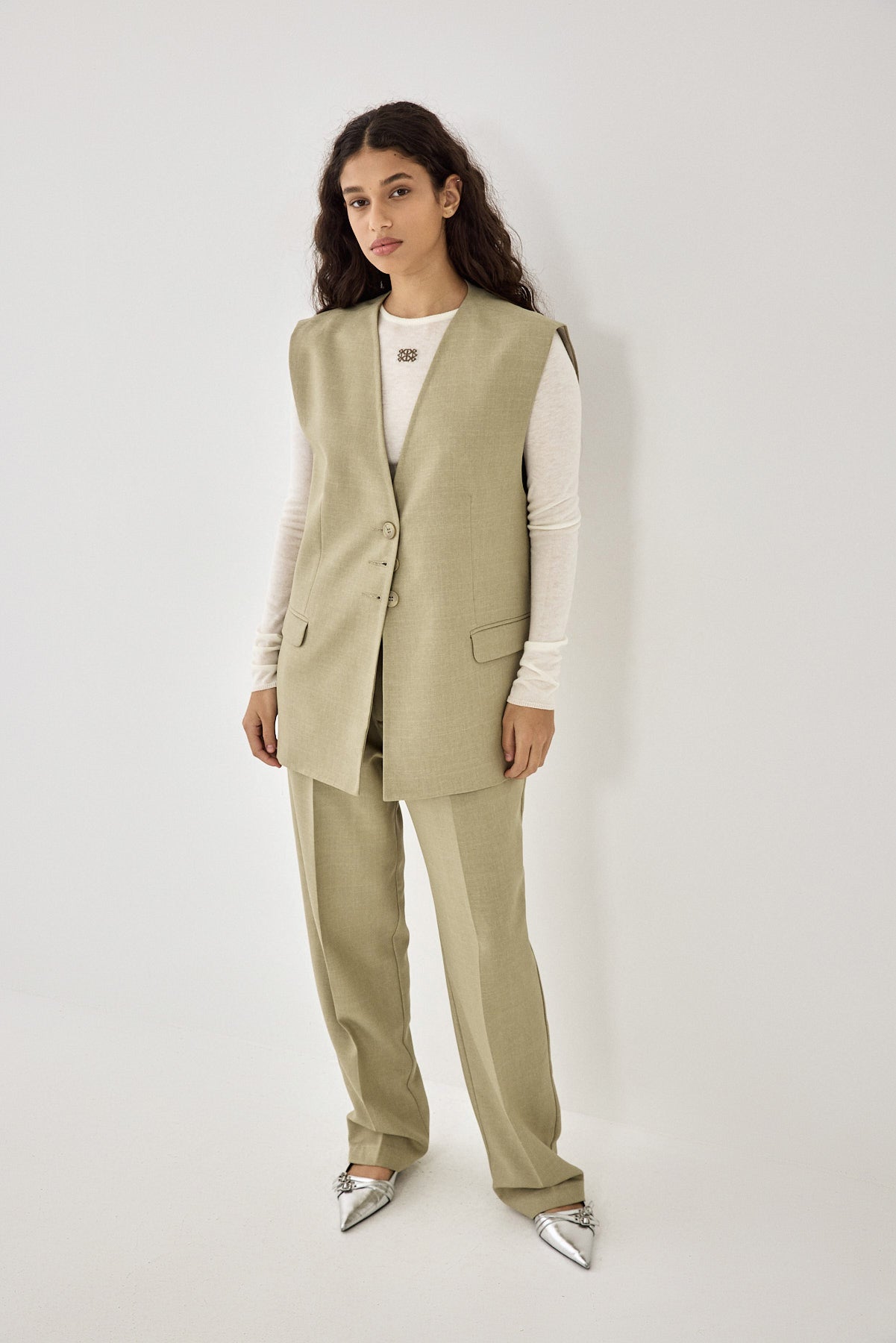 Oversized tailored vest made from our signature daddy collection. Features front button closure. Slightly accentuated shoulders. Double lined. Two faux welt pockets with a satin lining for smooth layering. Style it with your favorite daddy bottoms, and add a kick with a playful flat for the perfect everyday look.