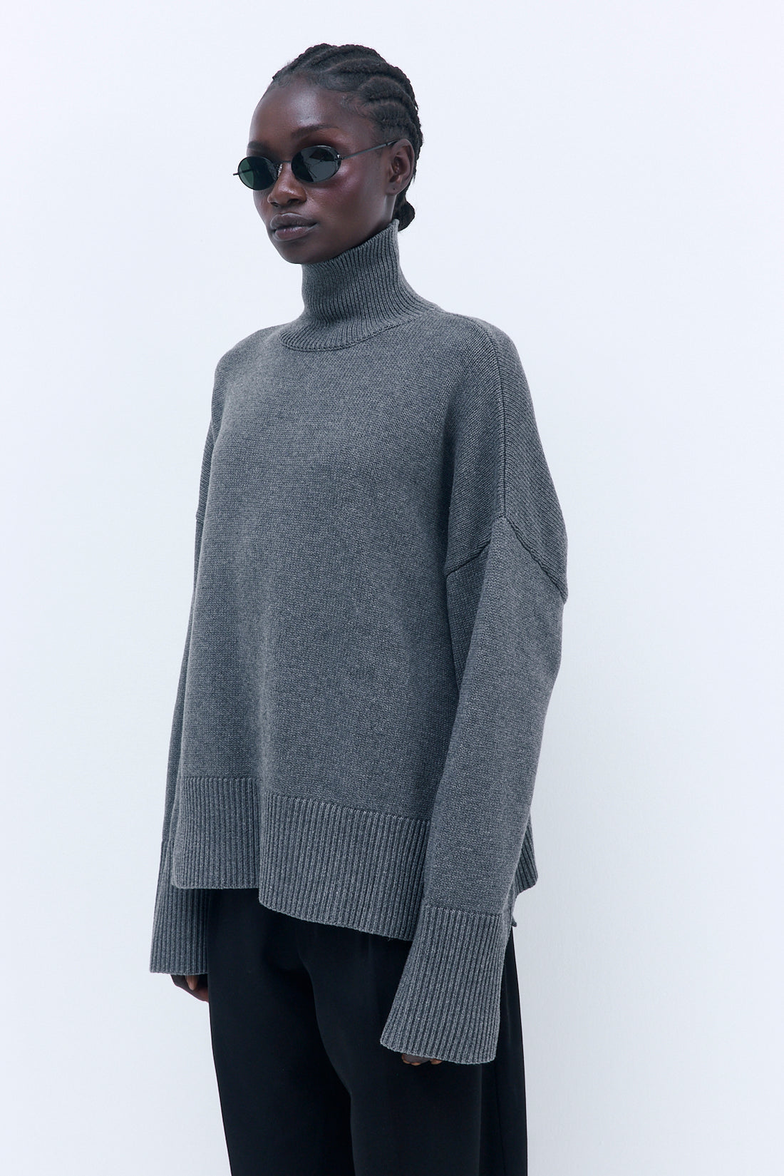 The perfect cozy winter essential. Turtleneck. Oversized fit. Slits on the side. Dropped shoulders. Wide rib hem. Tonal silicon logo on the back. Fully fashioned. Style it with our with our chic Sheer Midi Skirt and pair these with our iconic Yvon Shoulder Bag for an effortless everyday look.