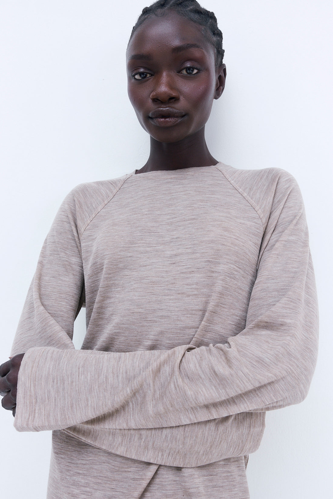 When effortless comfort meets everyday style. Featuring soft, cloud-like fabric. Crew neck. Oversized fit. Long, raglan sleeves that flare out a bit. Seam detailing along the center back. Featuring a tonal embroidered logo at the front. Layer it with our iconic Oversized Crew Neck Jumper and timeless Stretchy Bootcut Pants for the ultimate everyday, cozy look.