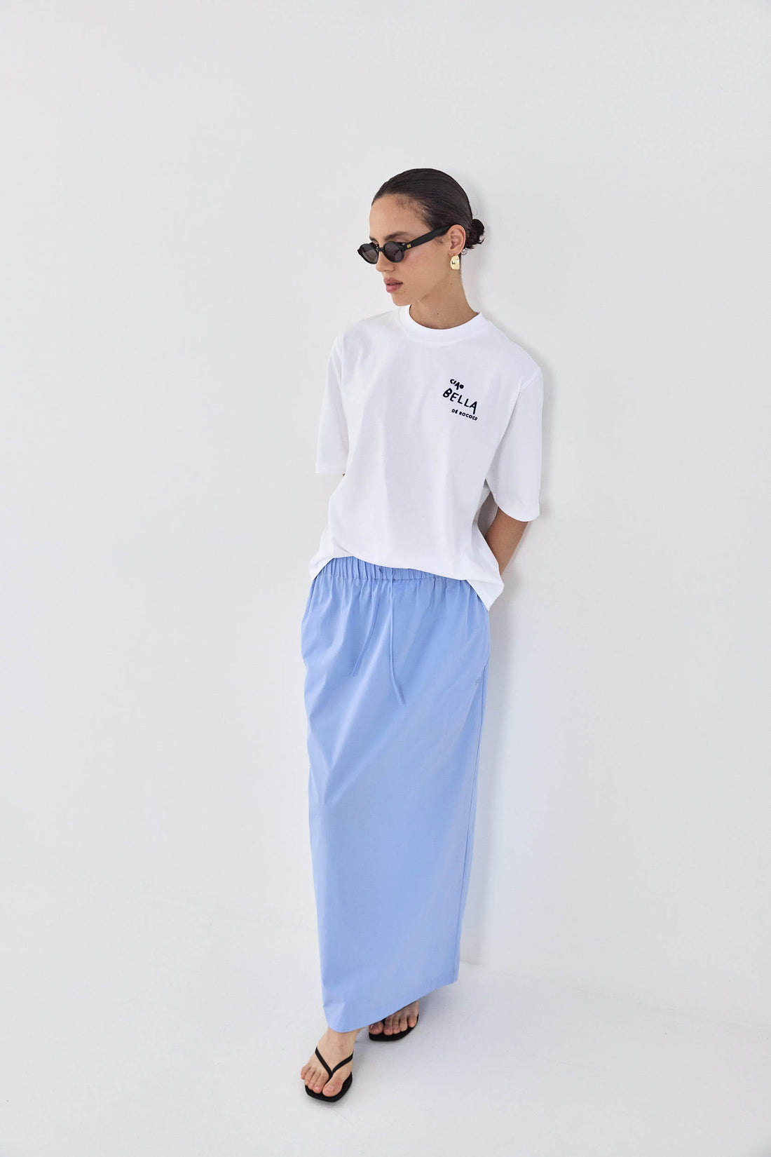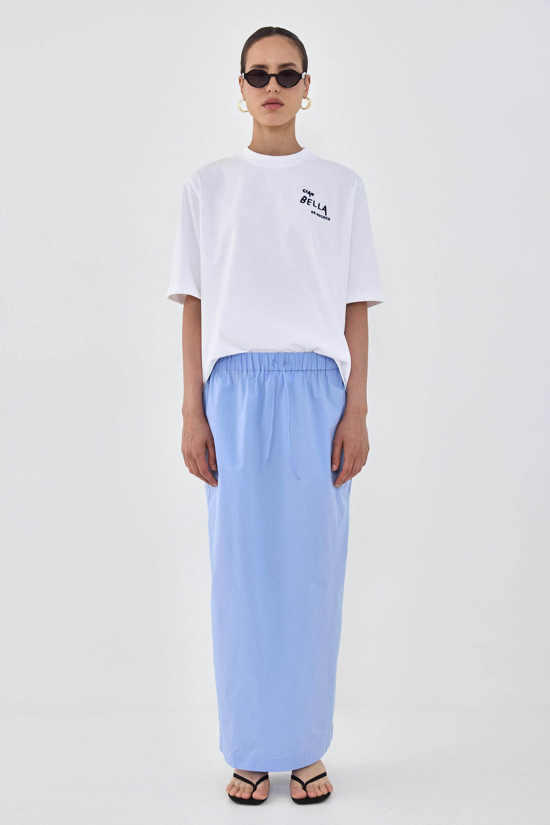 Poplin is this season's most fashionable fabric. A maxi skirt from crispy poplin fabric is an absolute summer wardrobe essential. Low rise. Straight silhouette featuring gathering detailing at the waistline. Elastic waistband with an ultra thin drawstring closure. Maxi length. Back slit. Delicate logo embroidery detailing. Style it with your favorite deep scooped tank top in a matching tone on tone, natural colored sandals and a large tote bag for a look that's hard to compete.