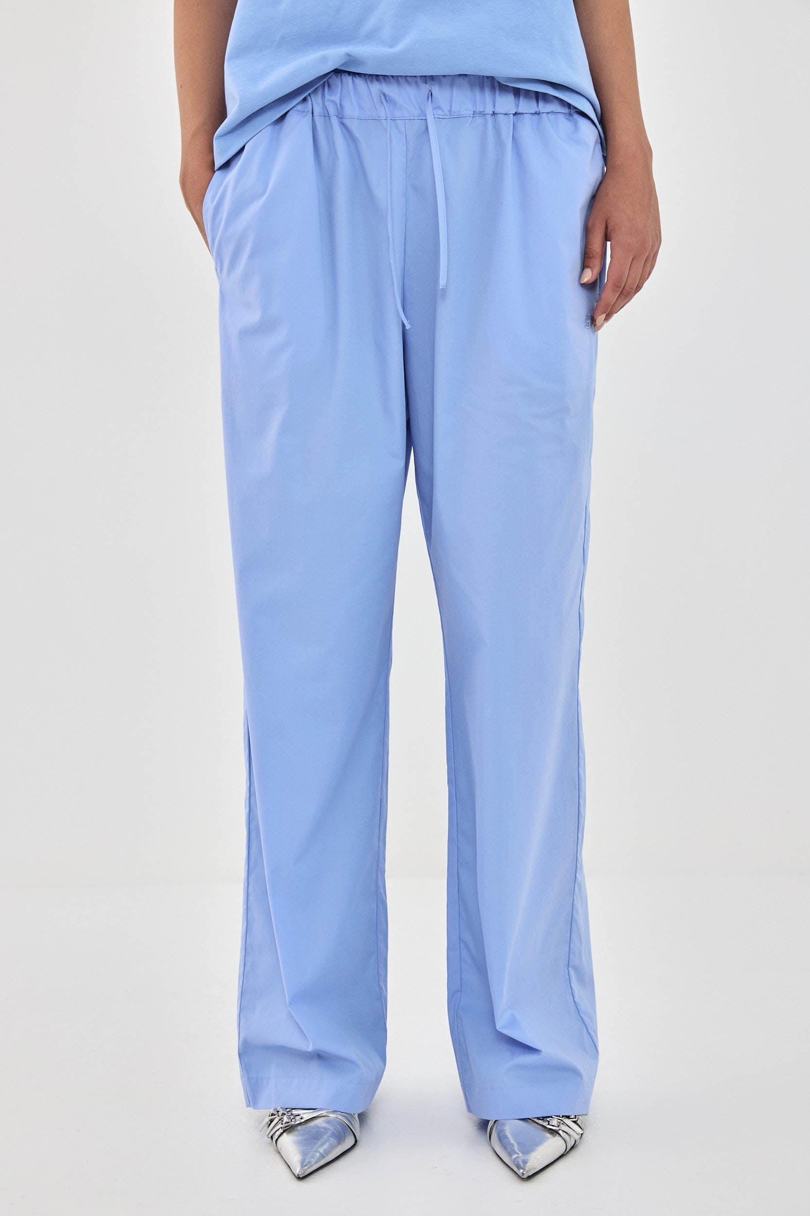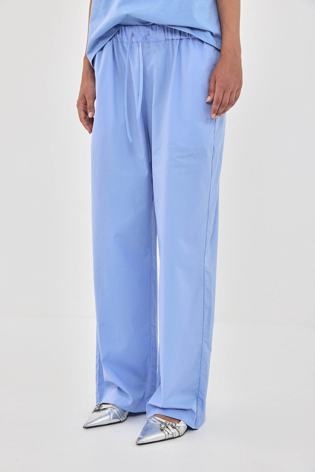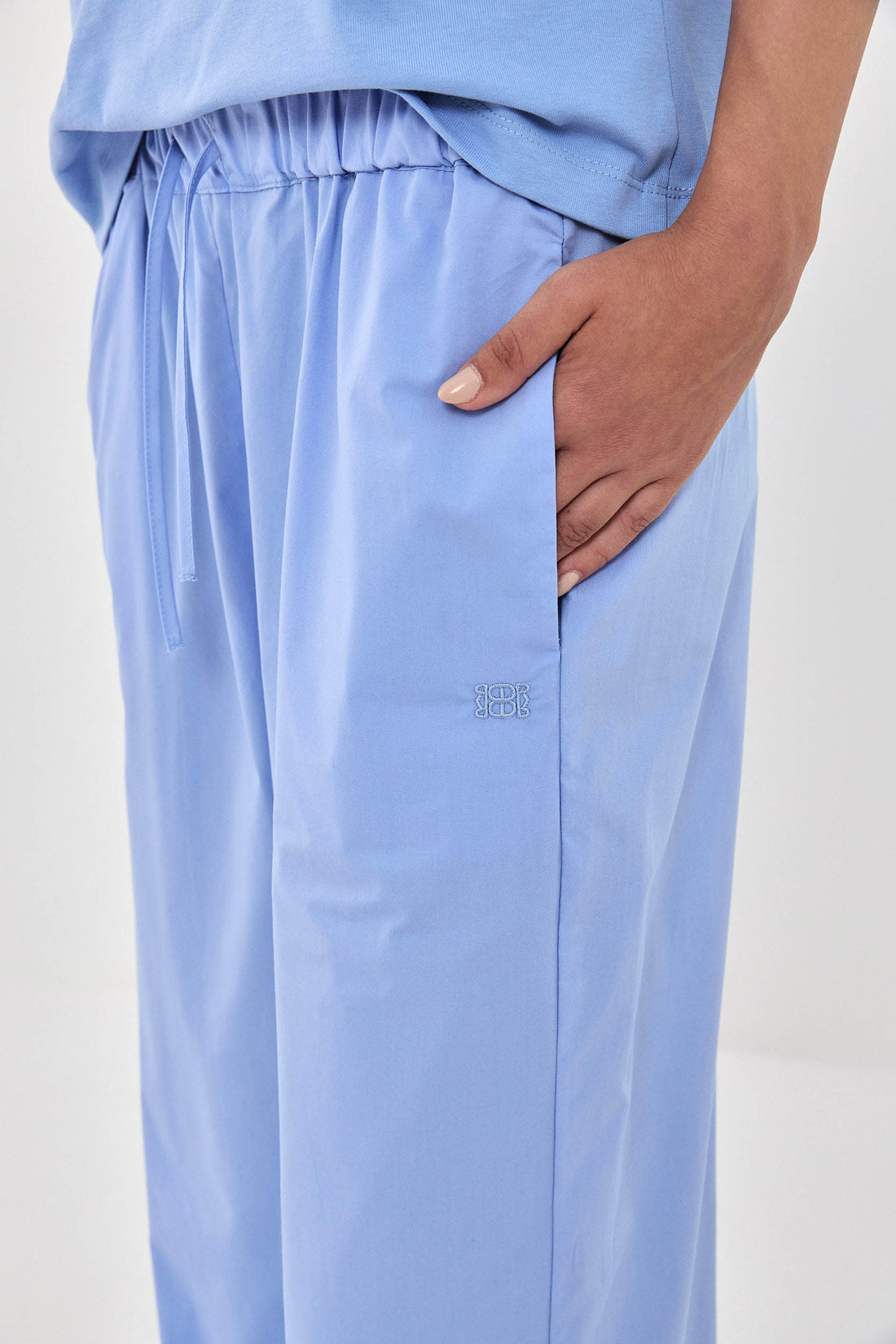 Poplin is this season's most fashionable fabric. There's nothing better than a pair of crispy, stylish long pants for summer in a perfect silhouette. Low rise long pants. Elastic waistband featuring an ultra thin drawstring closure. Two side pockets. Delicate logo embroidery detailing. Wide legged fit. Style it with a white tank top, and your favorite button down unbuttoned and add natural elements such as hints of Rattan, woven elements and golden accents, to tie the look together.