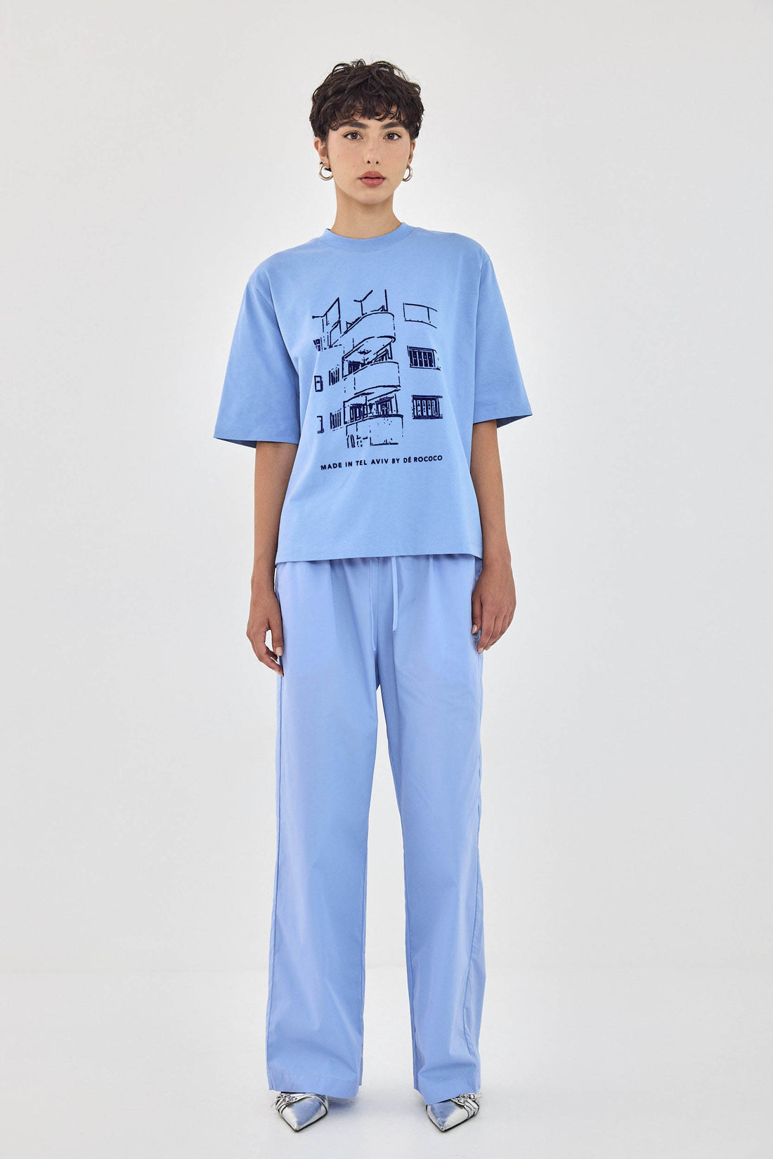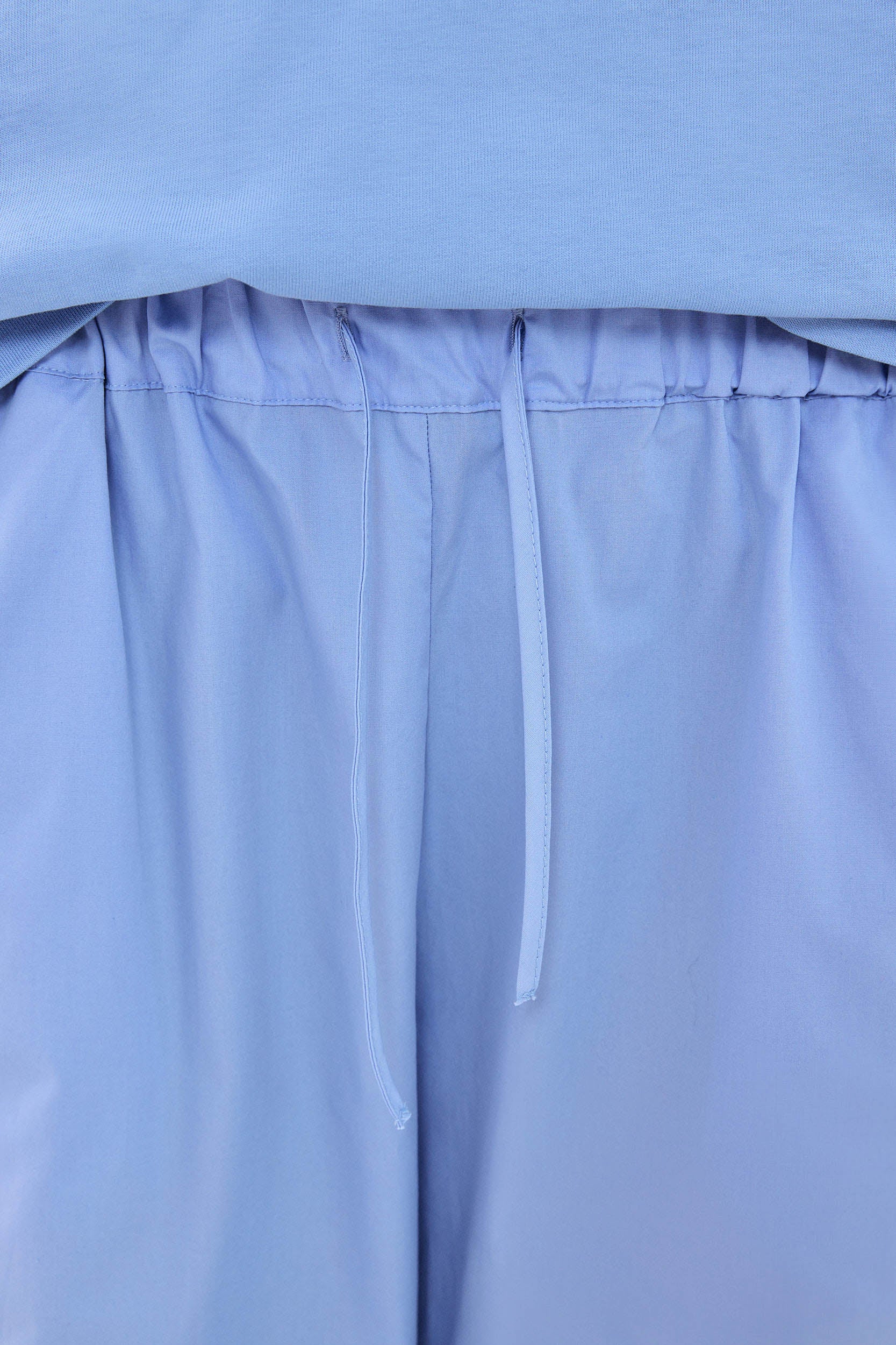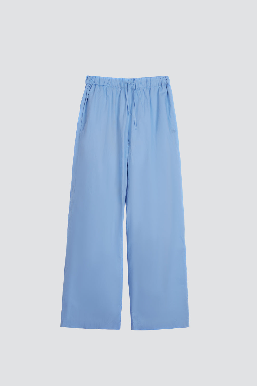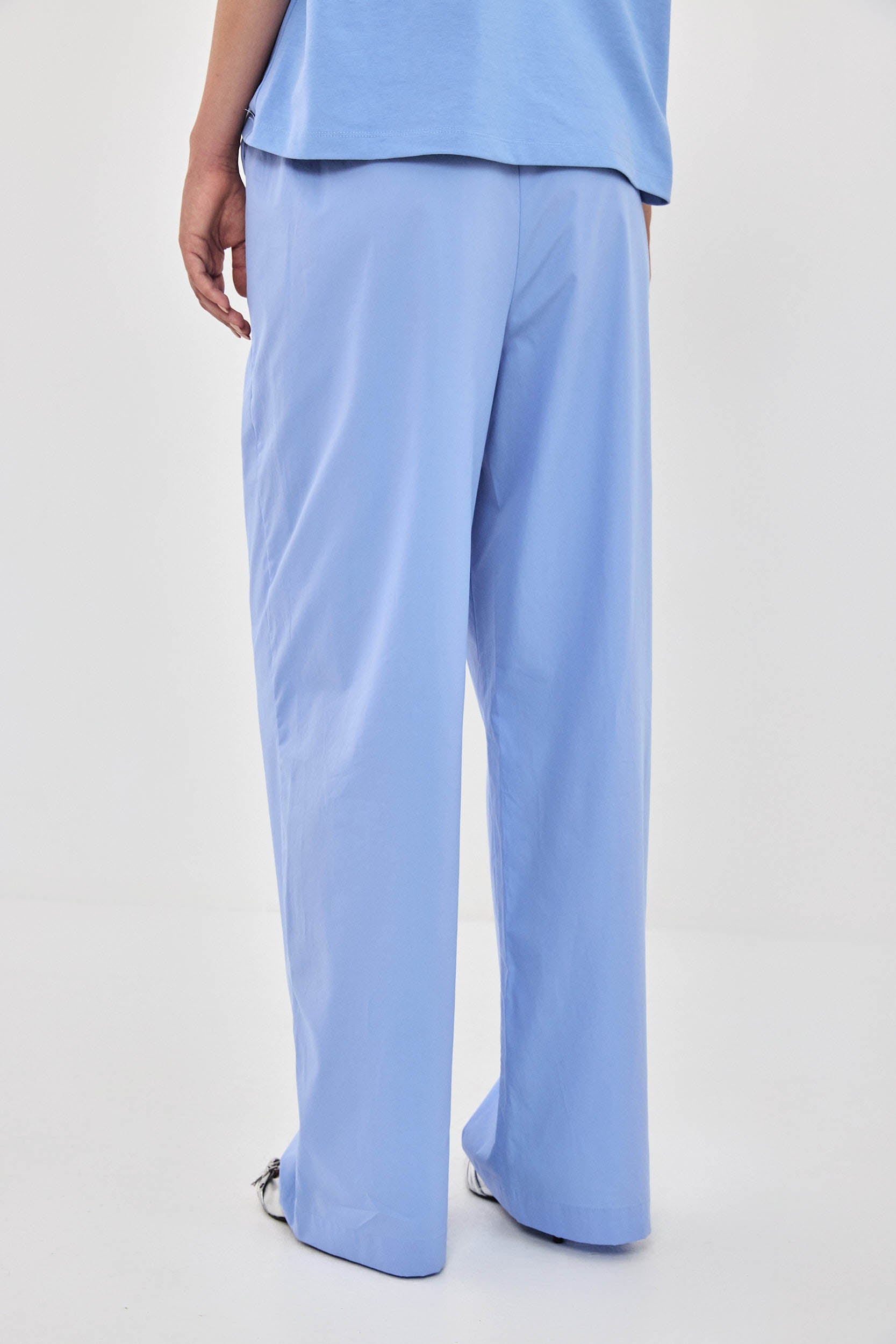 Poplin is this season's most fashionable fabric. There's nothing better than a pair of crispy, stylish long pants for summer in a perfect silhouette. Low rise long pants. Elastic waistband featuring an ultra thin drawstring closure. Two side pockets. Delicate logo embroidery detailing. Wide legged fit. Style it with a white tank top, and your favorite button down unbuttoned and add natural elements such as hints of Rattan, woven elements and golden accents, to tie the look together.