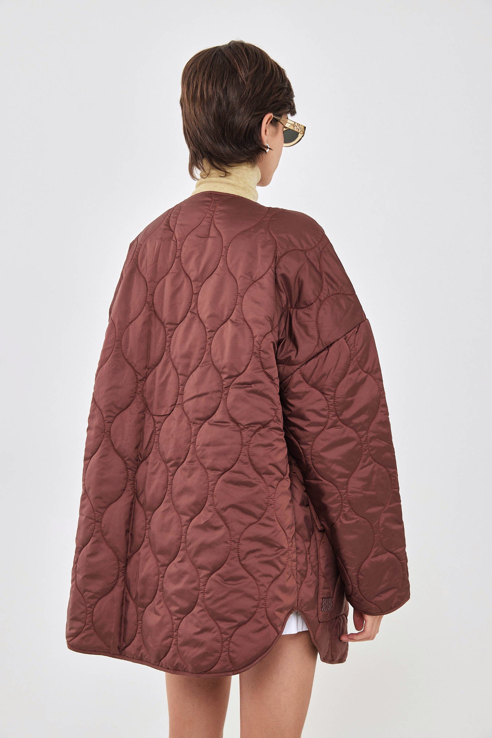 An ultra-chic addition to your fall-winter wardrobe. Quilted lightweight coat. Onion quilt pattern. Unlined. Features engraved snap buttons closure. Two front pockets with a snap button closure. Luxurious tonal metal logo placed on the side pocket. Style it over your favorite De fitnéss club active set, a pair of our oval sunnies and our matching quilted clutch for a chic everyday look.