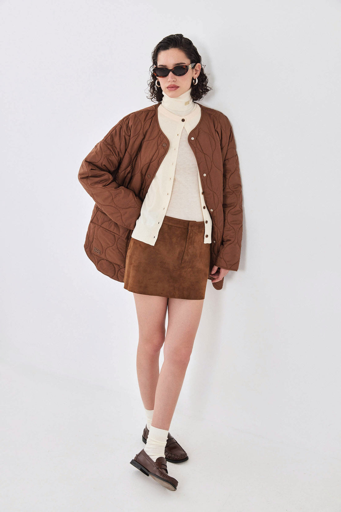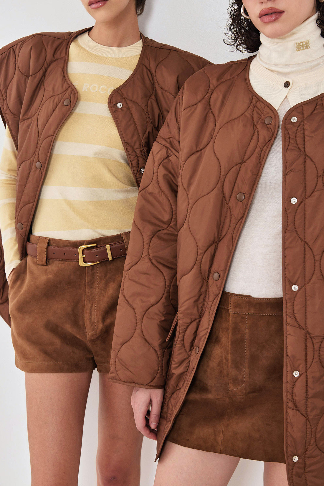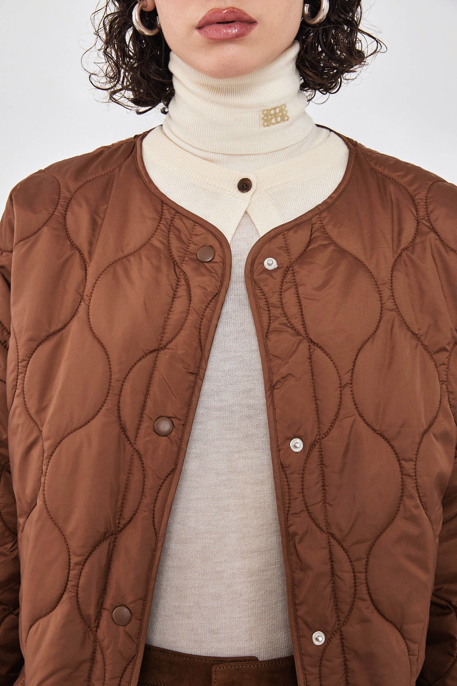 An ultra-chic addition to your fall-winter wardrobe. Quilted lightweight coat. Onion quilt pattern. Unlined. Features engraved snap buttons closure. Two front pockets with a snap button closure. Luxurious tonal metal logo placed on the side pocket. Style it over your favorite De fitnéss club active set, a pair of our oval sunnies and our matching quilted clutch for a chic everyday look.