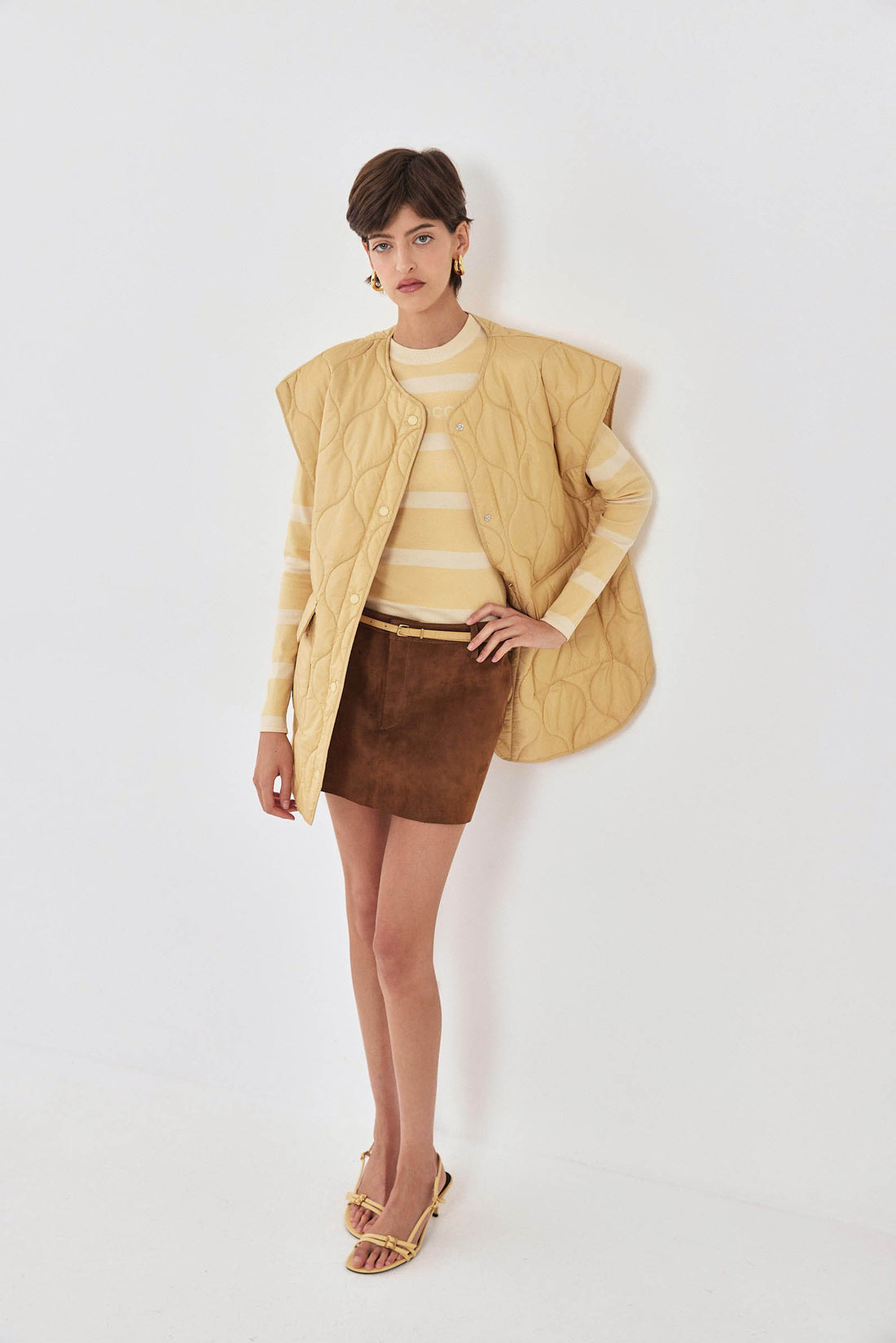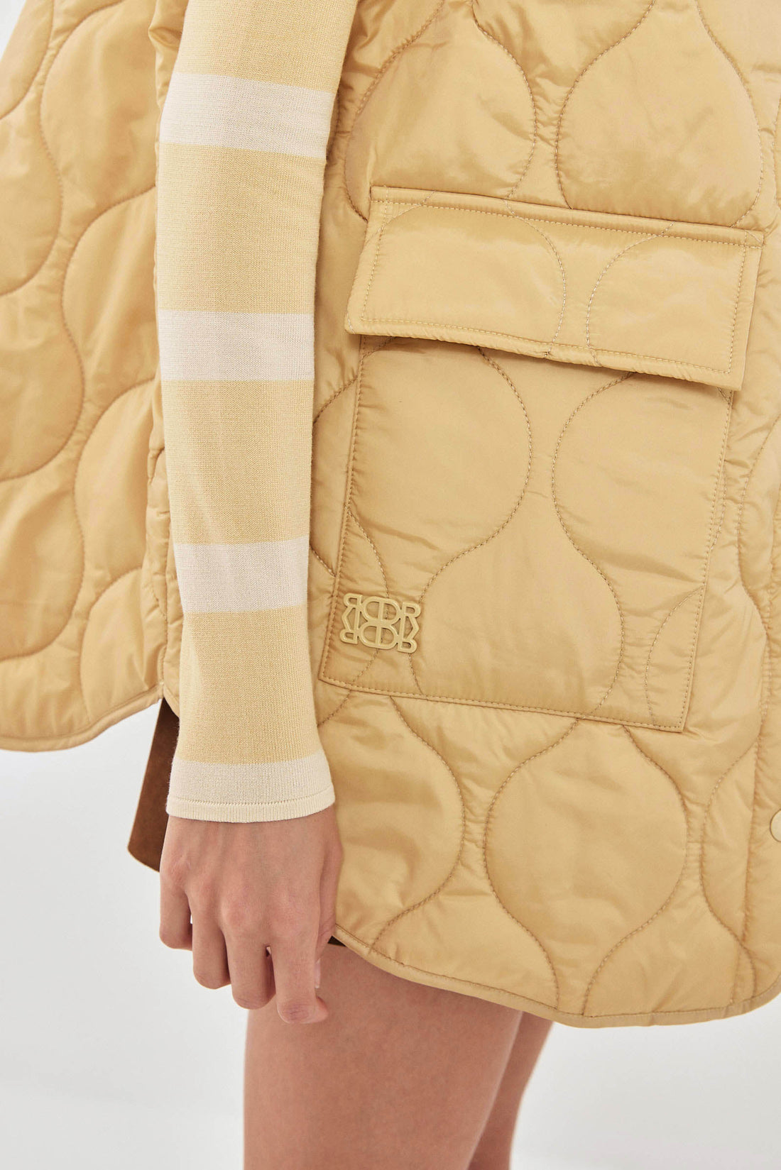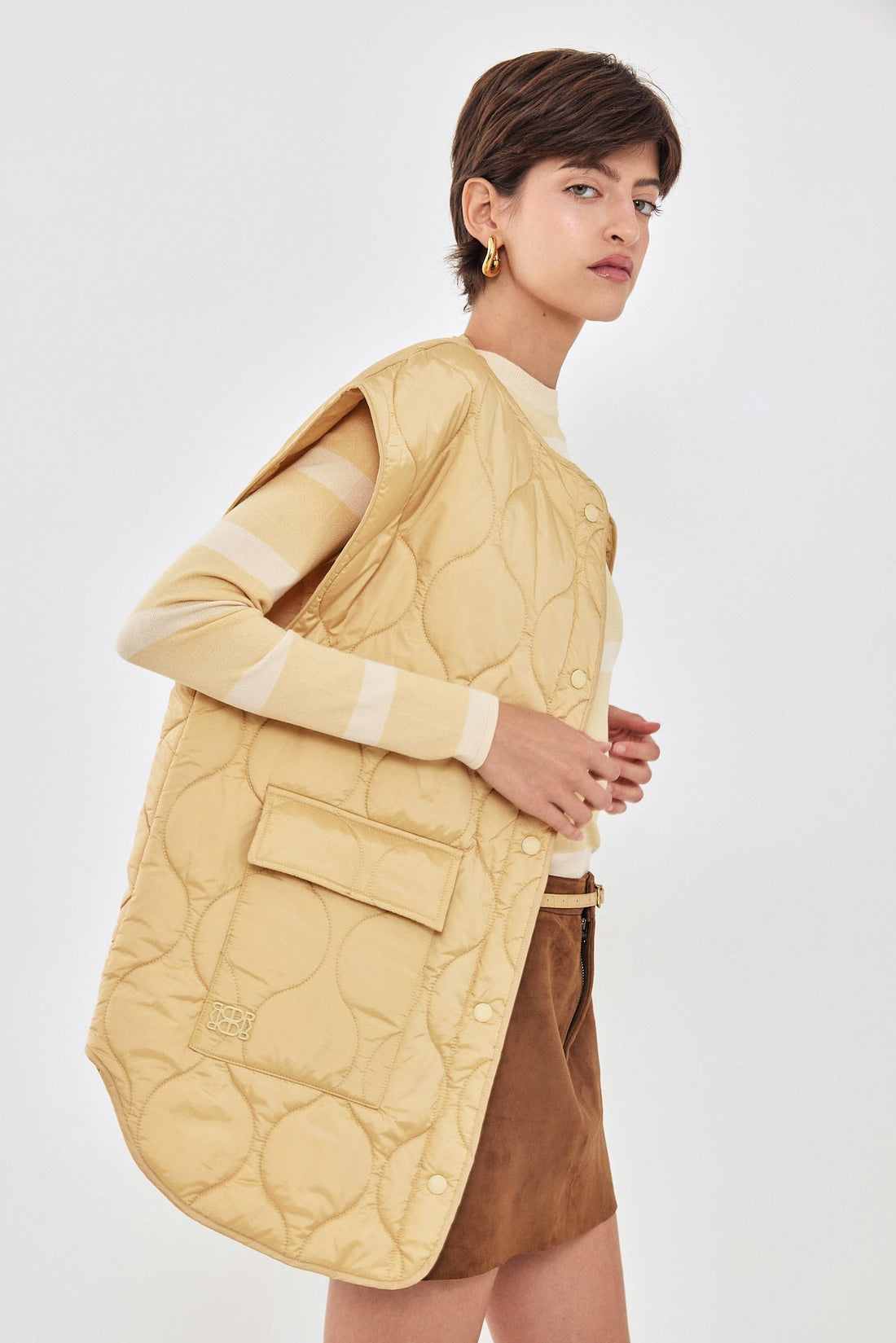An ultra-chic addition to your winter wardrobe. Quilted lightweight vest. Onion quilt pattern. Unlined. Features engraved snap buttons closure. Oversize fit. Two front pockets with a snap button closure. Luxurious tonal metal logo placed on the side pocket. Style it over our ribbed long sleeved top, a pair of denim and our matching quilted bag for a cool everyday look.