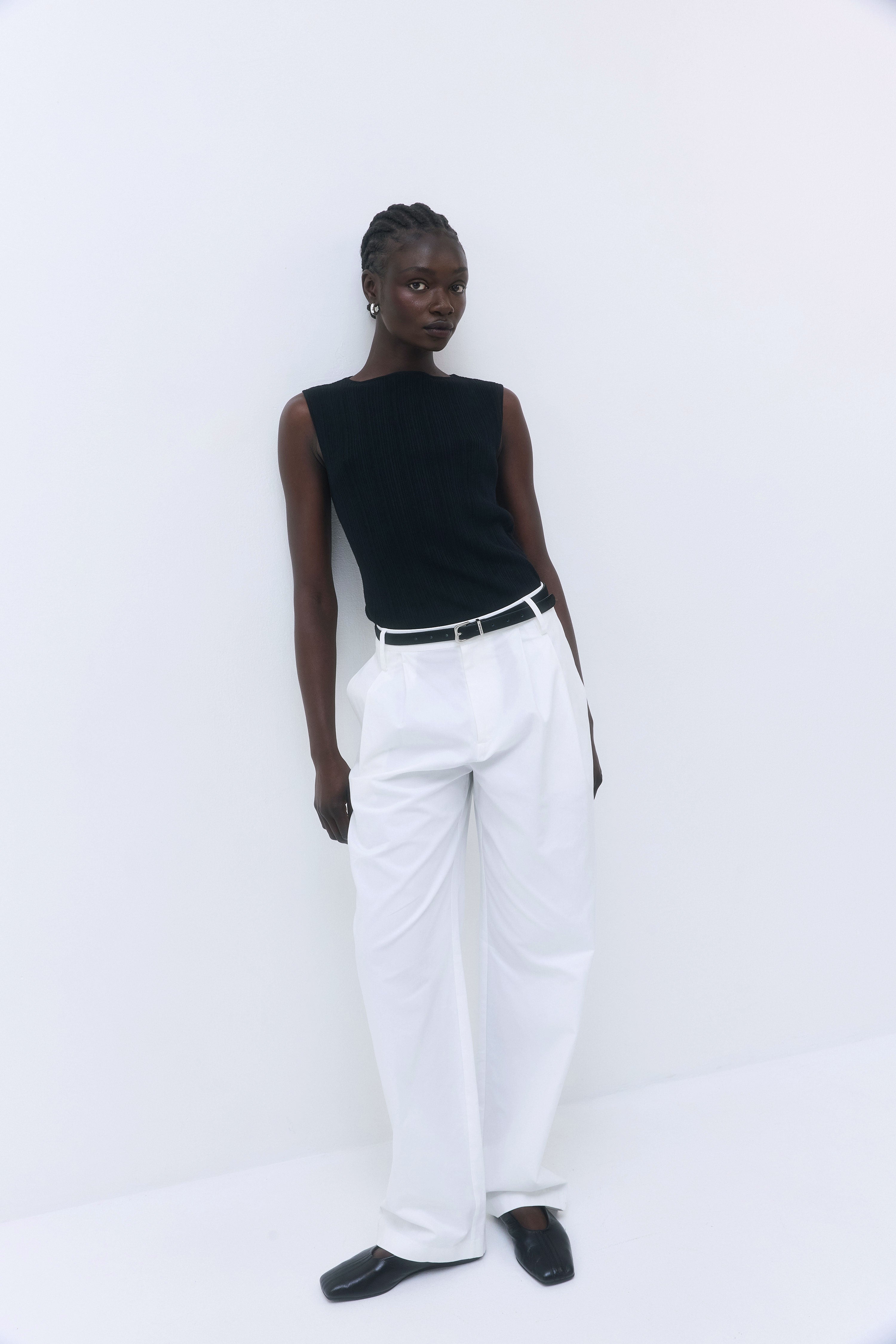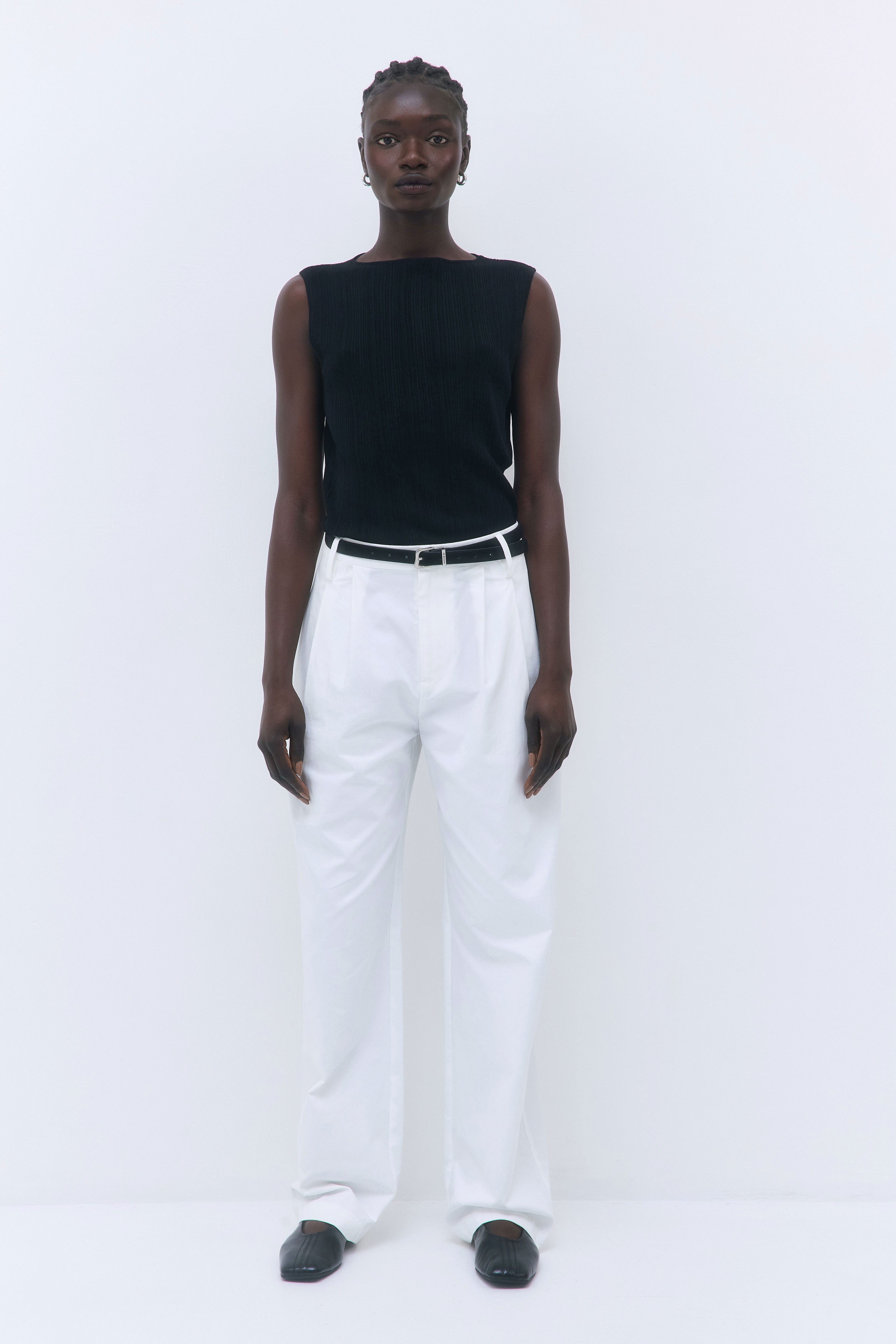 A modern essential with endless styling potential. Ribbed vest with boat neckline. Featuring a wide ribbed hem that allows for versatility; wear it as a ballooned silhouetted, or more fitted. Style it with our cozy Tailored Wool Plaid Jacket and iconic No. 19 Denim for the perfect winter's day look.