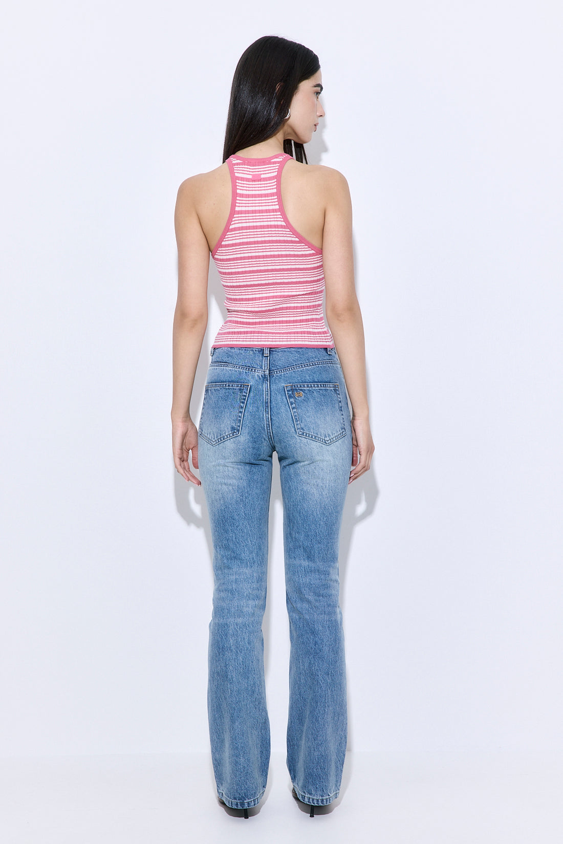 Your go to summer essential. Lightweight and breathable ribbed fabric. Delicate crew neck. ribbed finish. Features a tonal silicone squared logo patch at the upper back. Gently skims the body for a flattering, easy fit. Style it with our new linen mid rise pants, a matching scrunchie and our round sunglasses for an everyday beautiful look.