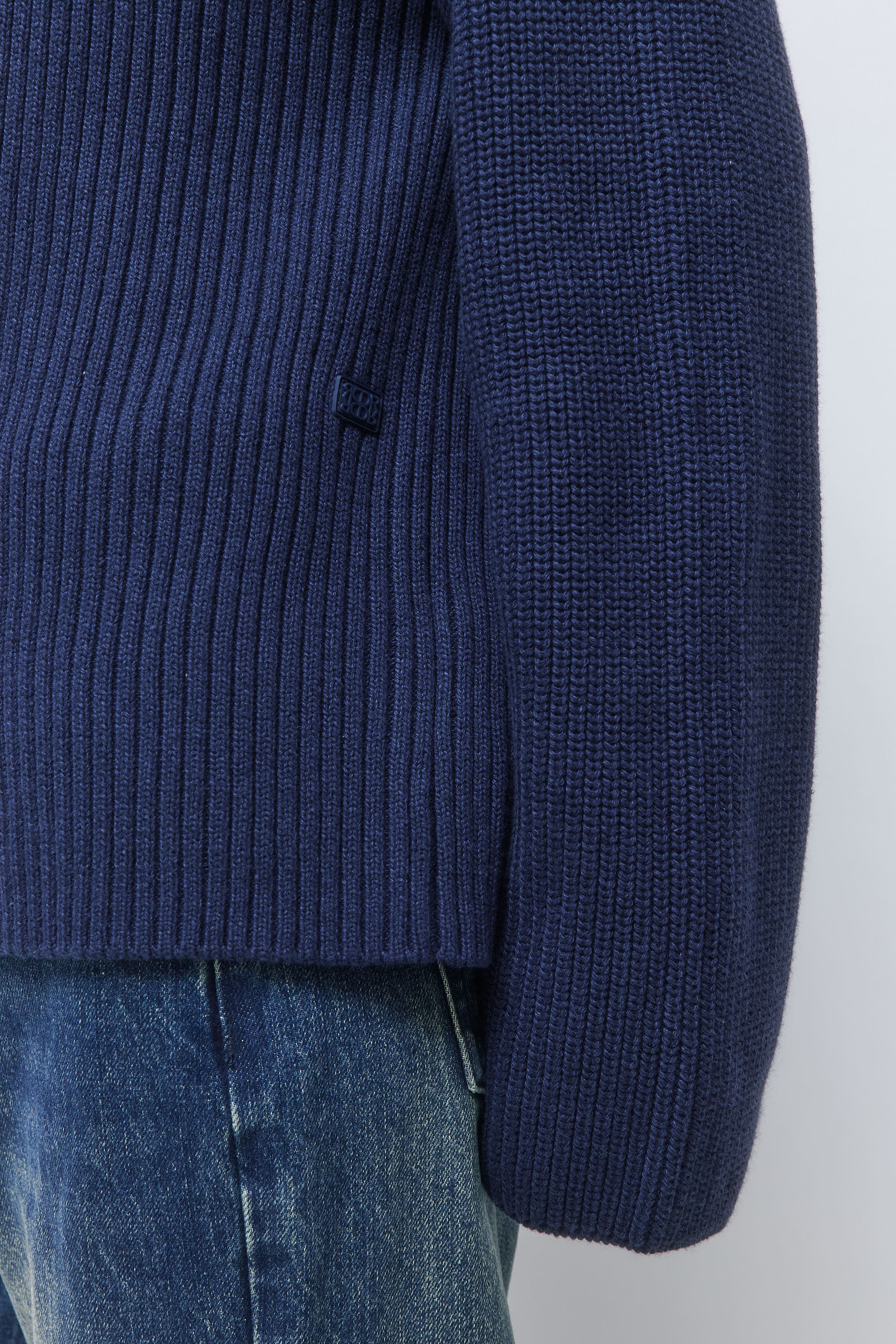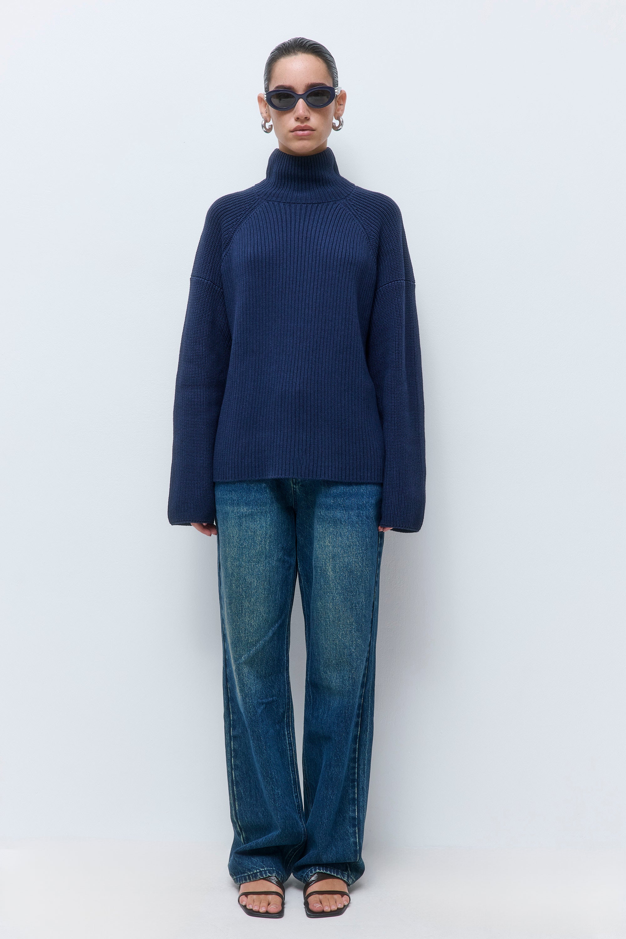 A timeless addition to your winter wardrobe. Ribbed golf sweater. Raglan sleeves. Oversized. Fully fashioned with clean finishes. Detailed with a logo silicon patch on the front. Style it with our iconic A Line Mini Skirt and pair those with our refined Oval Gunglasses for a polished look.