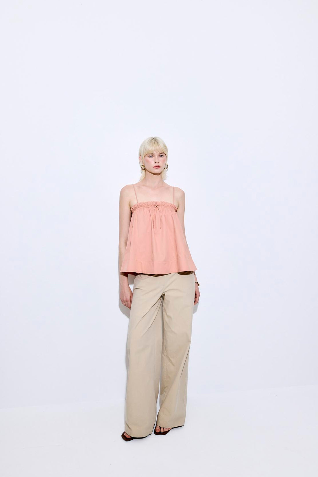 Introducing our new Ruffled Poplin Strappy Top. Lightweight, easy, and irresistibly chic. Crafted from crisp, breathable poplin with a soft drape. Features a ruched neckline with delicate tie detailing and adjustable slim straps for a personalized fit. Flowy, relaxed silhouette with a clean finish. Style it with our new ruffled poplin maxi skirt a pair of our round sunnies and our cool claw clip to seal this gorgeous look.