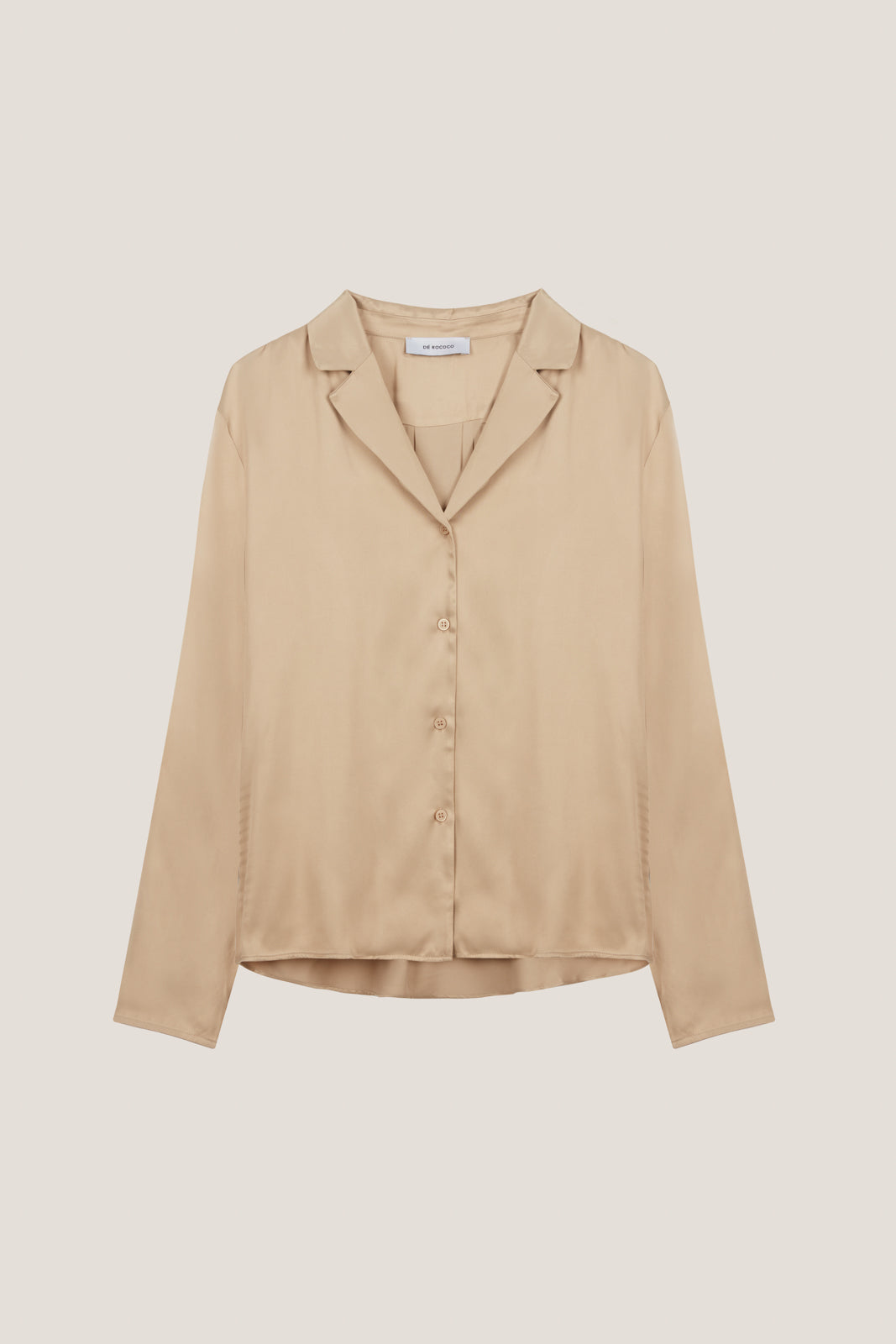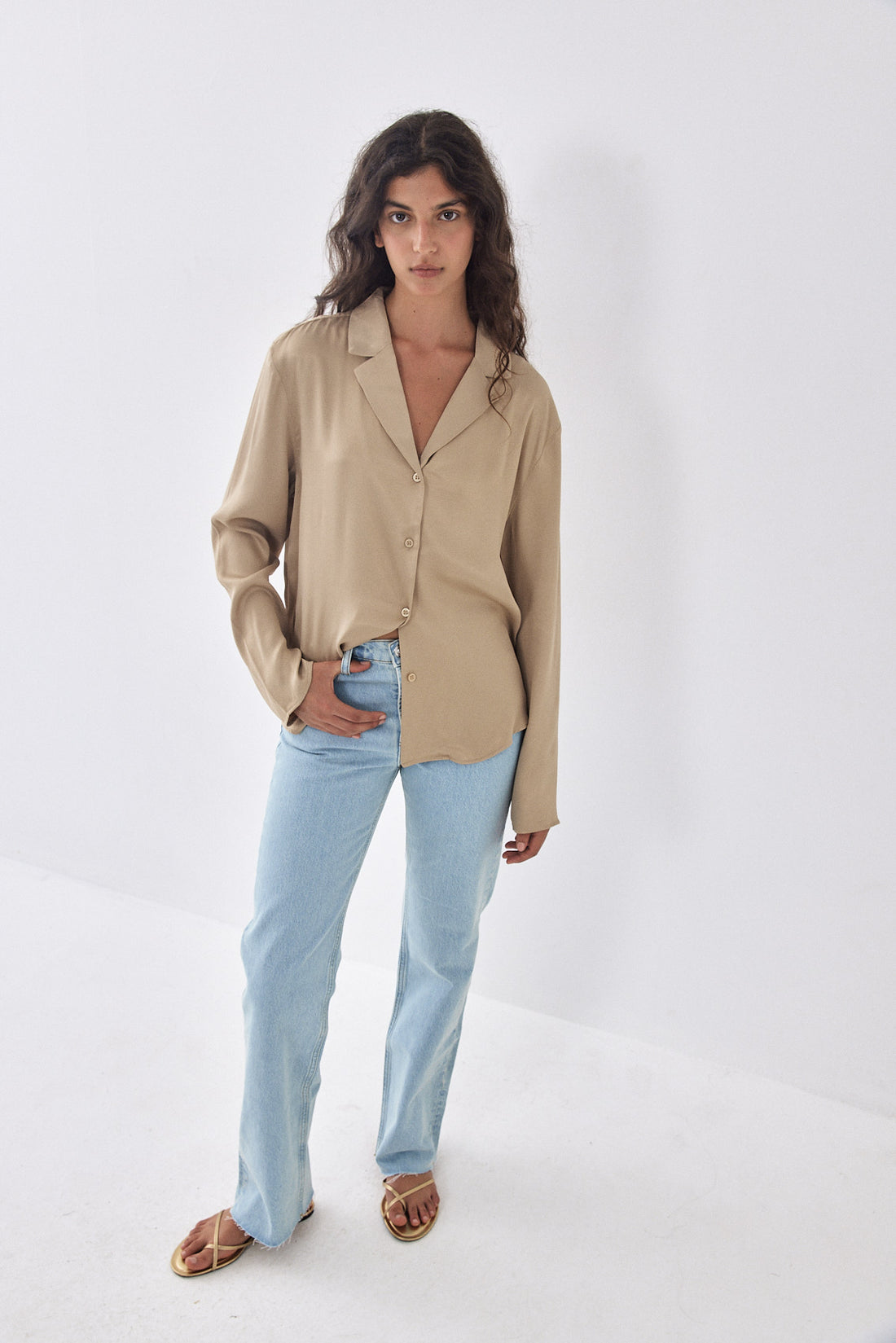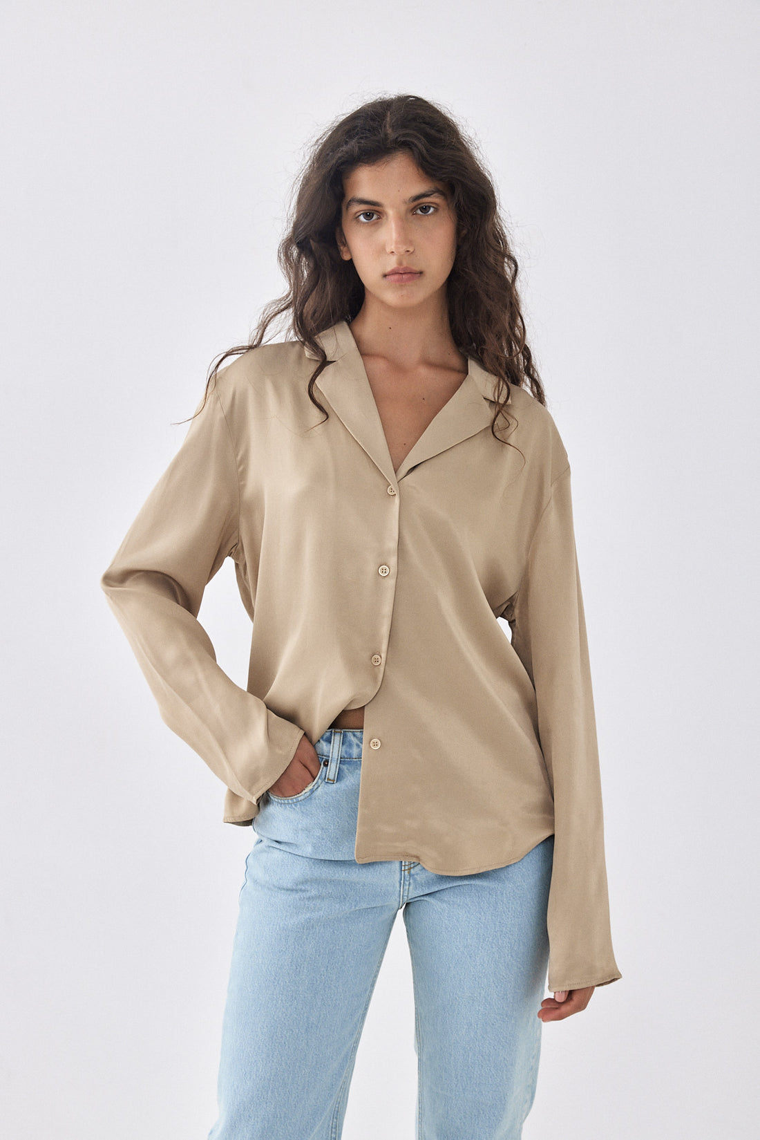 A loose fit, lightweight satin blouse. V neck. Features front buttoned closure. Long sleeves. Cut in a special bias cut technique so that the materials falls smoothly and moves with your body. Style it with the matching satin drawstring pants for an effortlessly chic look.