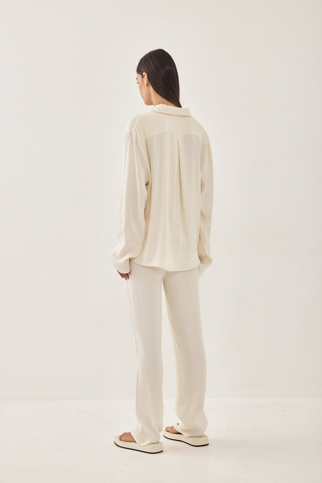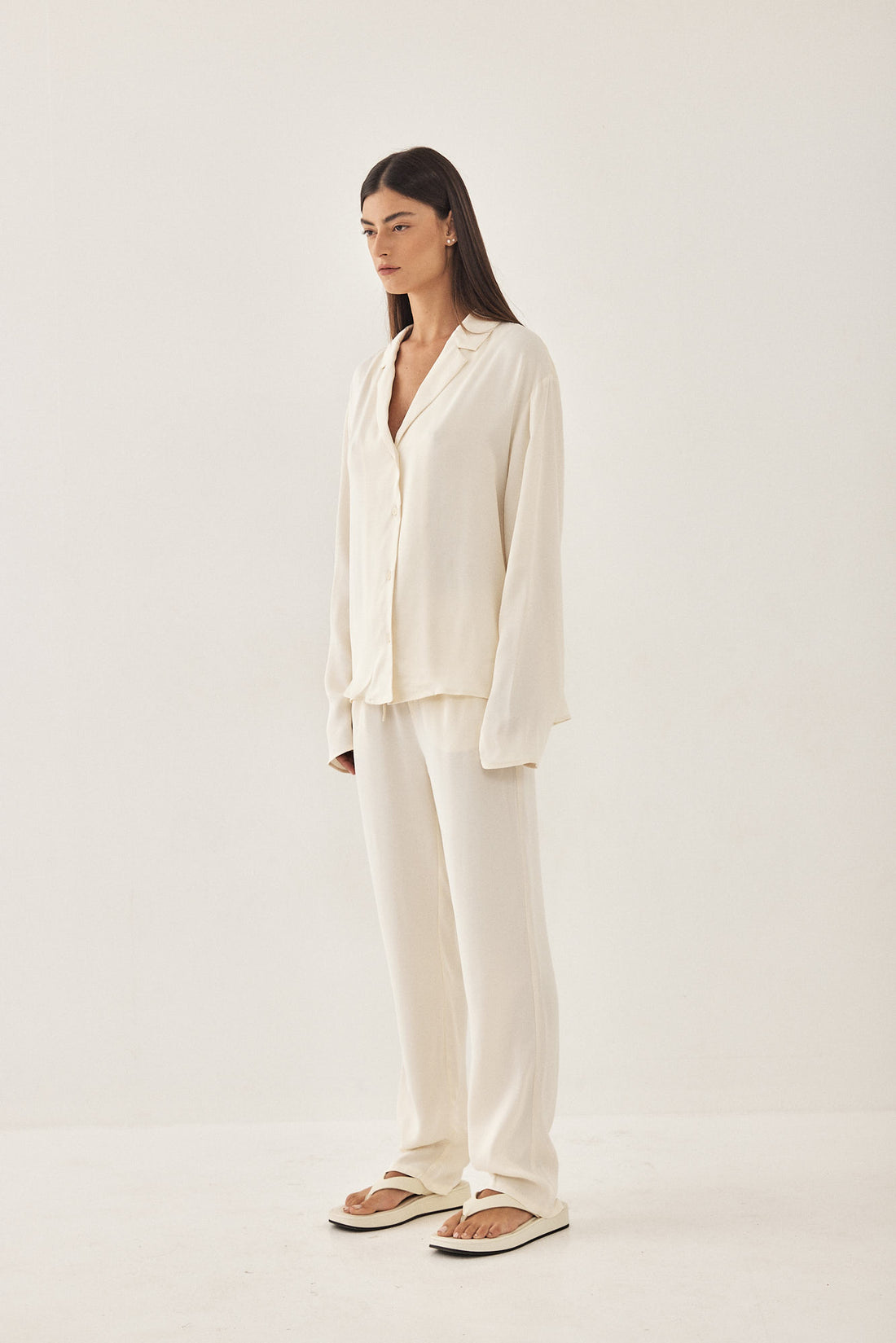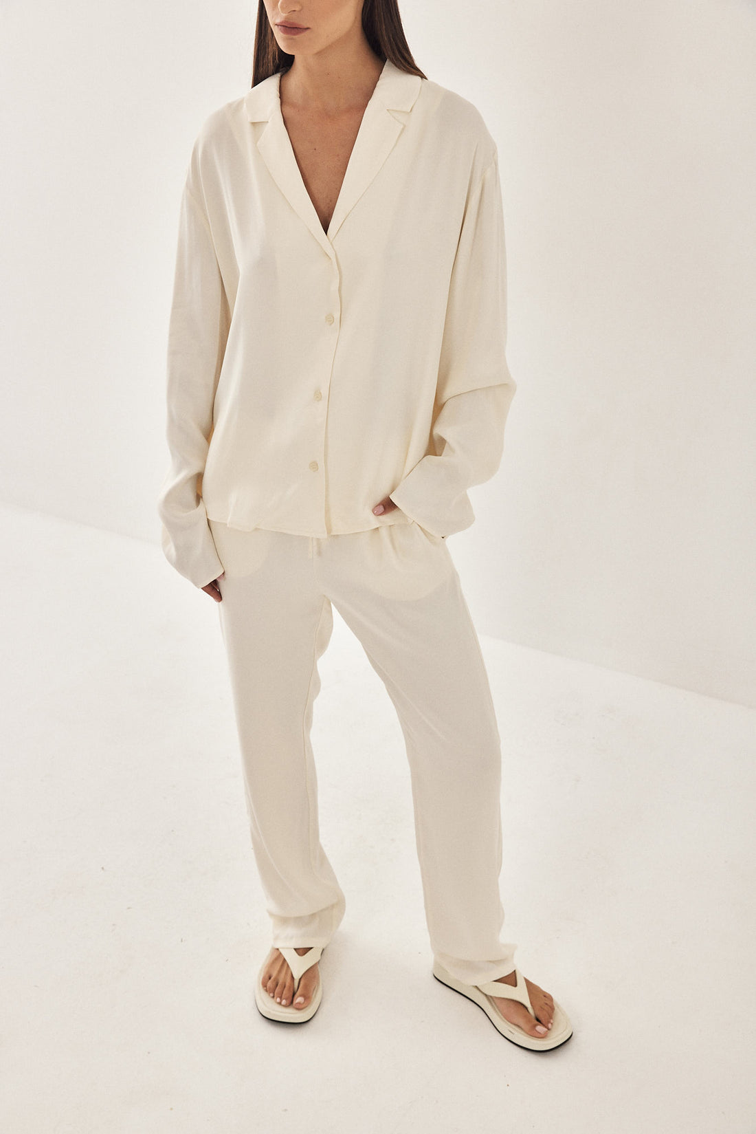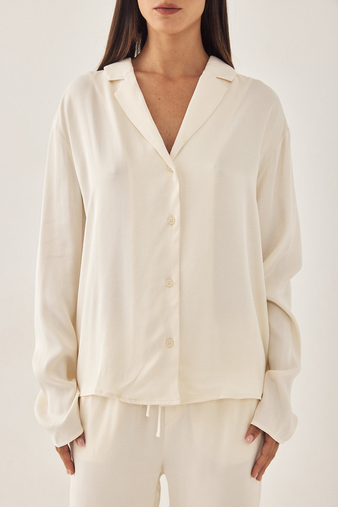 A loose fit, lightweight satin blouse. V neck. Features front buttoned closure. Long sleeves. Cut in a special bias cut technique so that the materials falls smoothly and moves with your body. Style it with the matching satin drawstring pants for an effortlessly chic look.