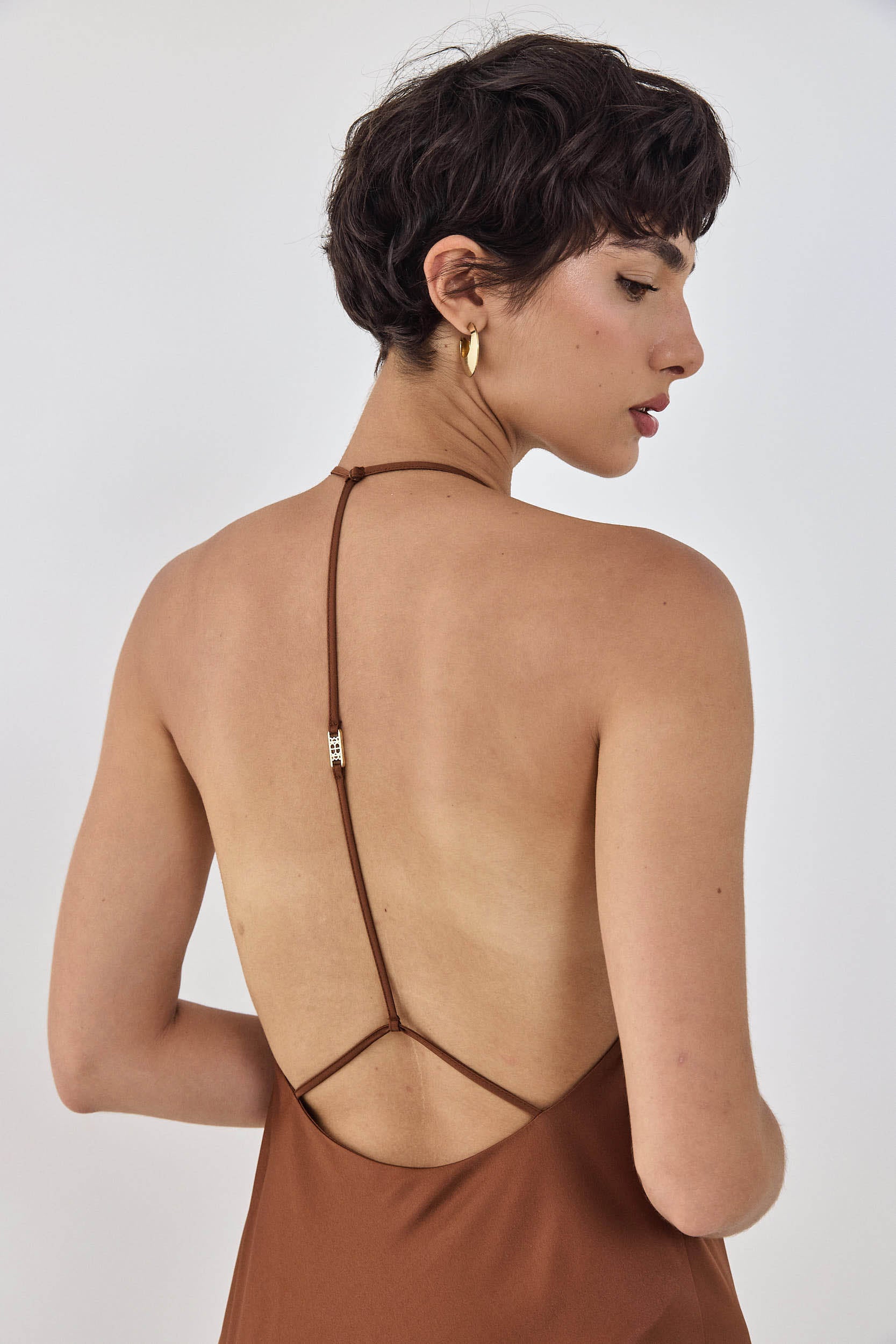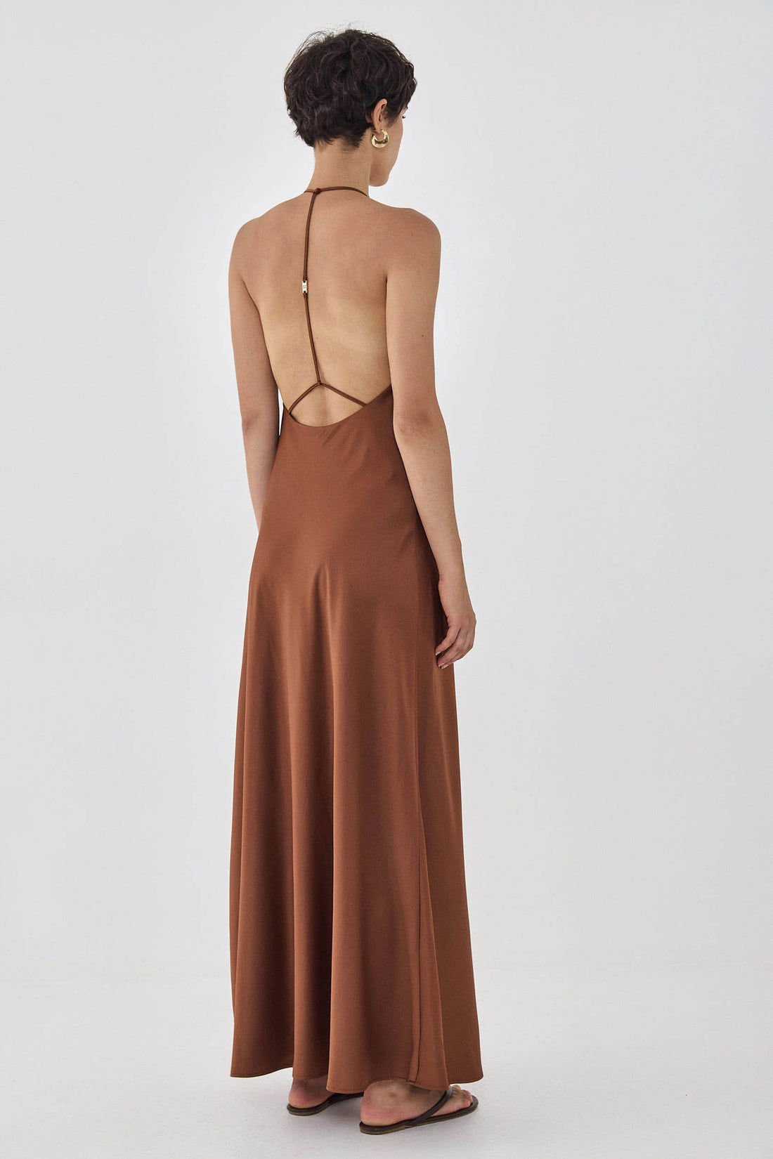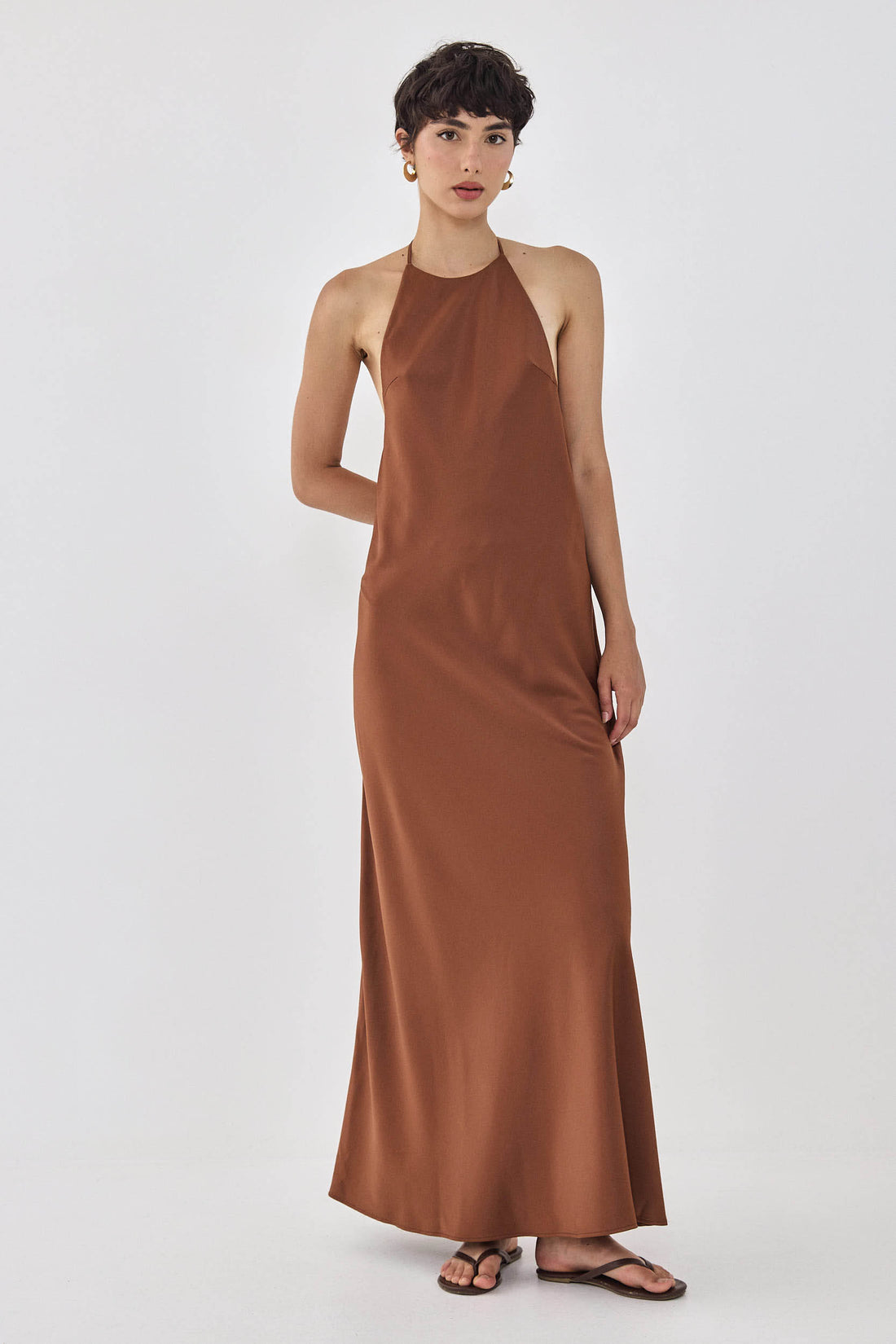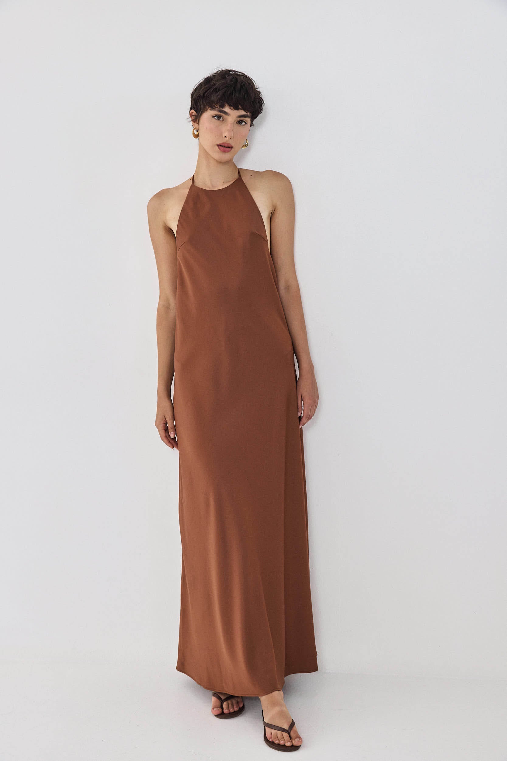 The classy satin maxi dress with a little fashionable twist. Collared neckline. Snap button closure at the neckline. Delicate geometric detailing at the back. Exposed back. Golden logo pendant at the back. Flowy silhouette. Lustrous fabric. Doesn't crease. Full length. Featuring an inner lining for extra coverage. Style it with your favorite heels and a little boxy watch for a classy Parisian look.