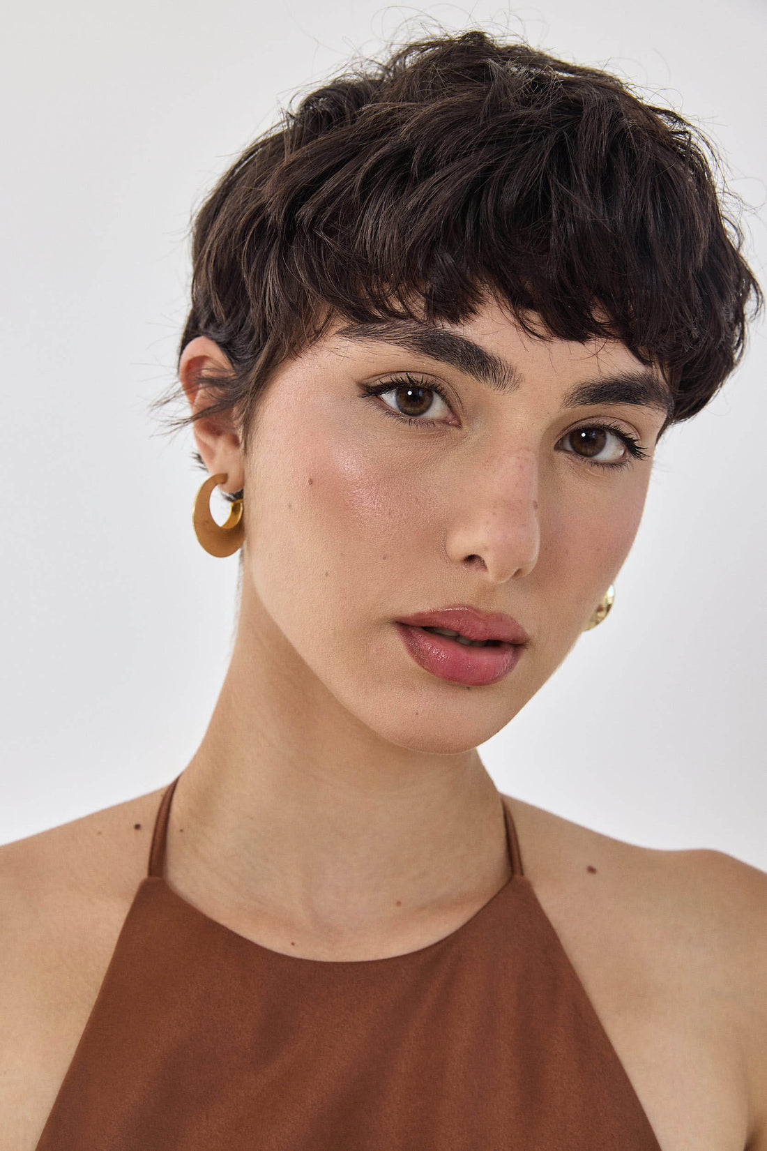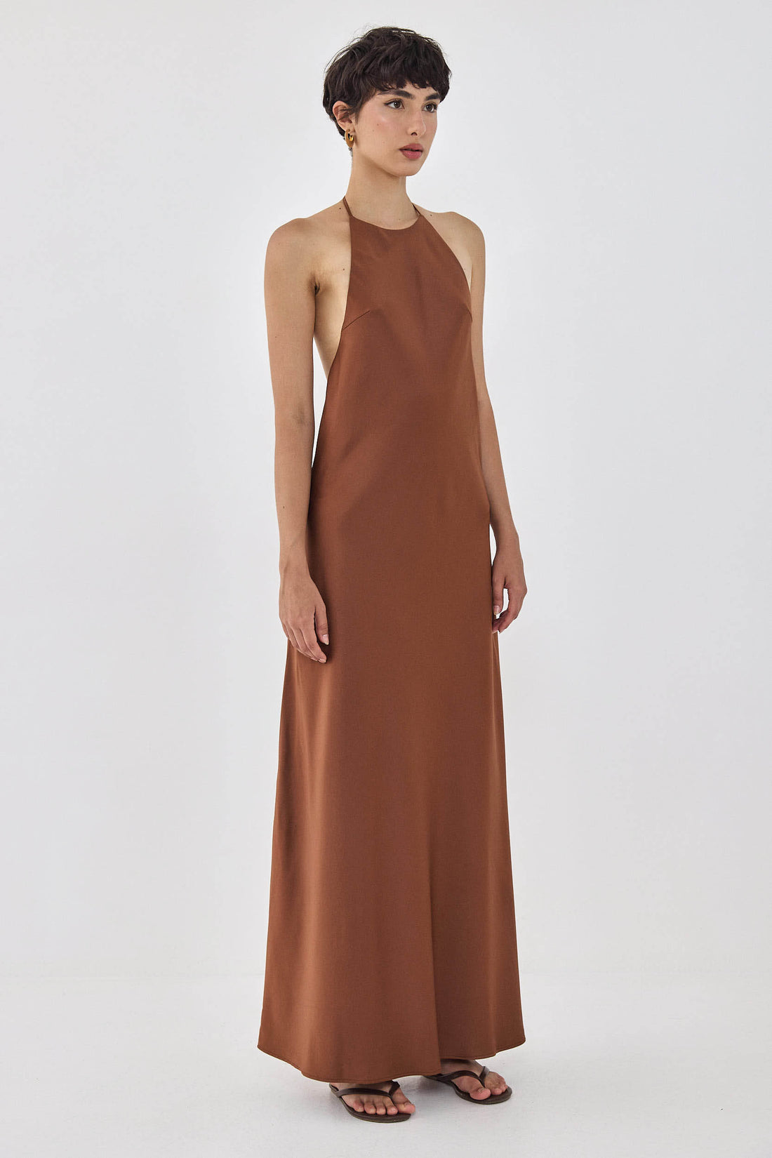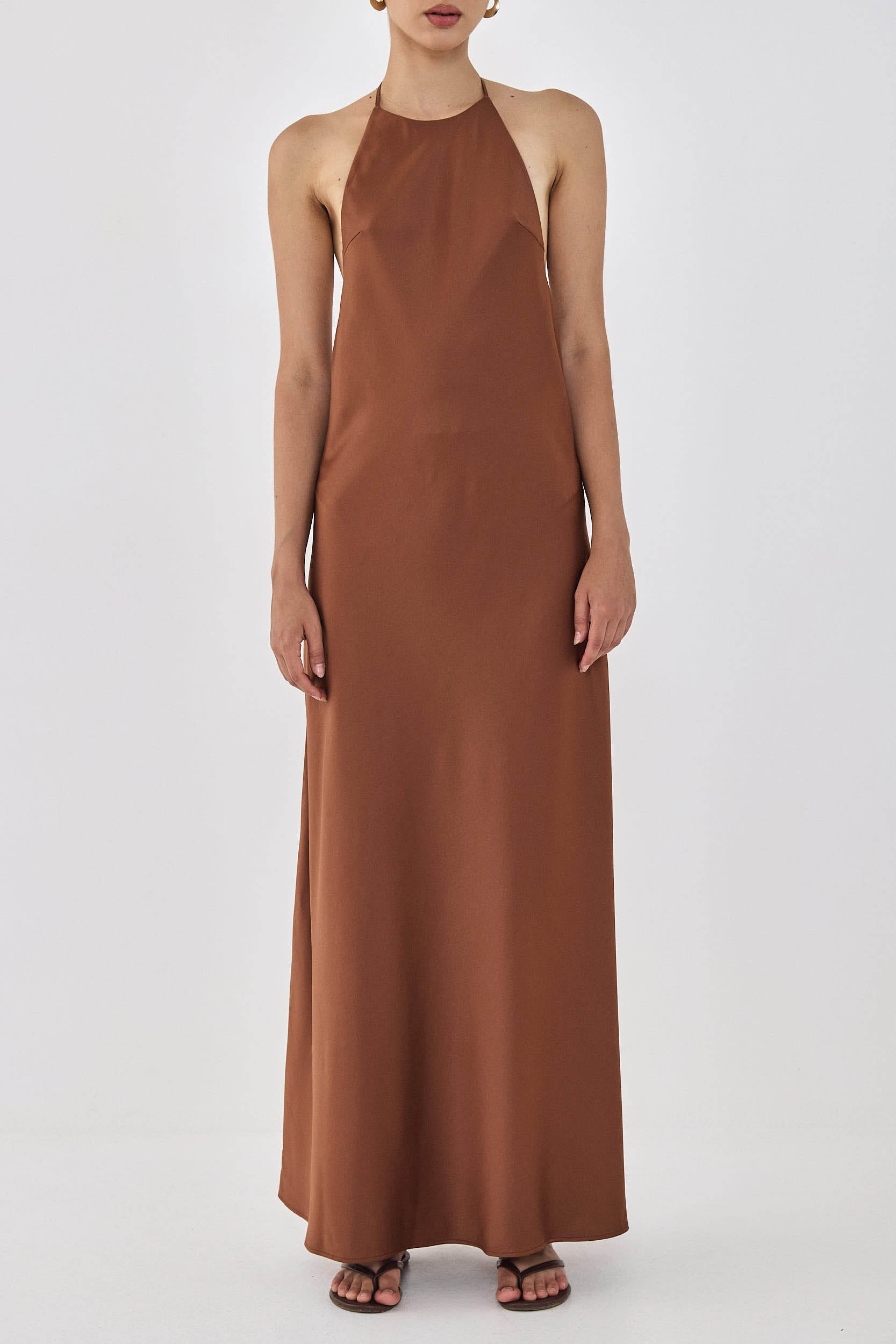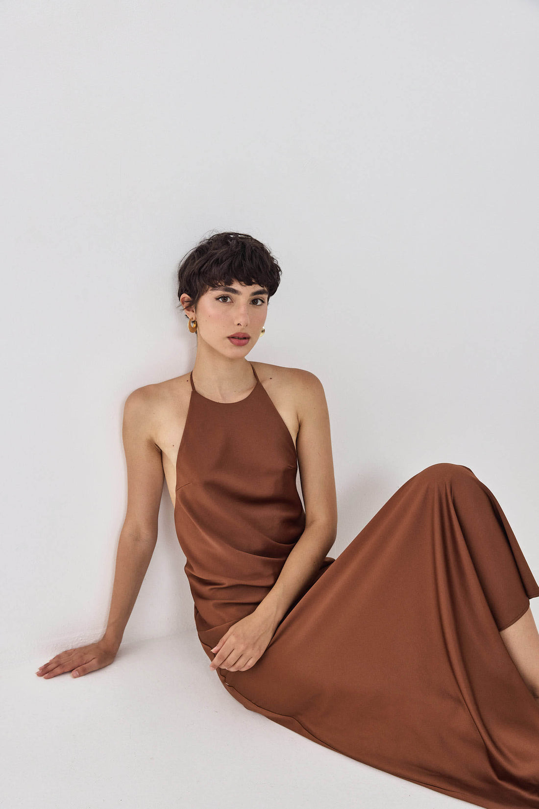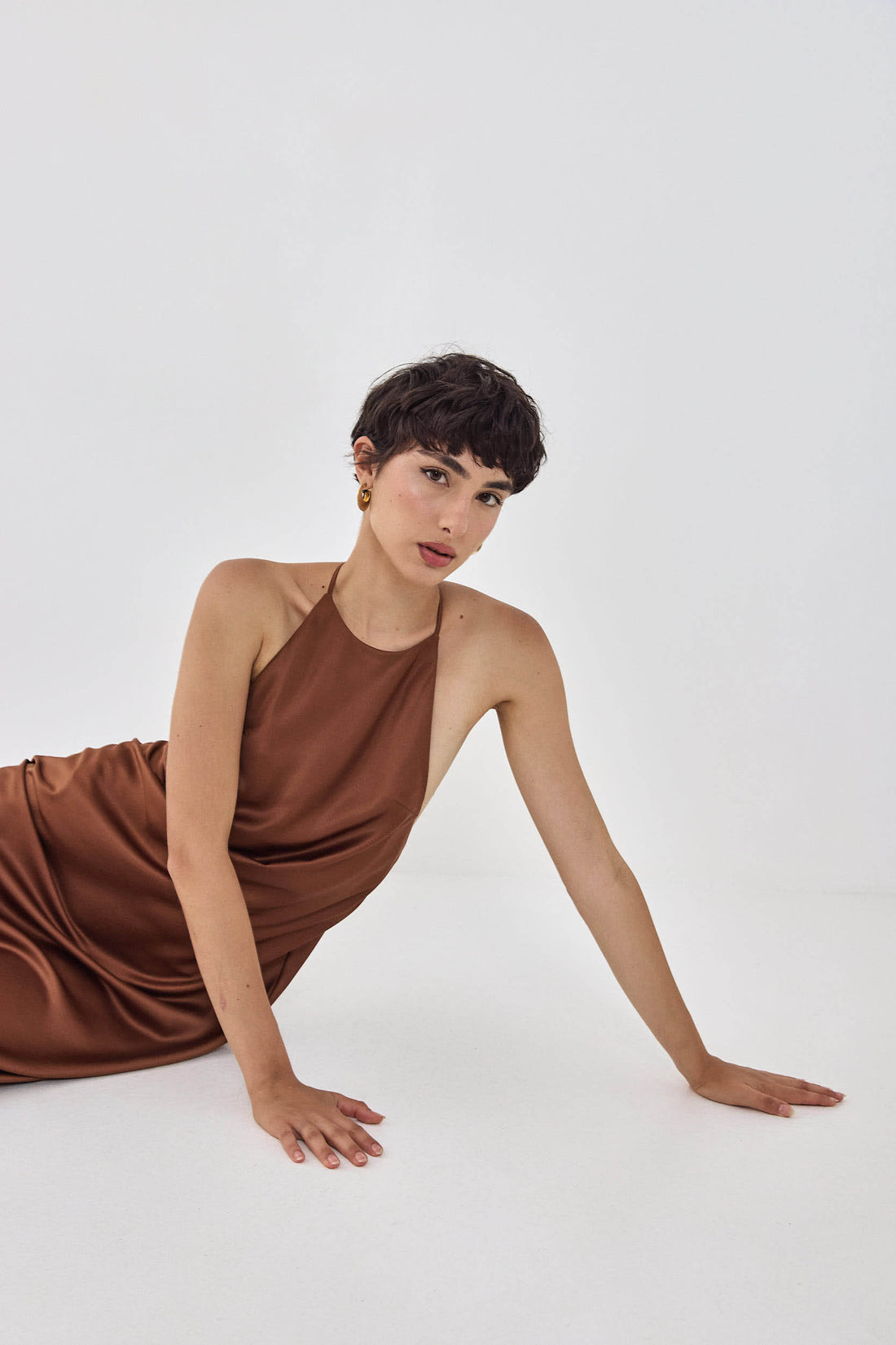 The classy satin maxi dress with a little fashionable twist. Collared neckline. Snap button closure at the neckline. Delicate geometric detailing at the back. Exposed back. Golden logo pendant at the back. Flowy silhouette. Lustrous fabric. Doesn't crease. Full length. Featuring an inner lining for extra coverage. Style it with your favorite heels and a little boxy watch for a classy Parisian look.
