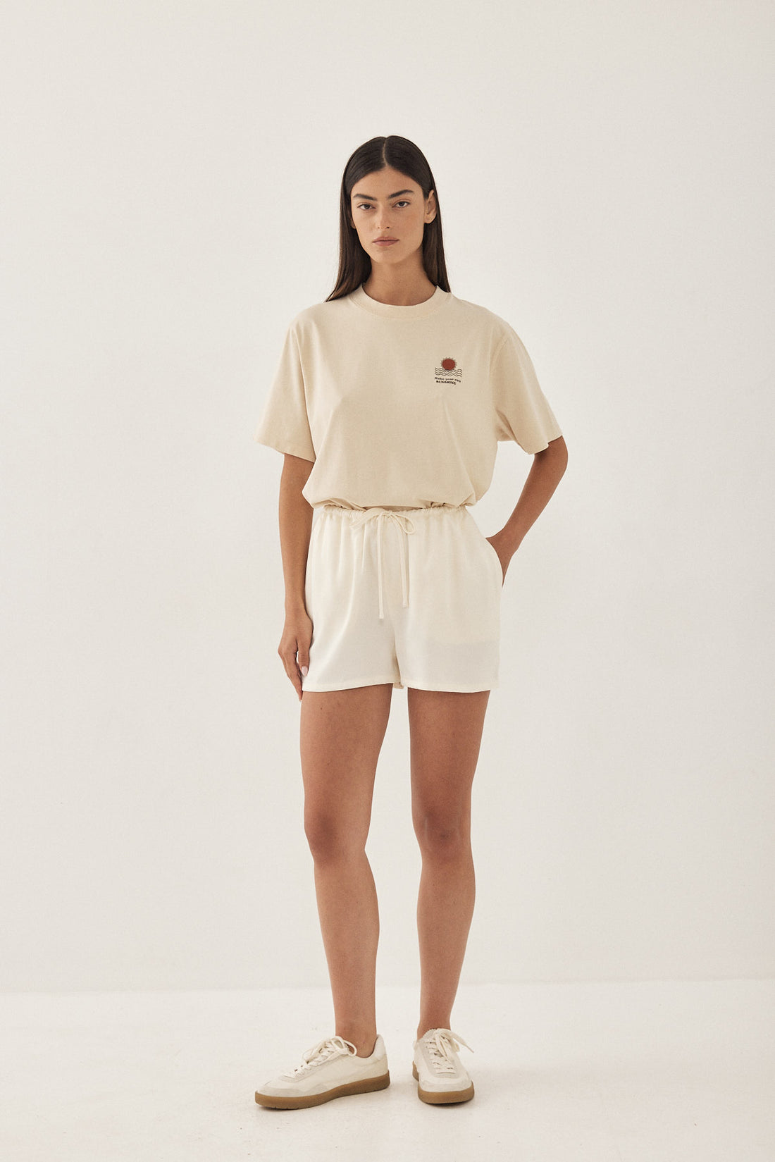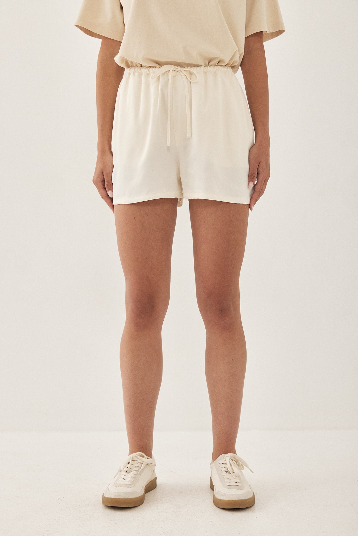 High waisted relaxed satin shorts. Features a delicate drawstring and two side pockets. Made from breathable material. Cut in a special bias cut technique so that the materials falls smoothly and moves with your body. Style it with the matching satin top for the perfectly chic everyday look.