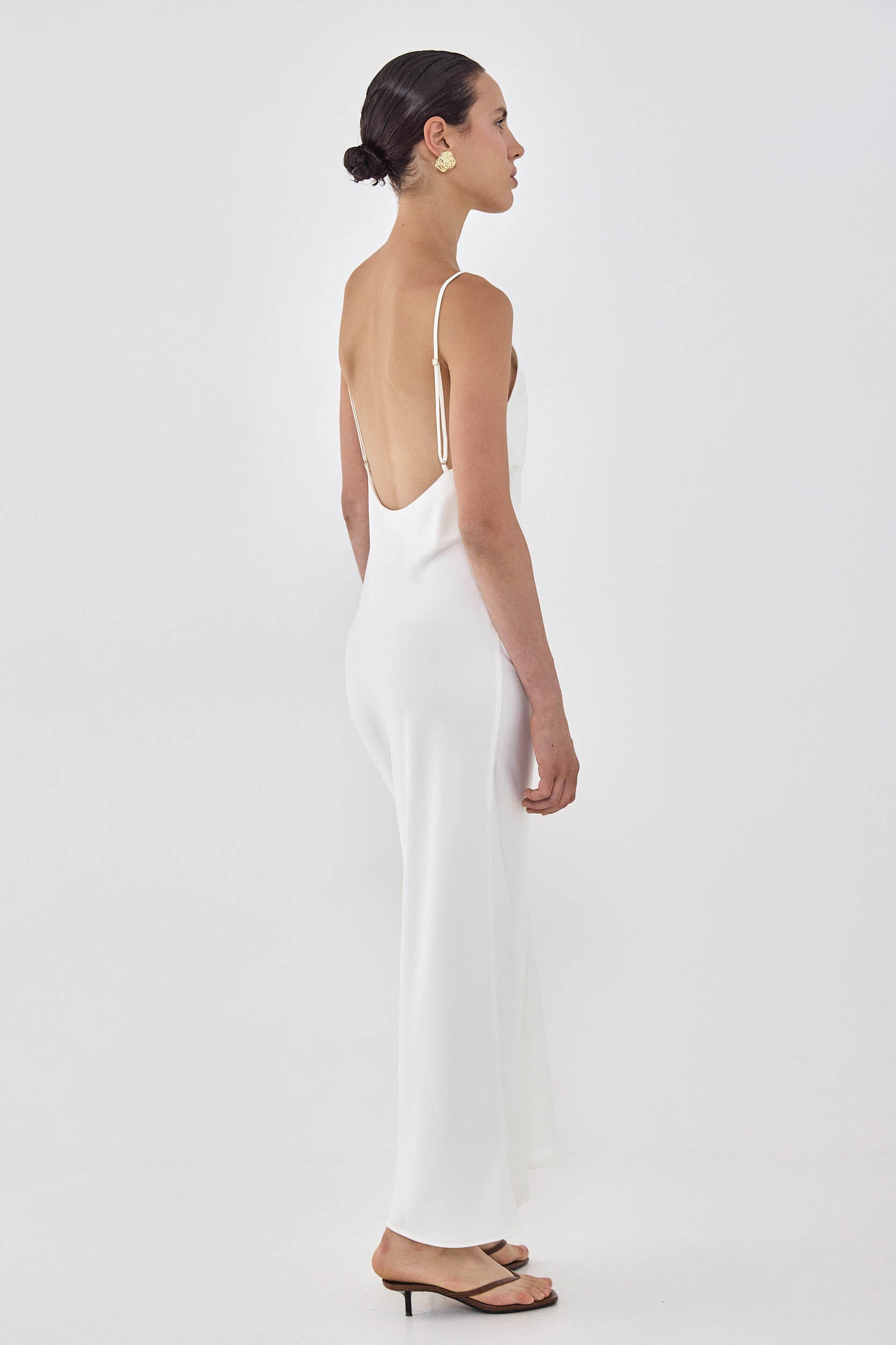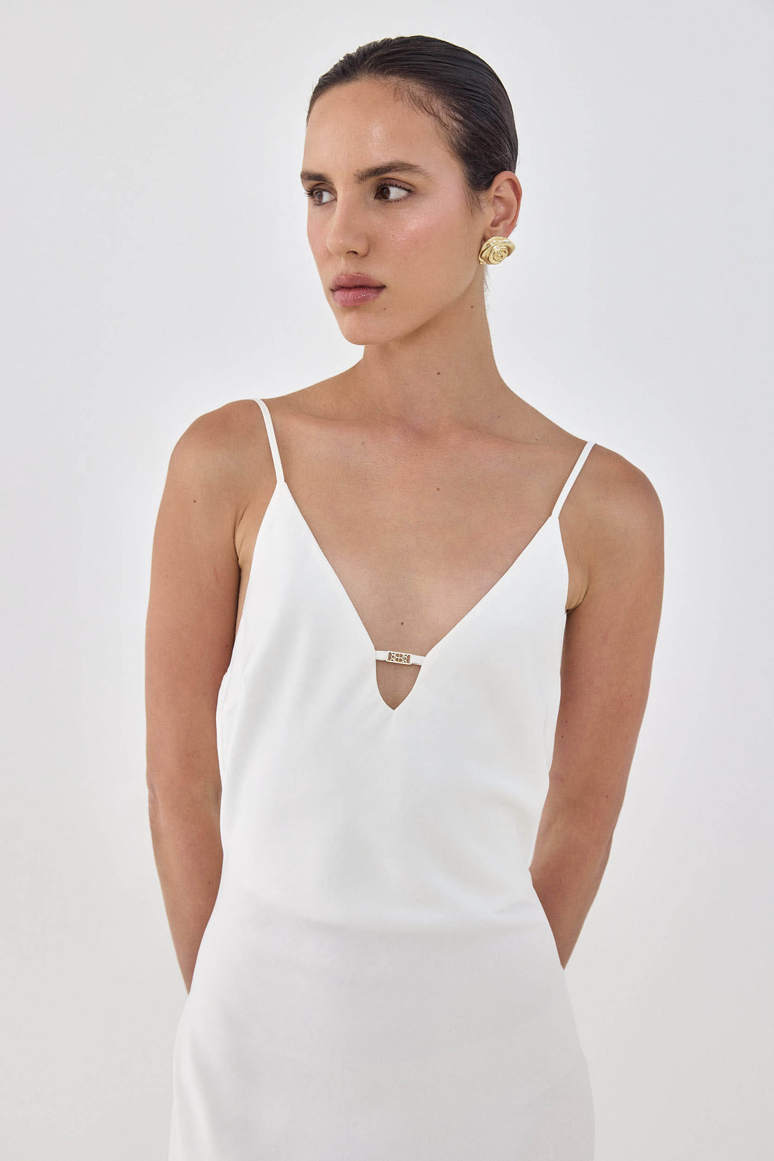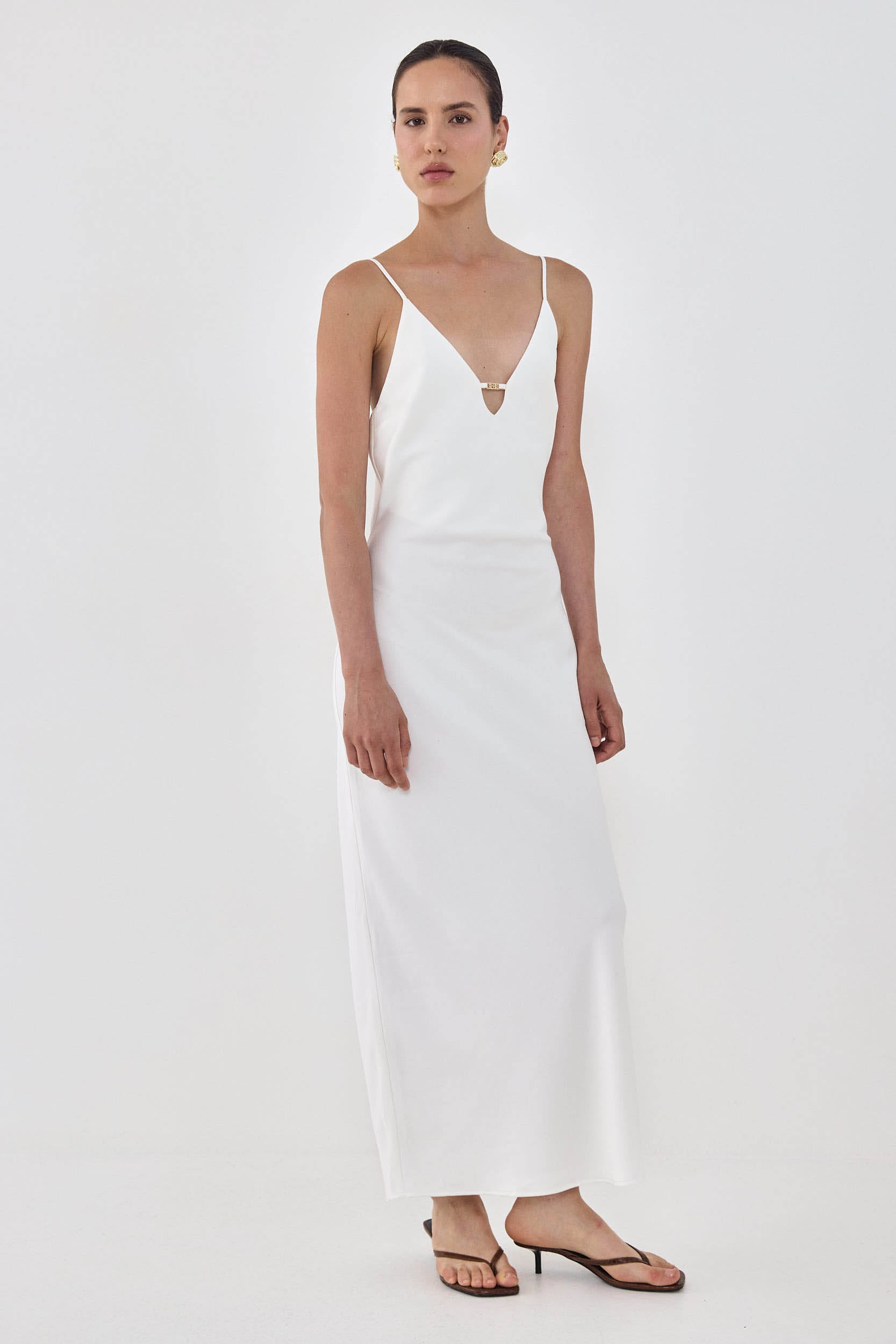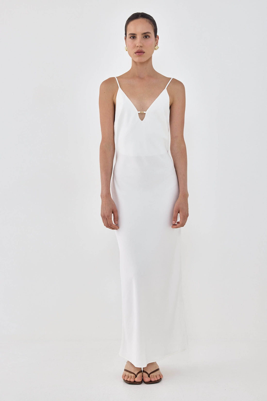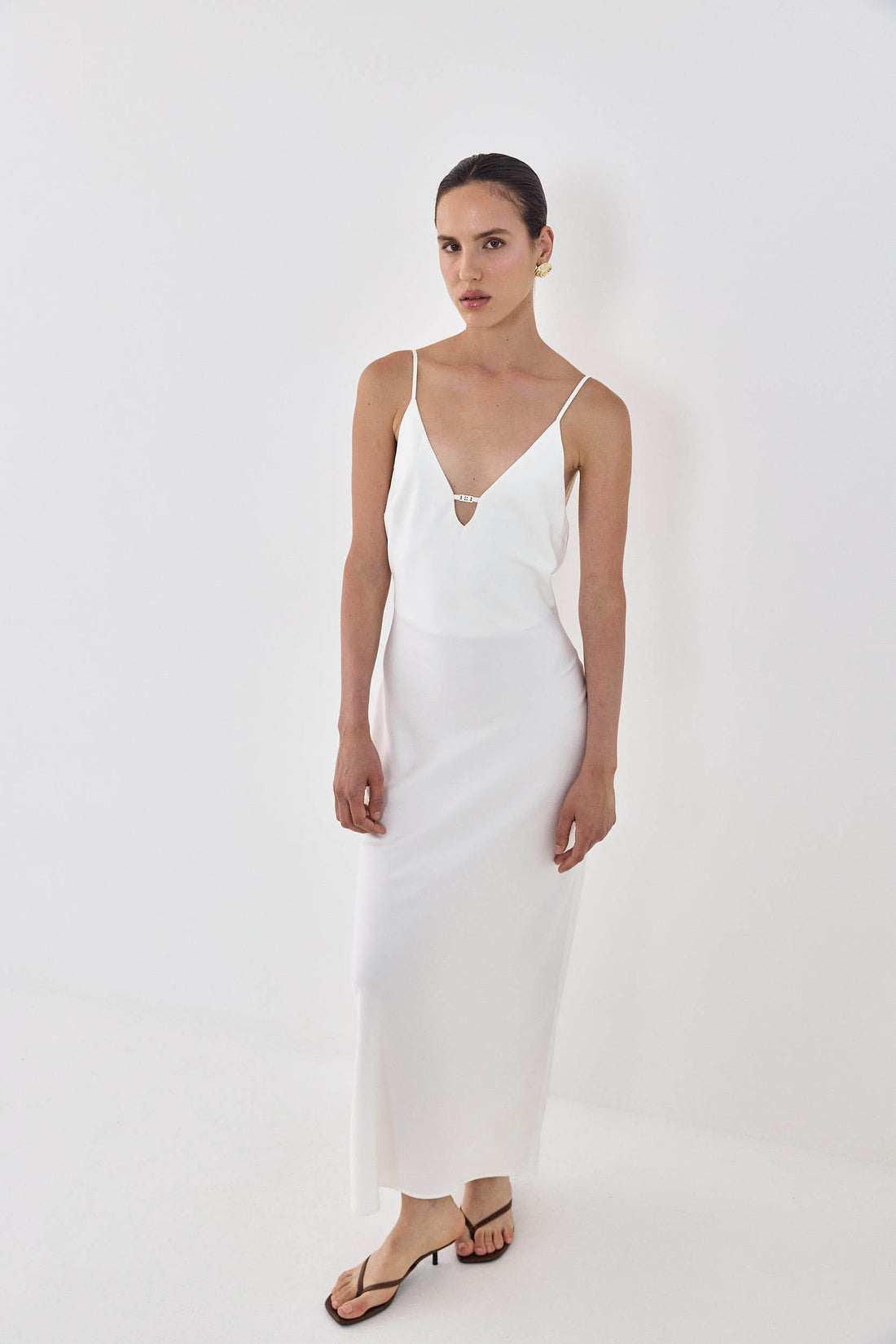 This dress is the definition of epitome of class. Maxi length. Flowy silhouette. Shiny finish. V neck. Thin adjustable straps. Upside down teardrop opening at the front with a golden logo pendant detail. Fabric doesn't crease. Features an inner lining for extra coverage. Style it with a sleek back hairstyle, kitten heels and your favorite accessories for a classy and timeless look.