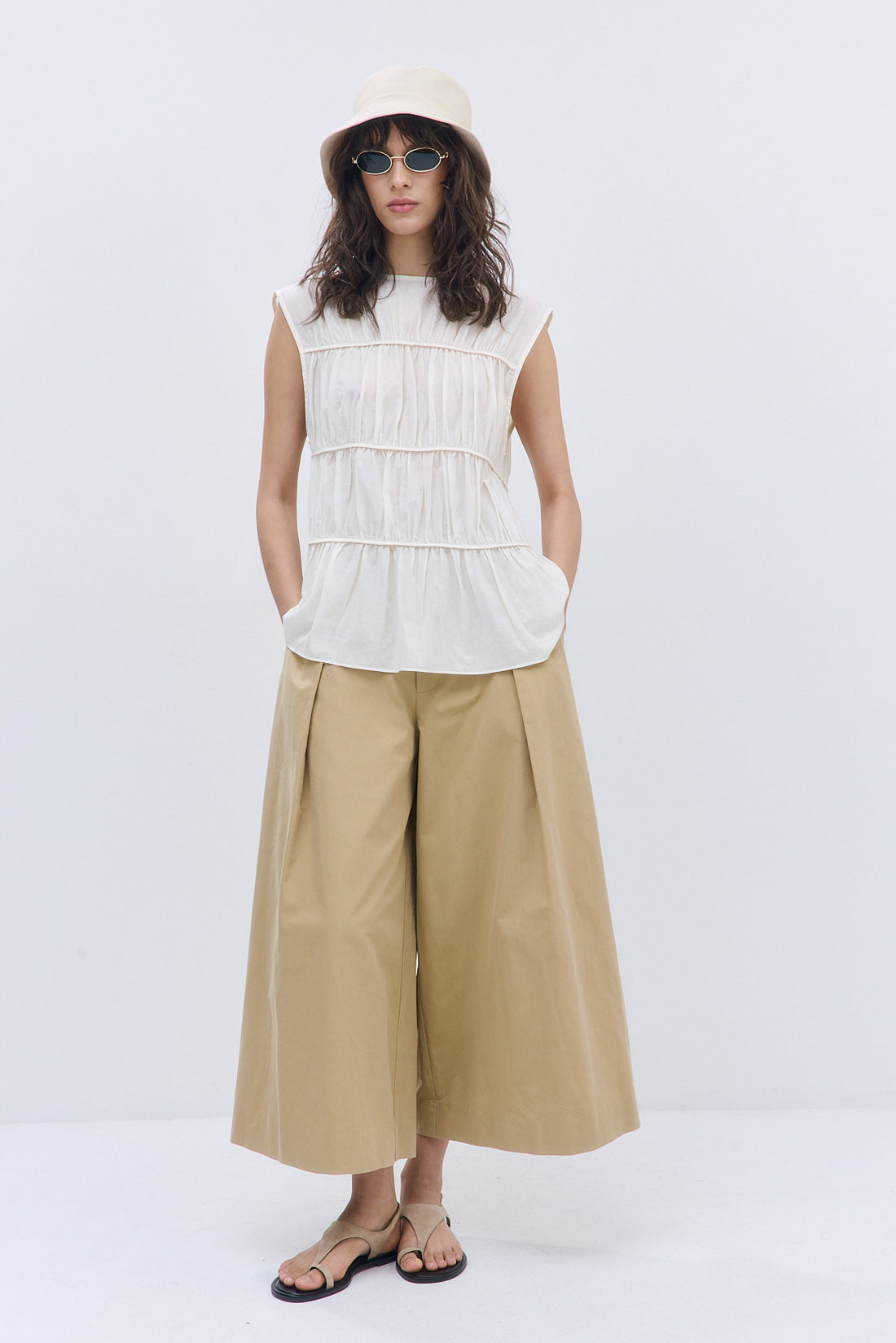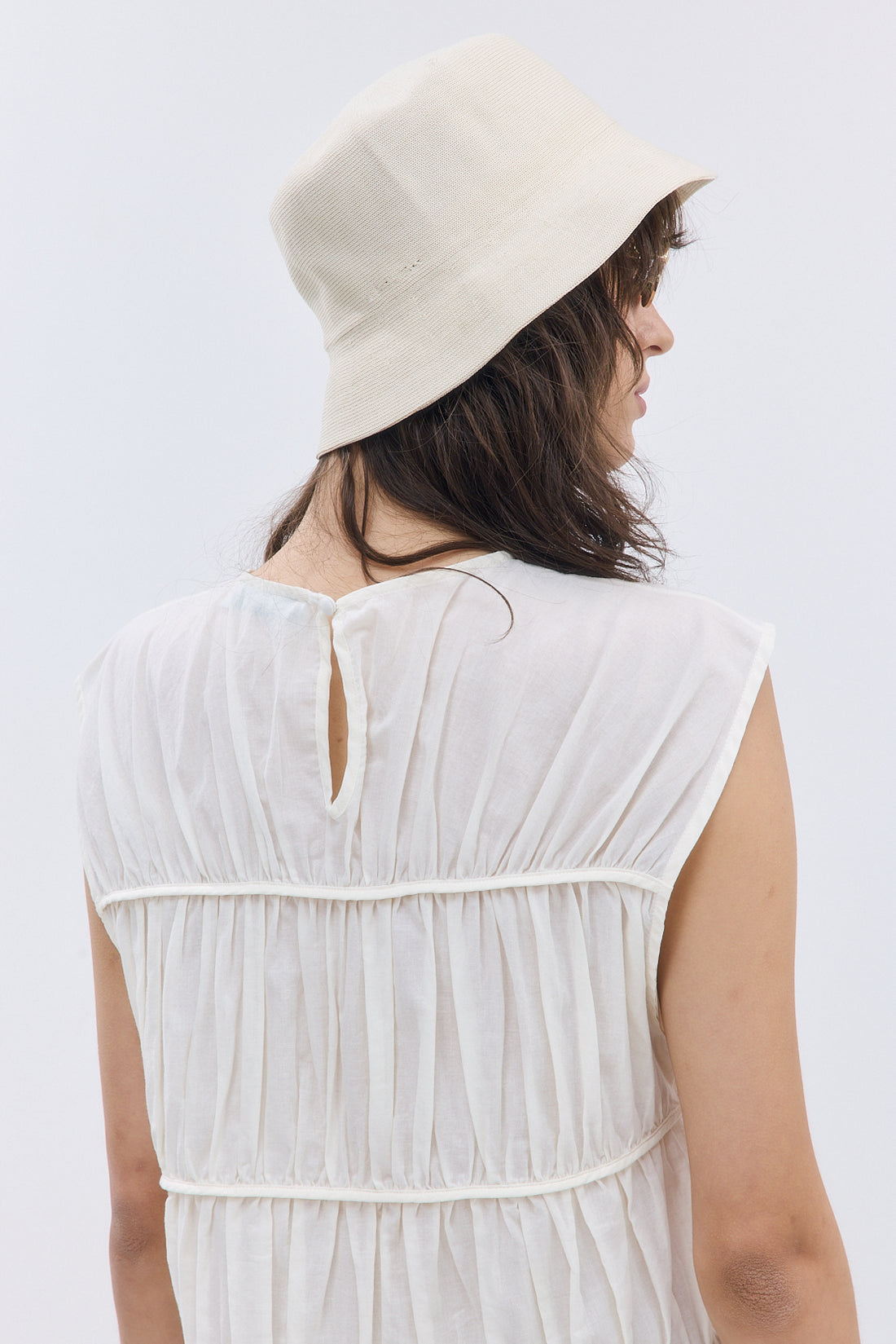 A modern piece designed with soft structure and elegant movement. Sleeveless Pleated Top. Crew neckline. Detailed with seam lines and subtle pleats across the bust, waist, and above the hips. Designed with a small keyhole slit with a buttoned closure at the top back and a tonal embroidered logo on the front side. Style it with our timeless No. 11 Denim and pair those with our iconic Mini Yvon Shoulder Bag for a polished look.