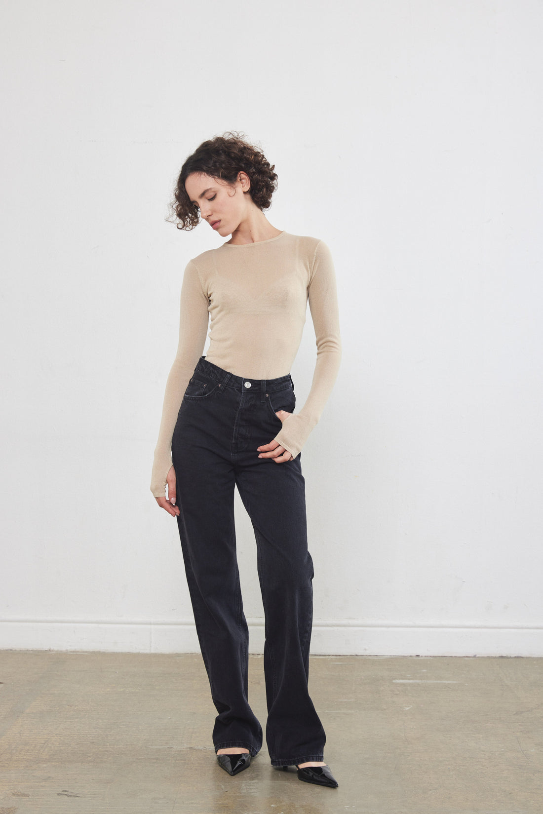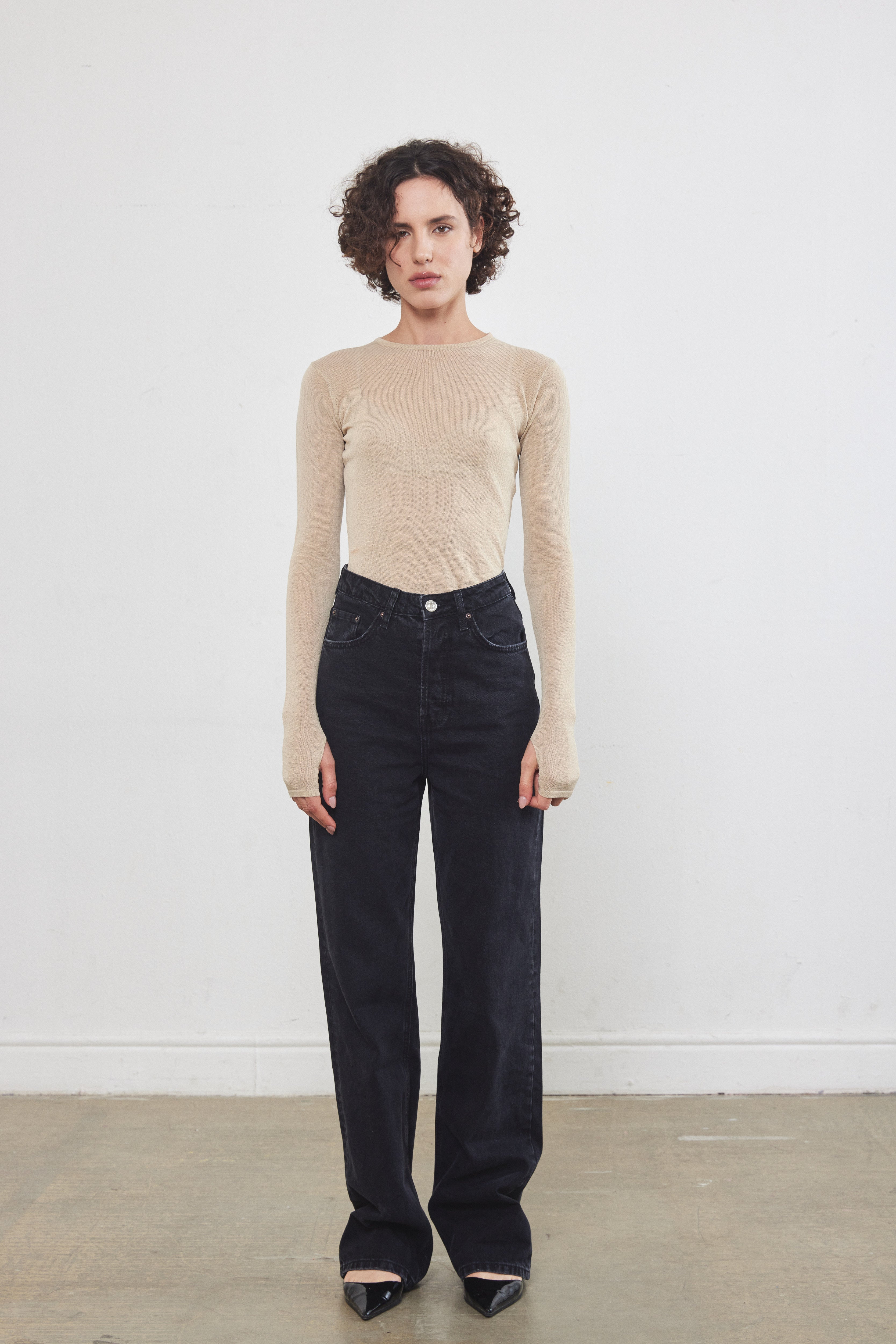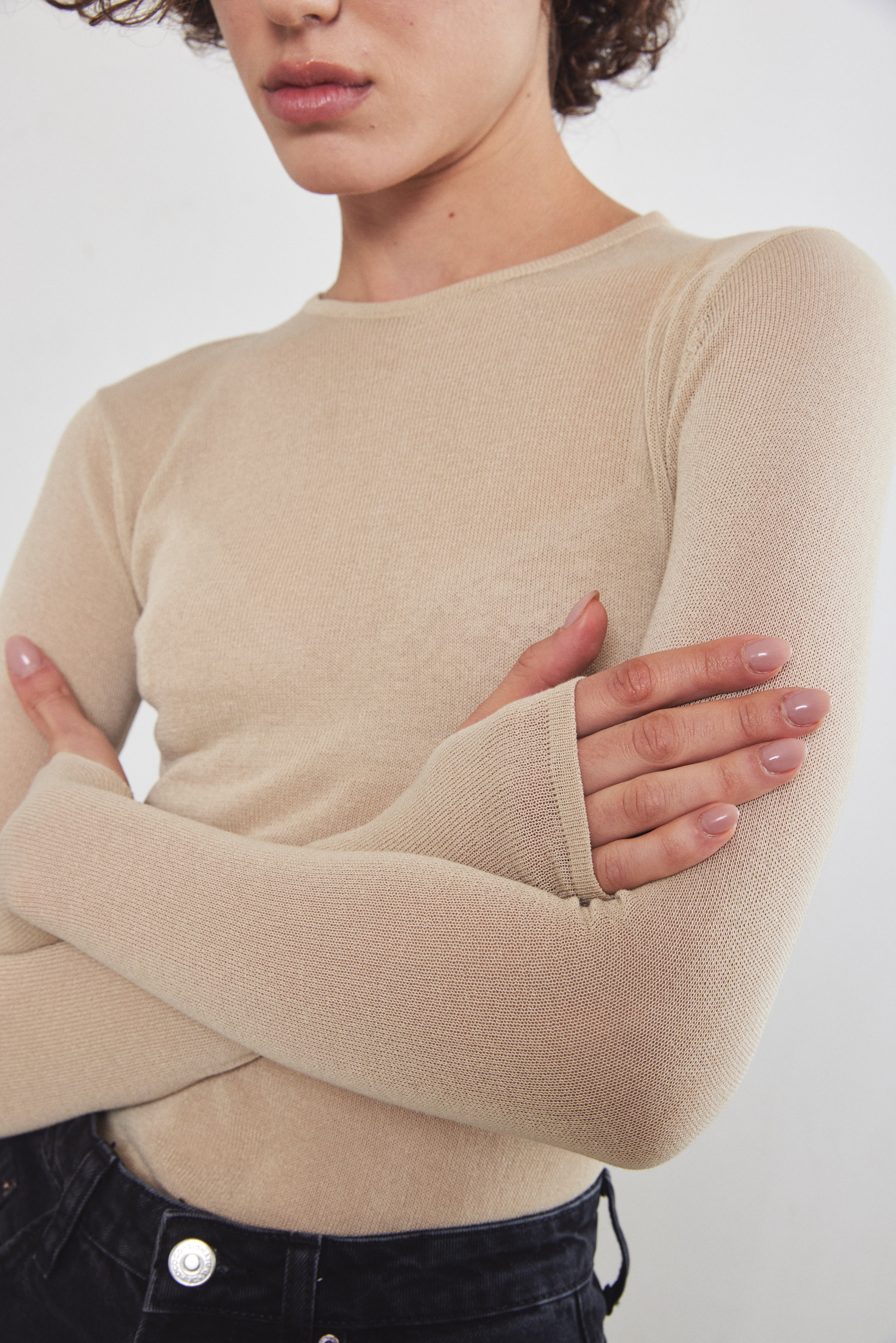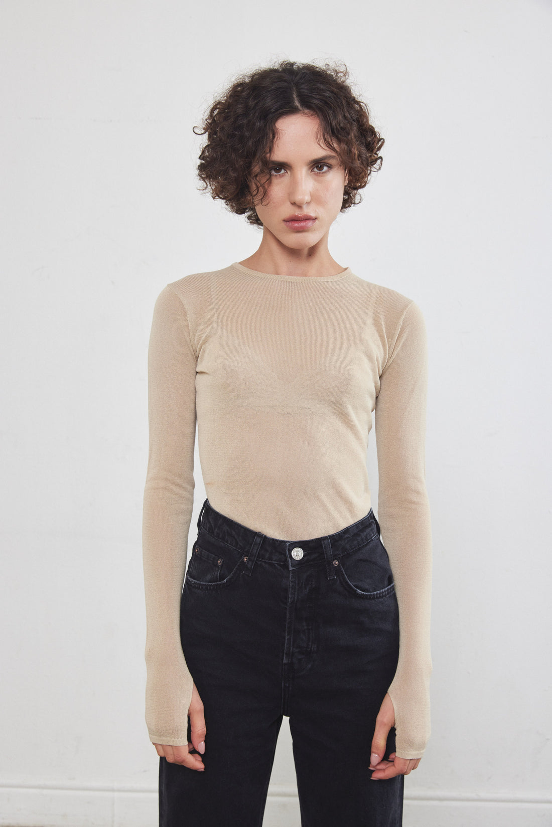 A semi sheer top made from a soft and thin knitted fabric. Features a crew neckline and a close fit. Long sleeves with with thumbholes at the and. Complete the look with black leather pants or denim.