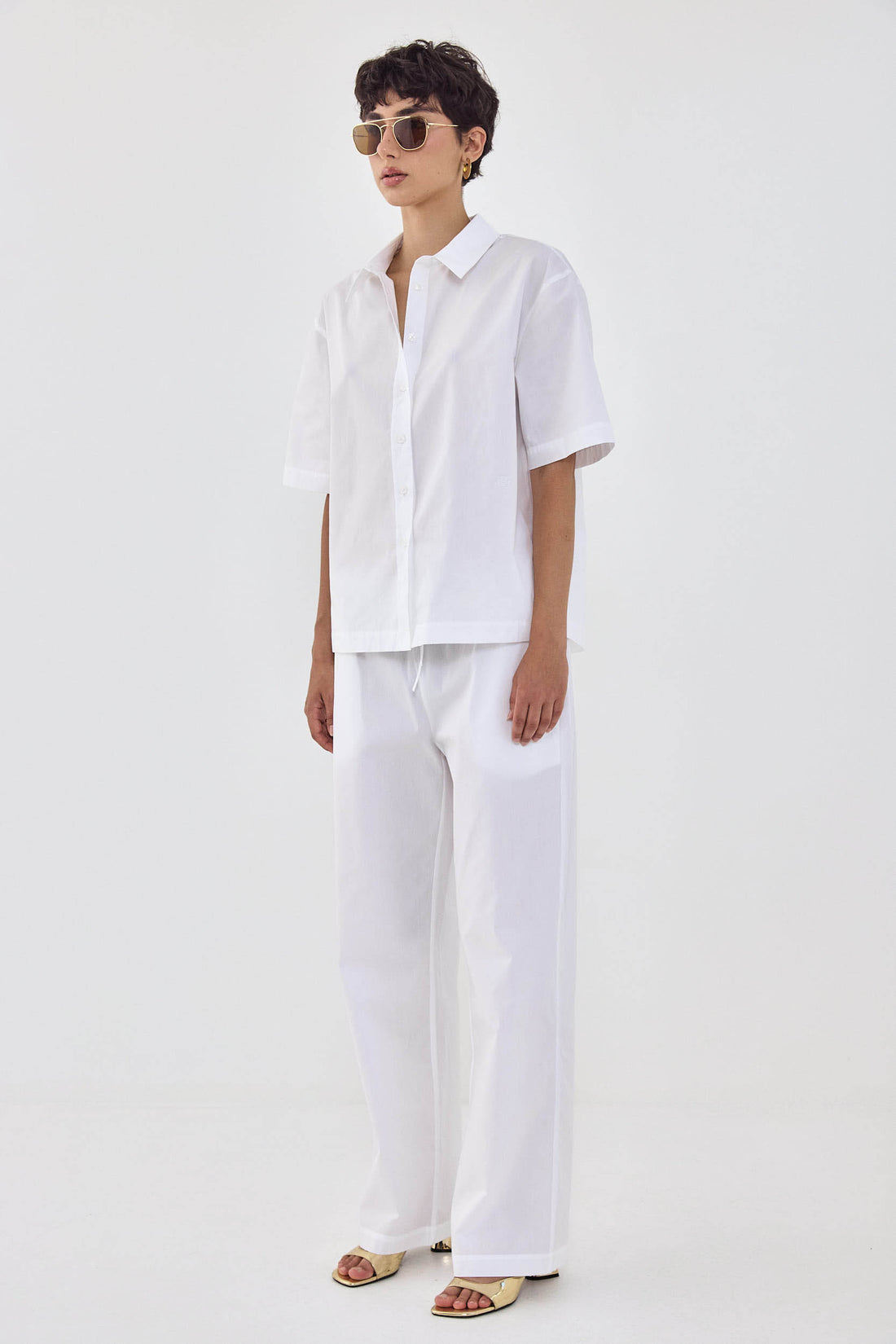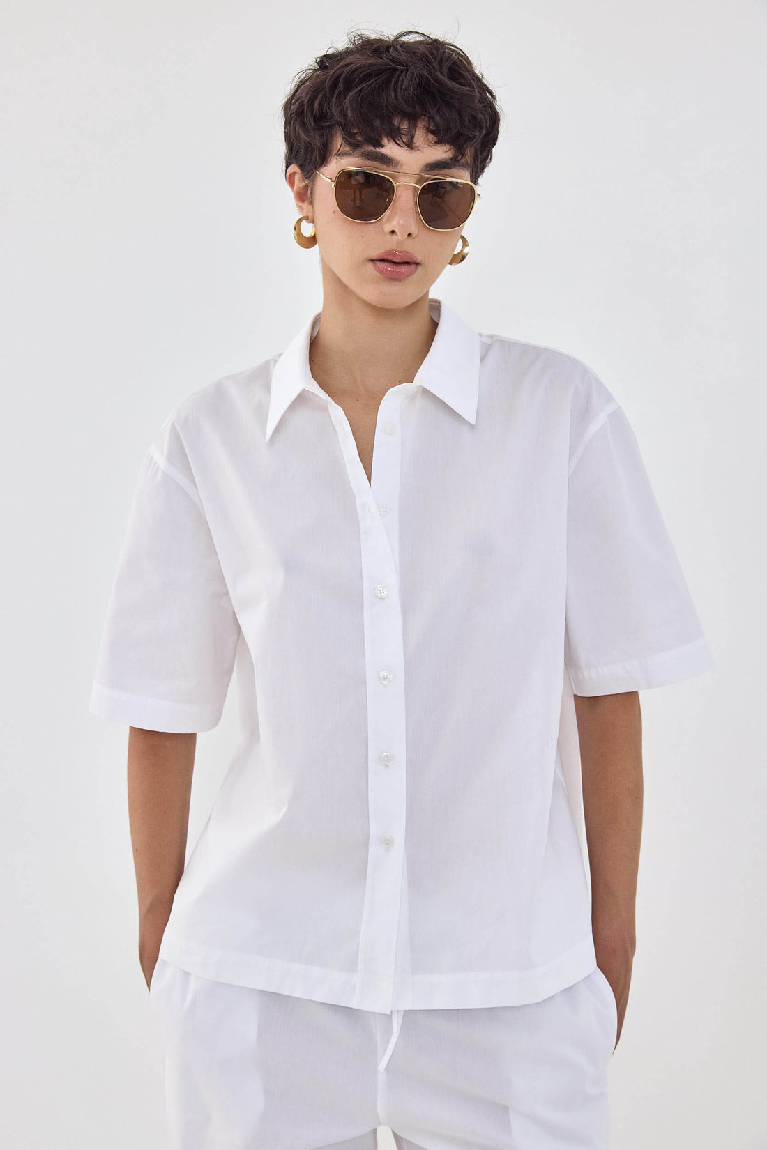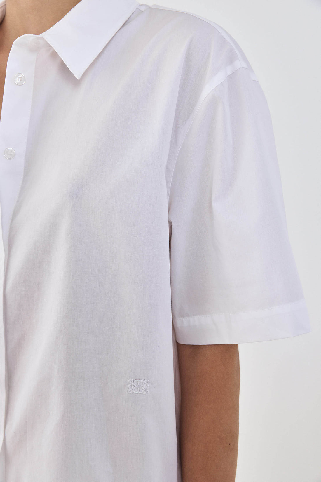 Poplin is this season's most fashionable fabric. A classic twist on a button down, short sleeved. Lapel collar. Crispy poplin fabric. Buttoned frontal closure. Engraved logo detailing buttons. Delicate logo embroidery detailing. Style it with your favorite matching poplin bottom, an easily fashionable set.