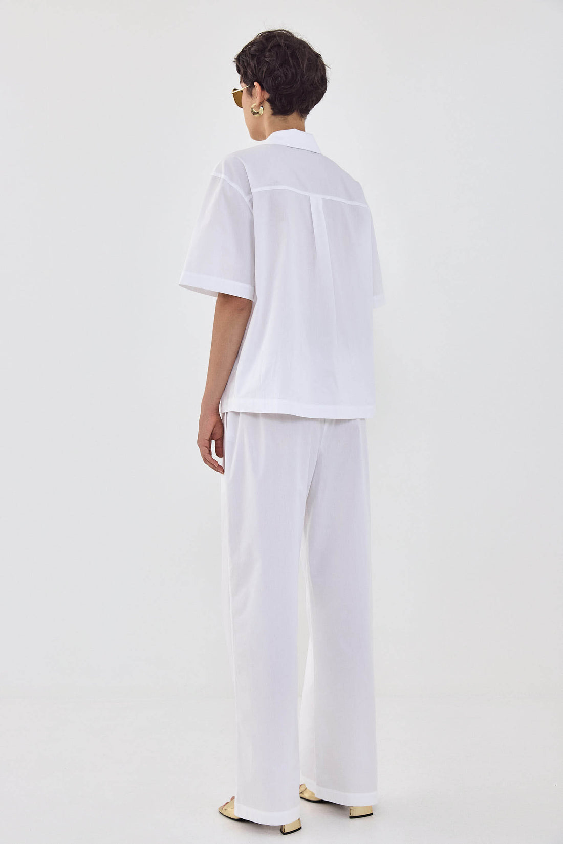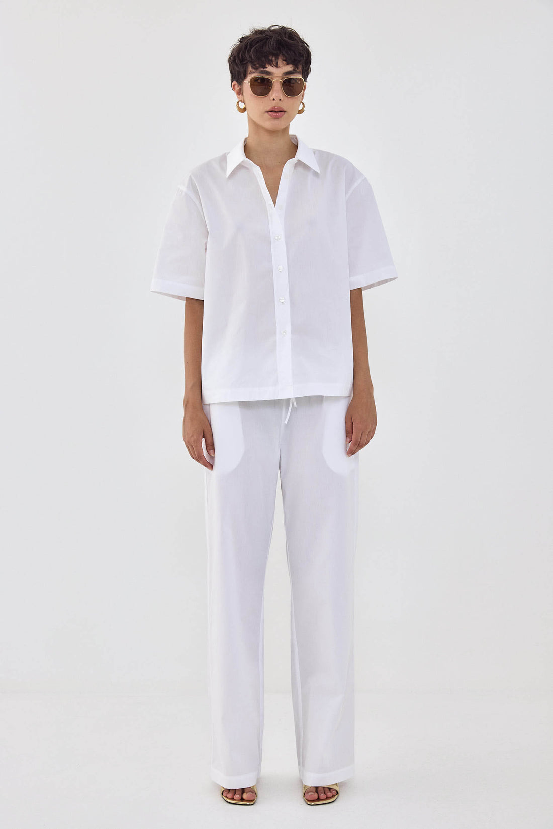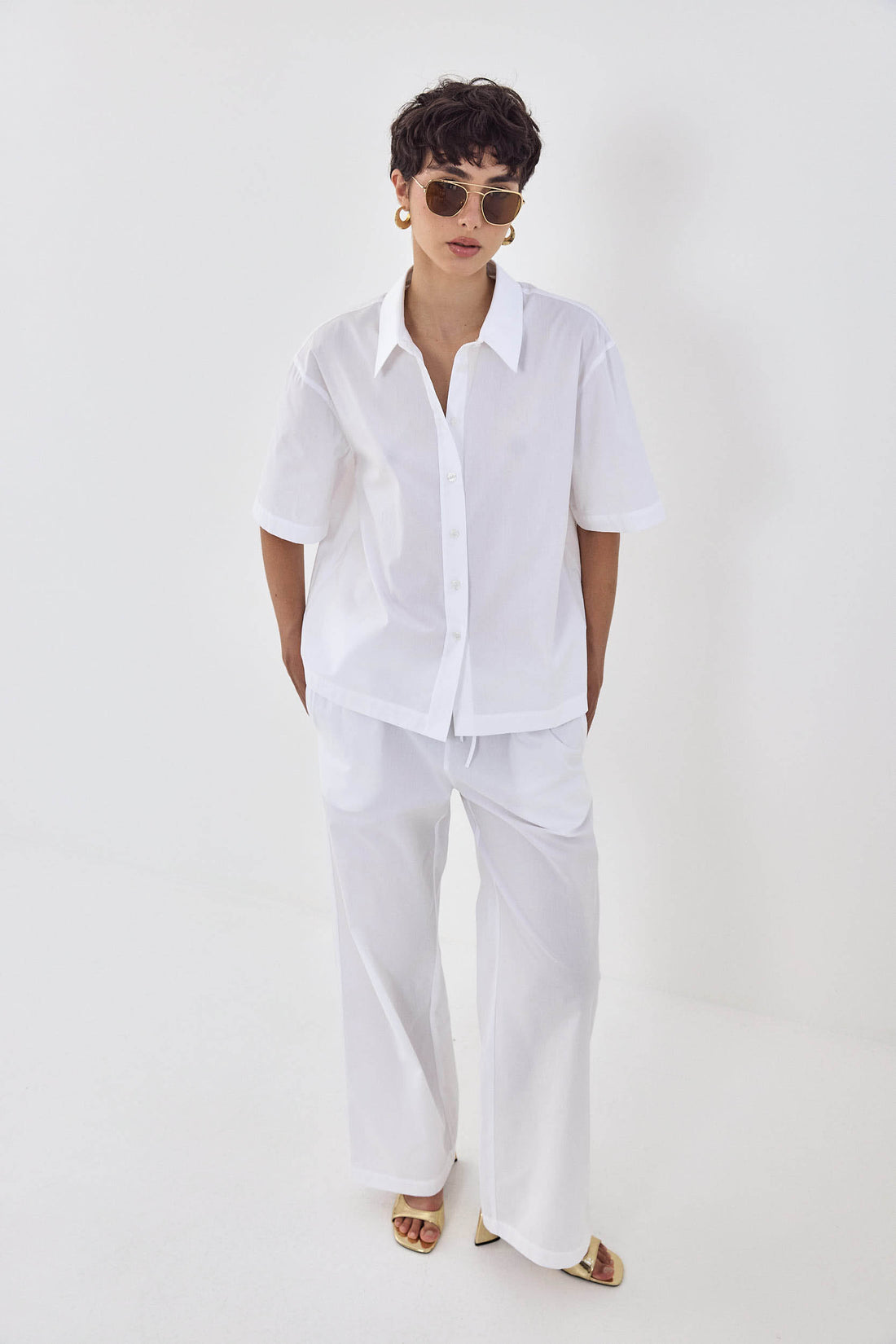 Poplin is this season's most fashionable fabric. A classic twist on a button down, short sleeved. Lapel collar. Crispy poplin fabric. Buttoned frontal closure. Engraved logo detailing buttons. Delicate logo embroidery detailing. Style it with your favorite matching poplin bottom, an easily fashionable set.