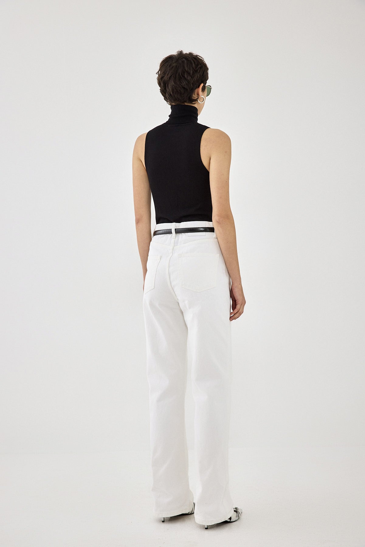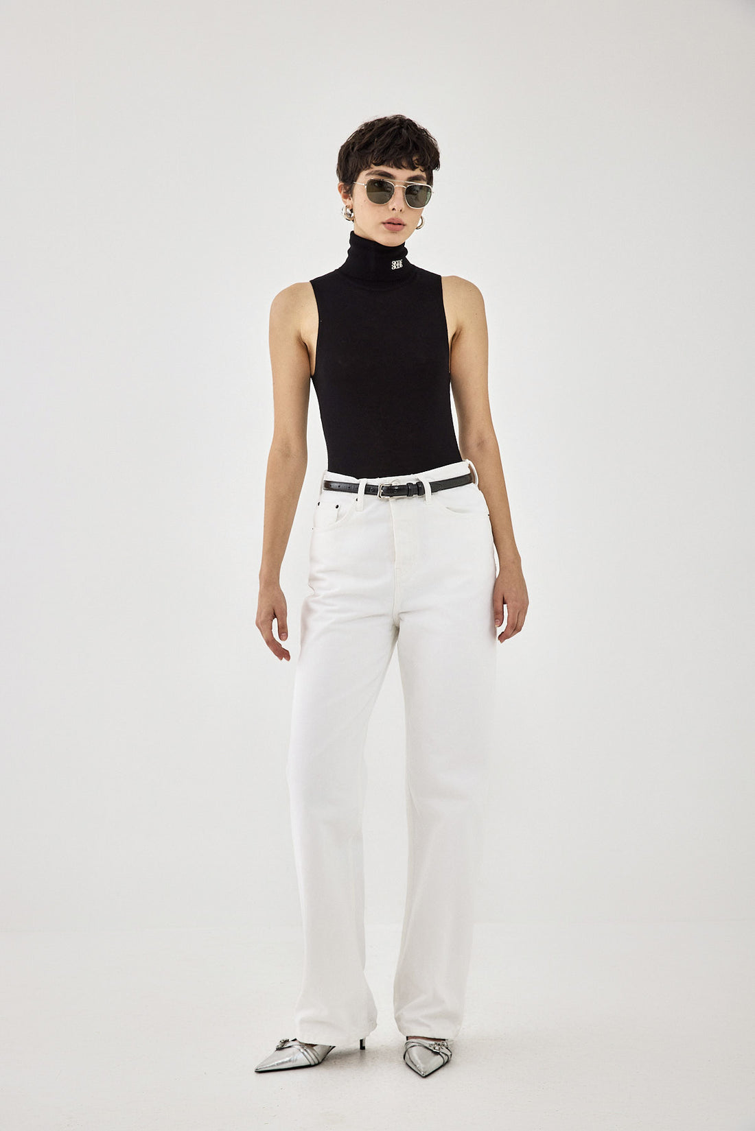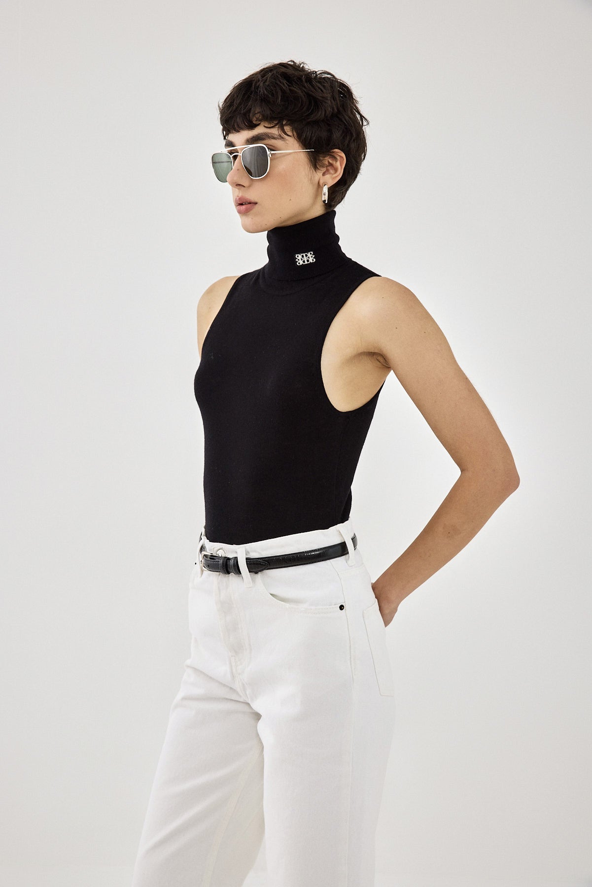 A spring wardrobe essential. Lightweight sleeveless turtleneck. Made from the softest material. Intarsia contrast logo detailing. Style it with your favorite pair of daddy trousers and Croco belt for a sophisticated everyday look.