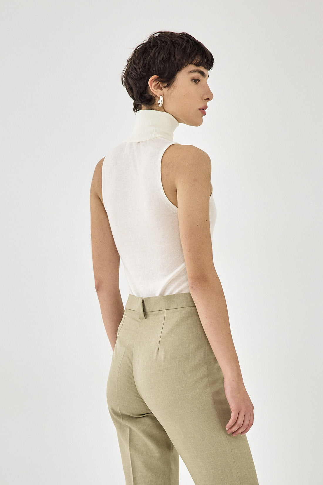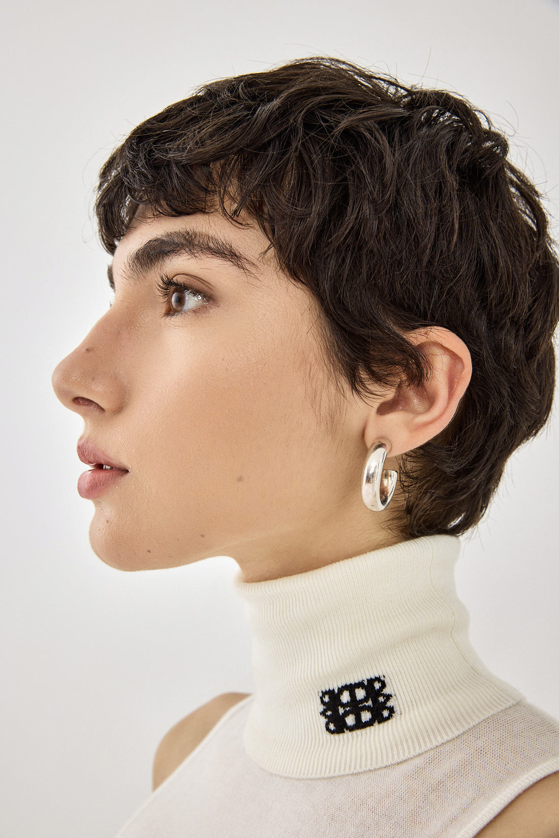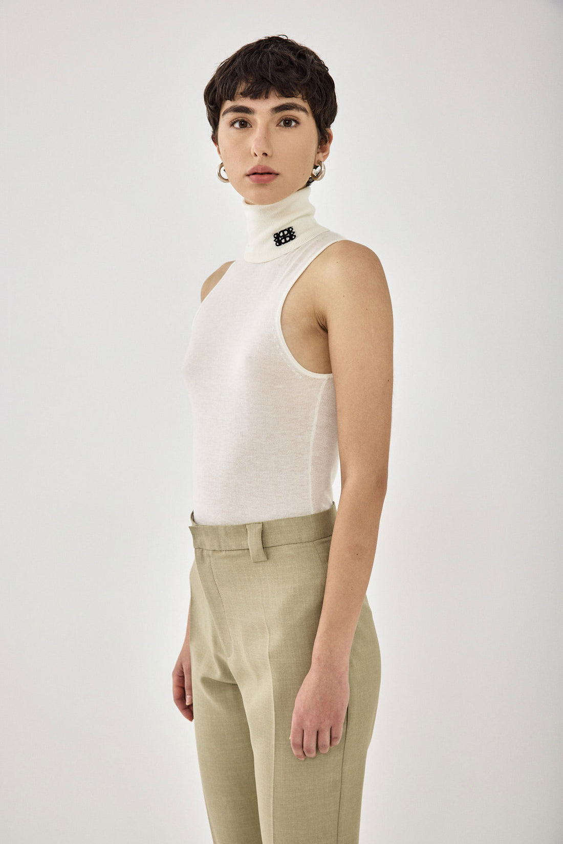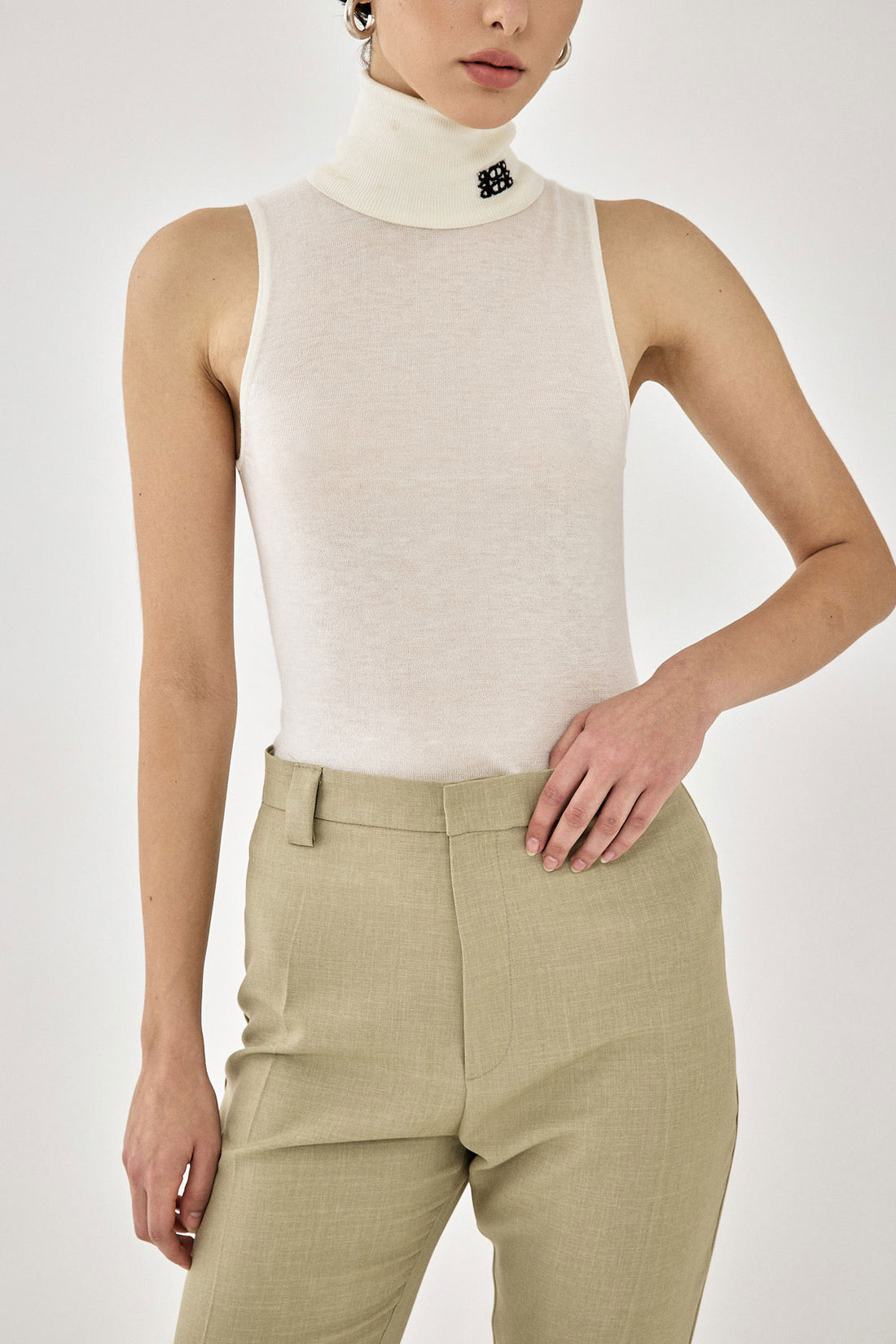 A spring wardrobe essential. Lightweight sleeveless turtleneck. Made from the softest material. Intarsia contrast logo detailing. Style it with your favorite pair of daddy trousers and Croco belt for a sophisticated everyday look.