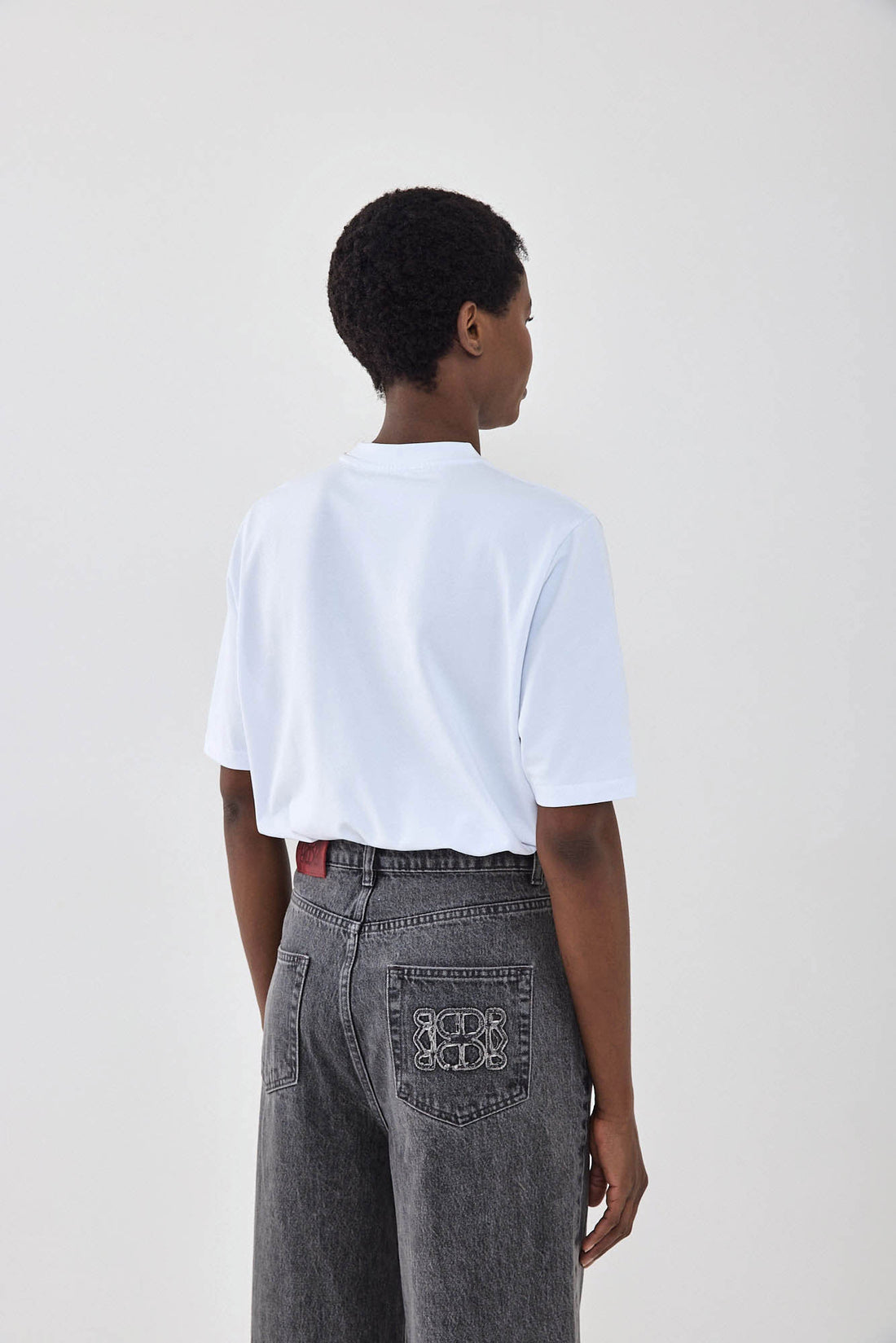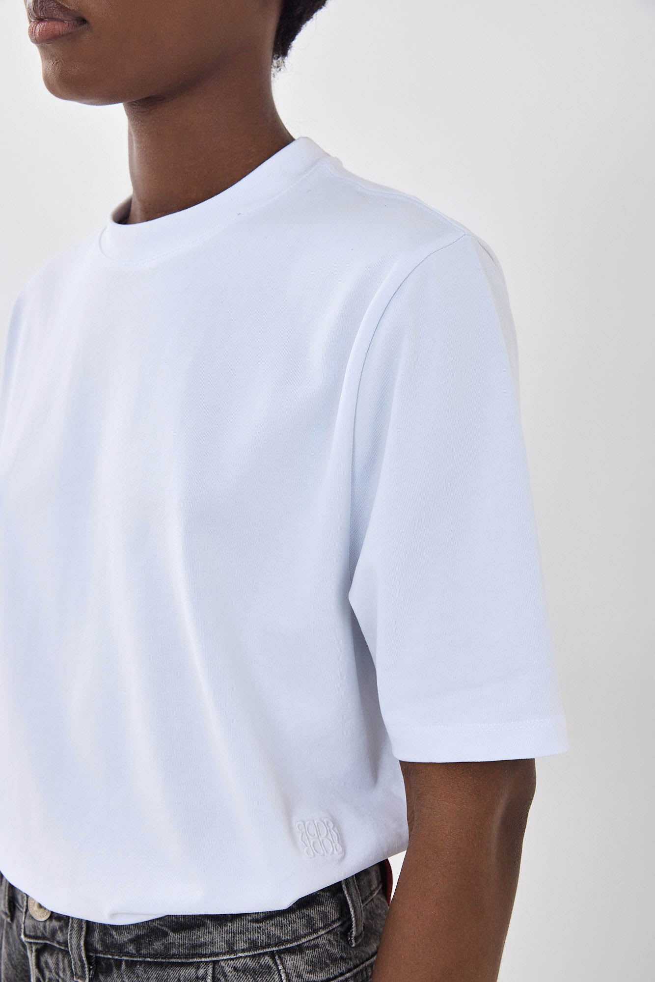 The perfect white tee is an absolute wardrobe essential. This will be your new go to. Crewneck top with ribbed collar. Oversized fit. Short sleeves. Tonal logo detailing on the front of the shirt (towards the bottom). Ribbed material. Style it with your favorite denim, kitten heels and our Croco belt for a stunning summer look.