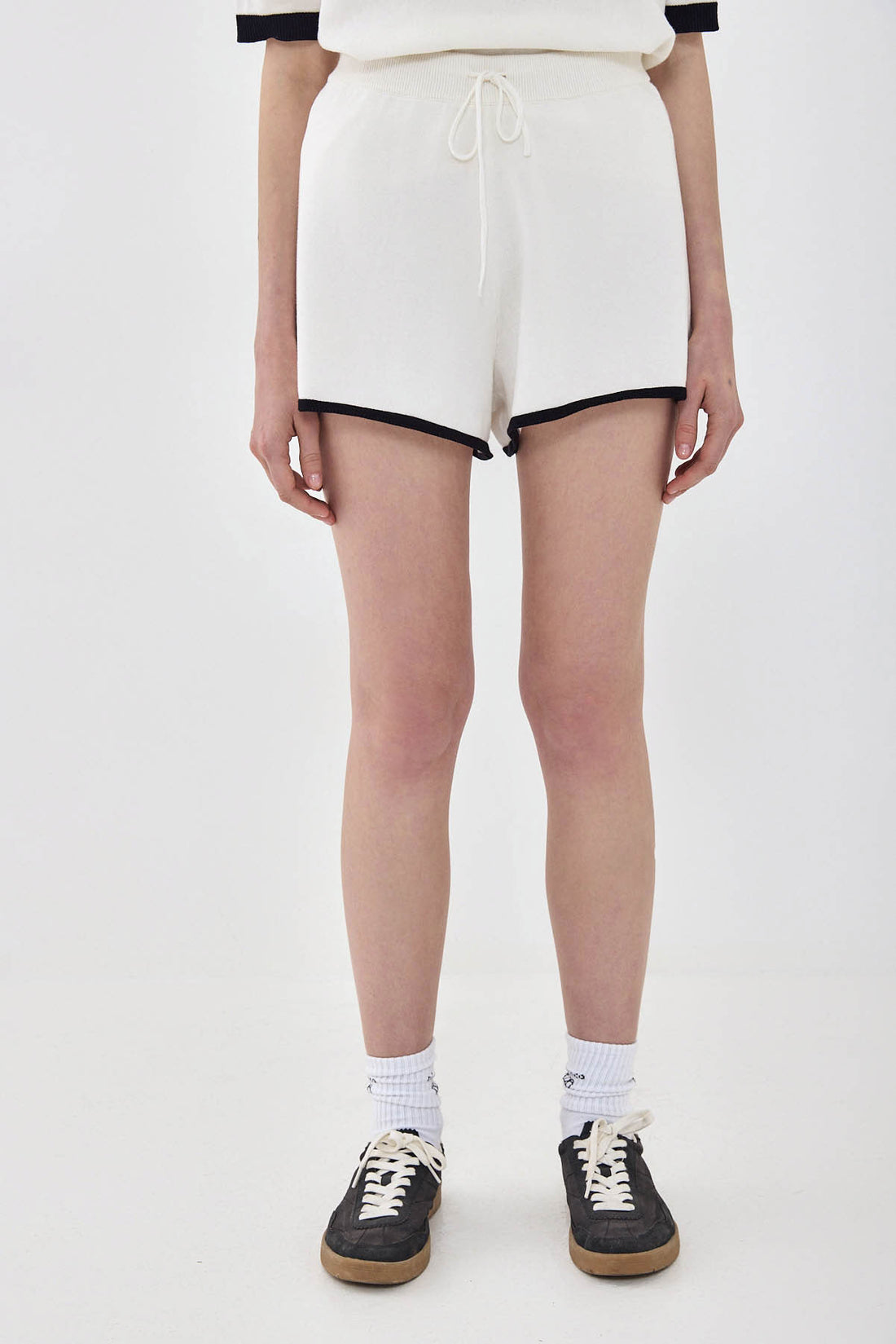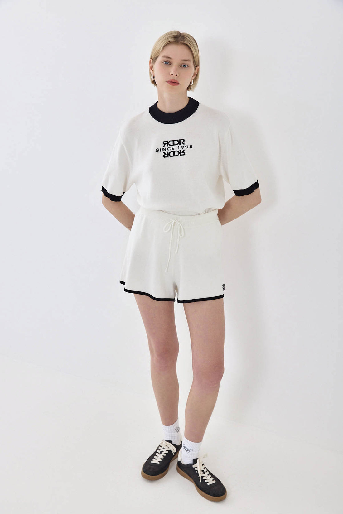 Inspired by the one and only, fashion icon princess Diana. The most stylish and comfy shorts you'll own. Kitted shorts. Elastic ribbed waistband with a drawstring closure. Contrast black stripe ribbed finish. Delicate logo intarsia detailing. Style it with your favorite matching knit top for a stunning everyday look.