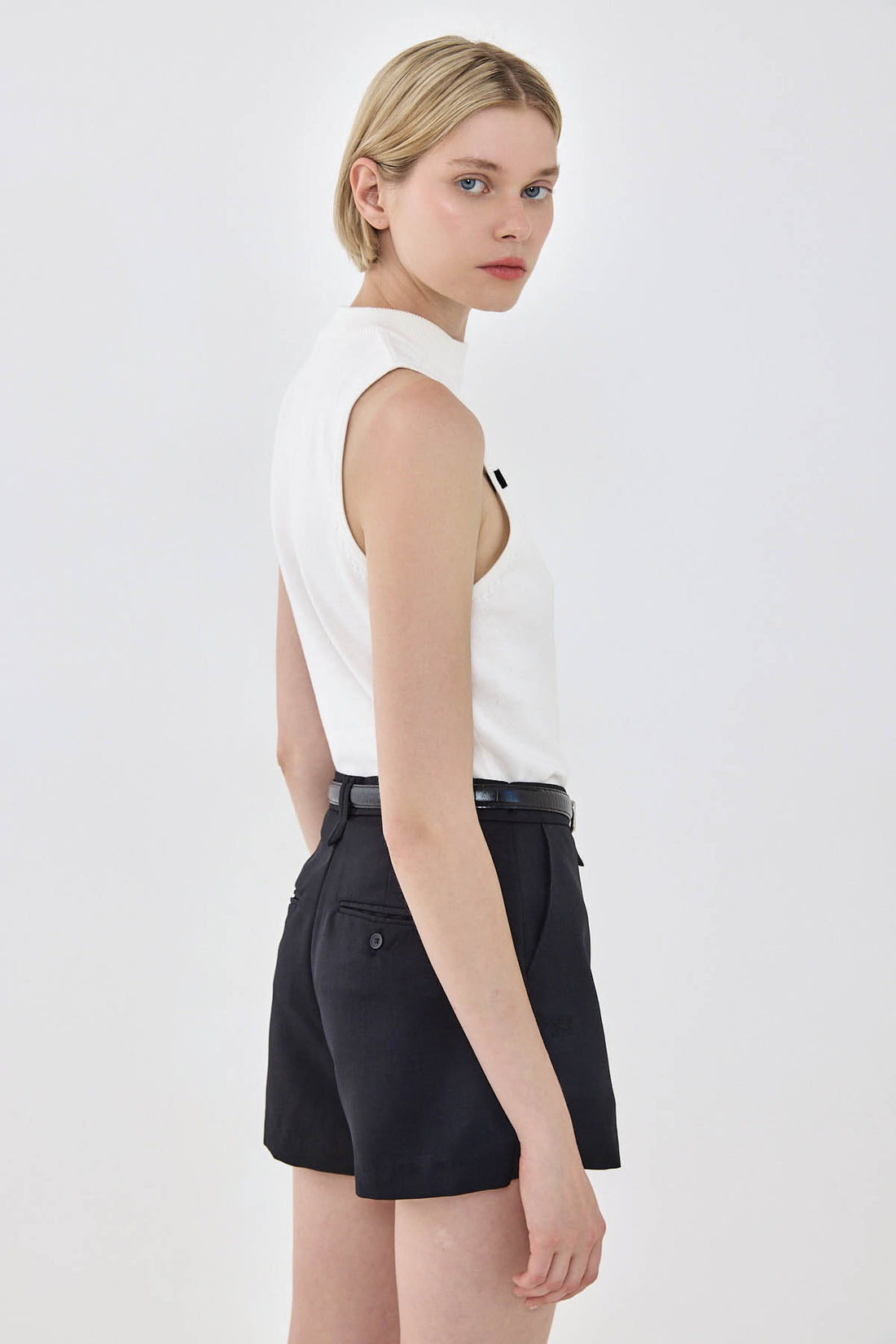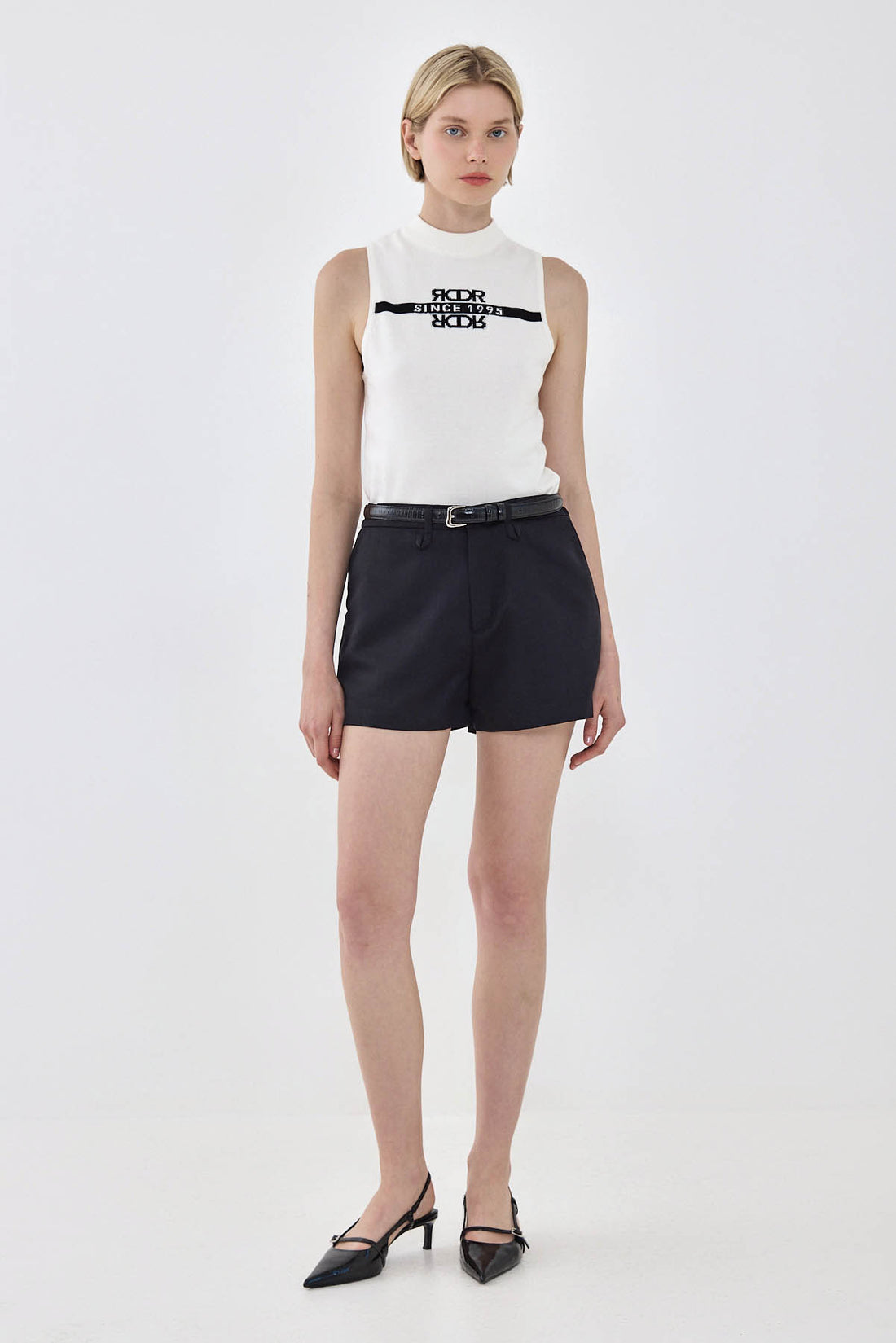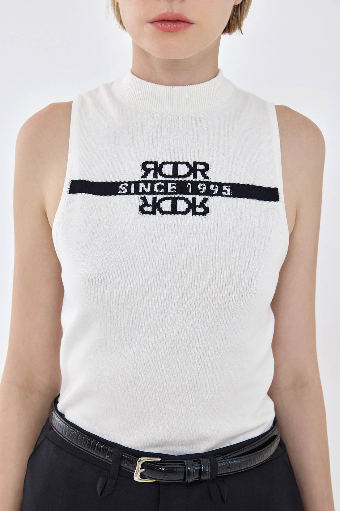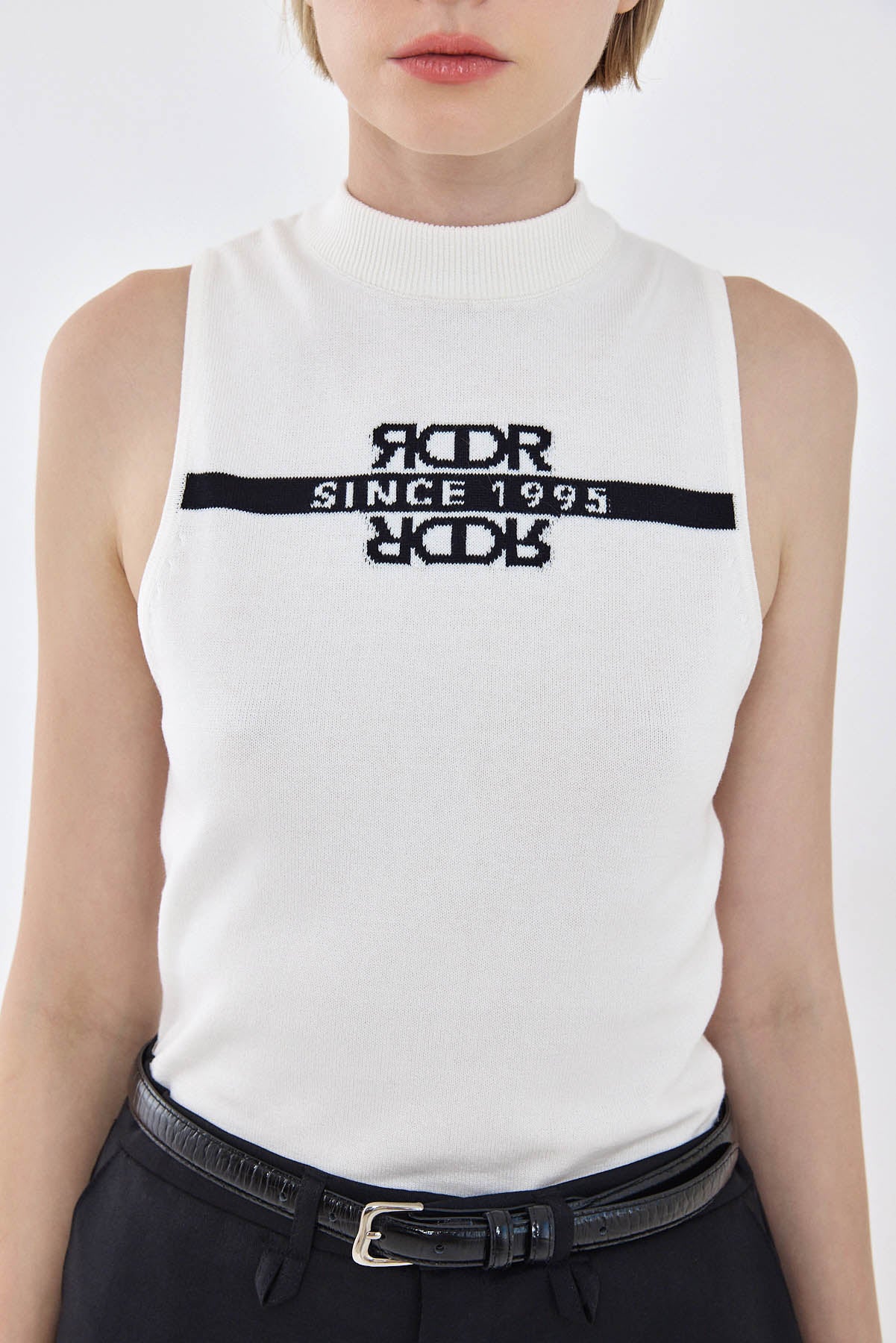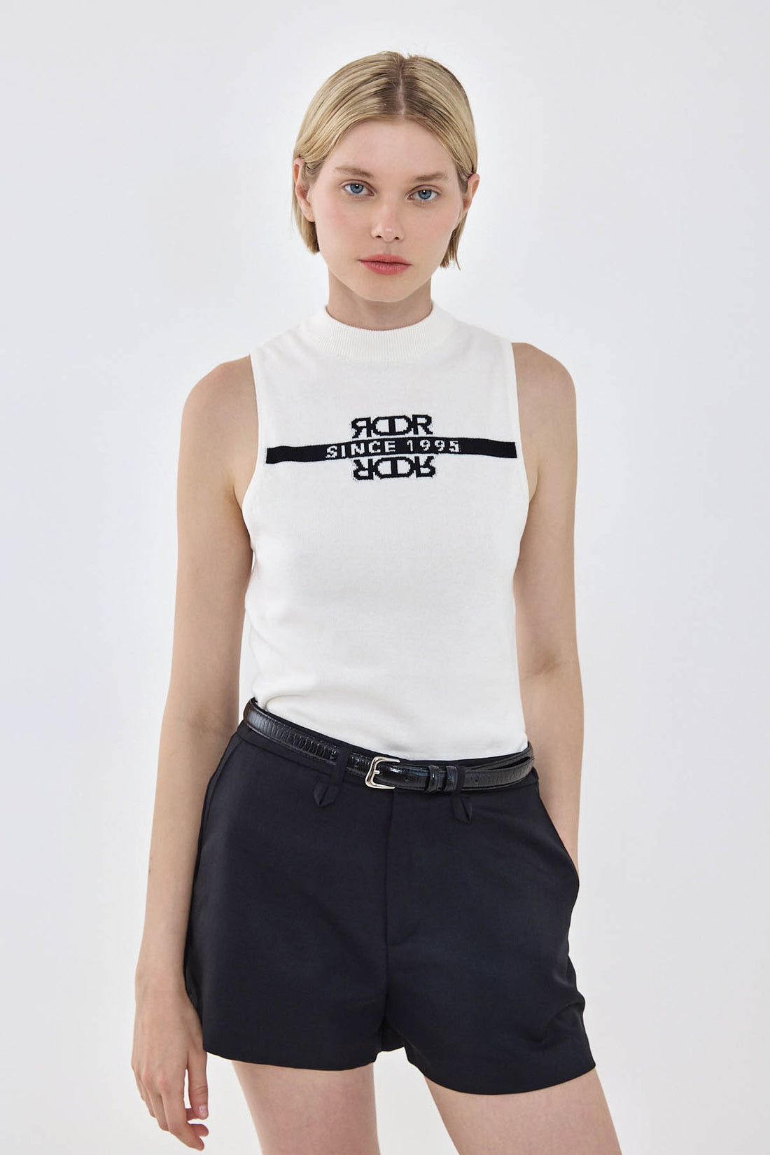 Inspired by the one and only, fashion icon princess Diana. The ultimate transition season top. Ribbed mockneck. Sleeveless tank. Ribbed finish. Precise intarsia detailing at the center. Style it with the matching sporty knit shorts, a pair of sneakers and aviators for the ultimate comfy yet chic look.