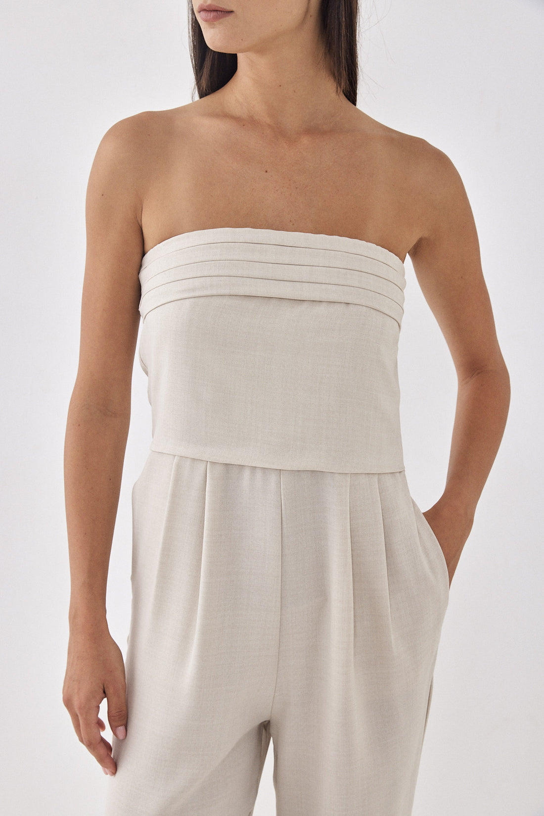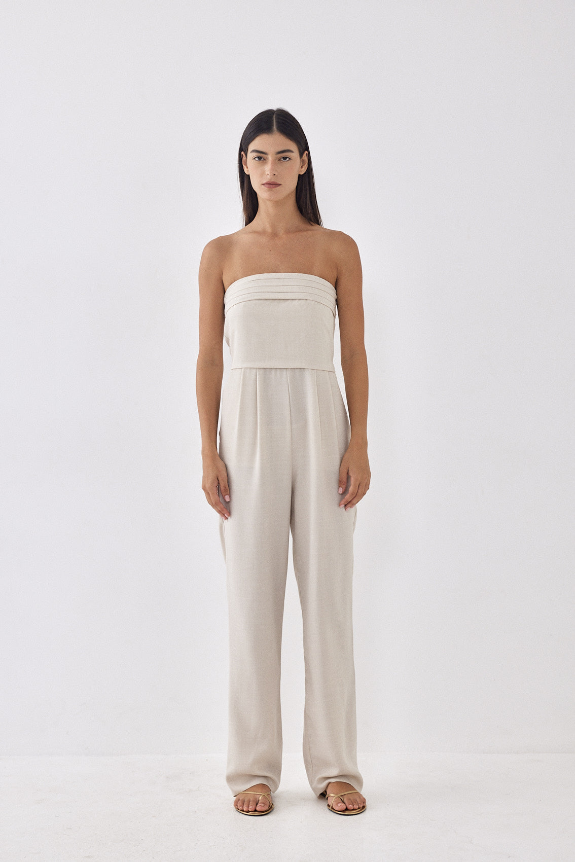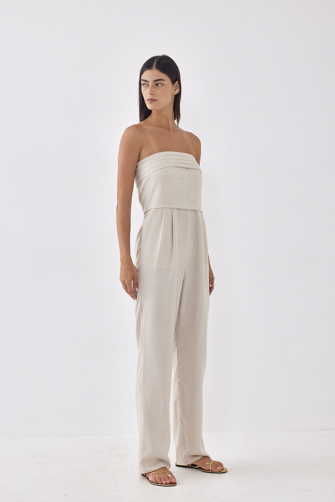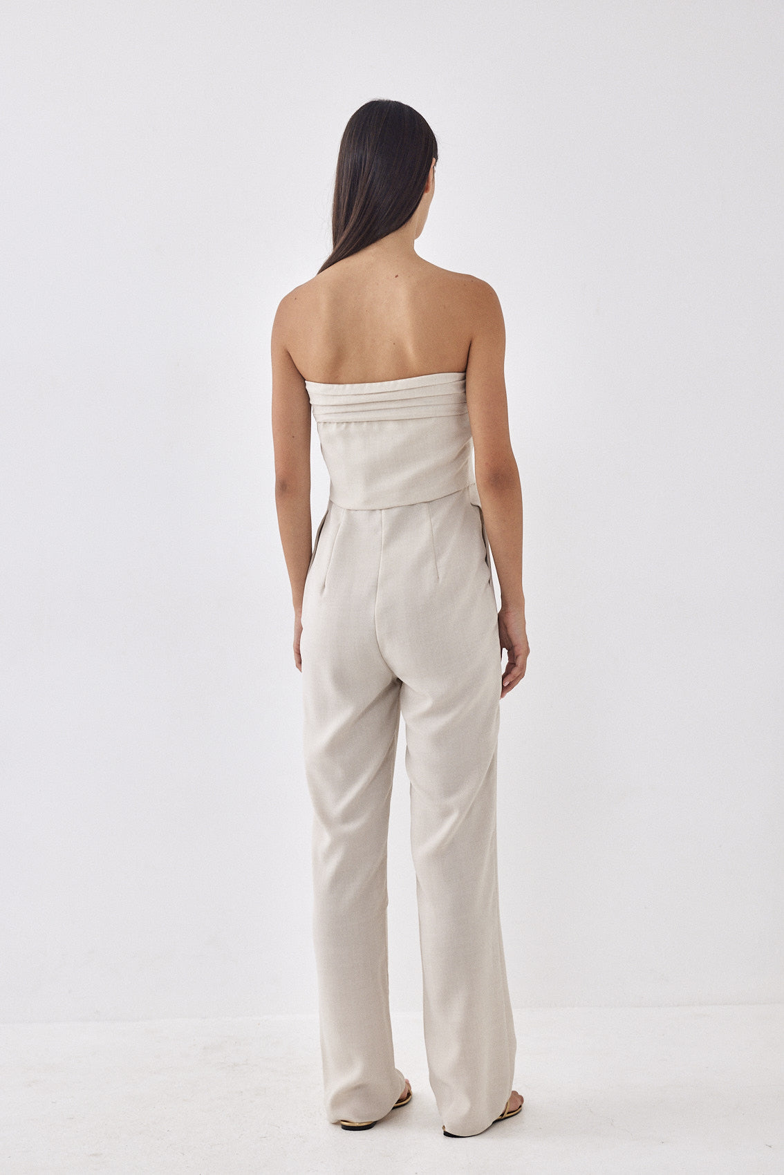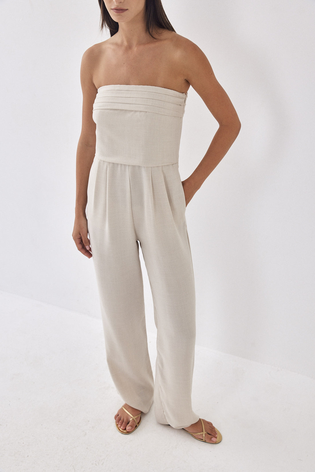 The ultimate lightweight jumpsuit. Featuring pleat detailing. Corset silhouette top with a straight full length leg fit. Two side pockets. Lightweight breathable material, perfect for day-to-night looks. Side zipper closure. Style it with a pair of delicate sandals and earring studs for a gorgeous effortless look, perfect for your next holiday.