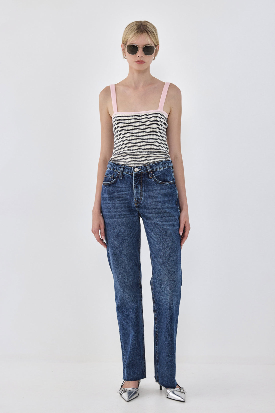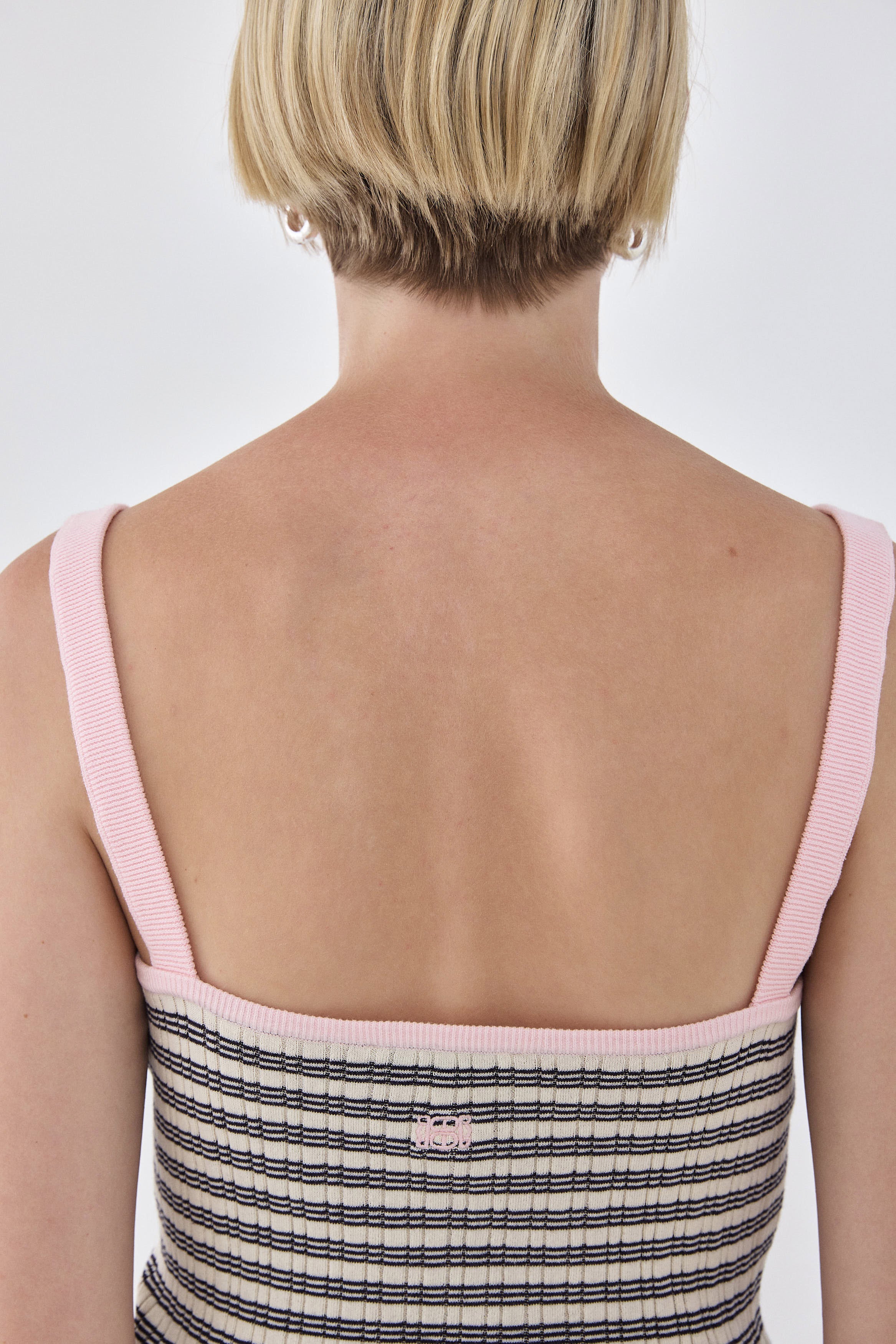 The perfect striped tank is an absolute summer essential. Cami tank top. Straight neckline. Ribbed fabric. Delicate contrast logo embroidery detailing on the front. Ribbed finish. Delicate sheer. Style it with your favorite oversized wide leg denim, a pair of Mary Janes and your favorite purse for a chic everyday look.