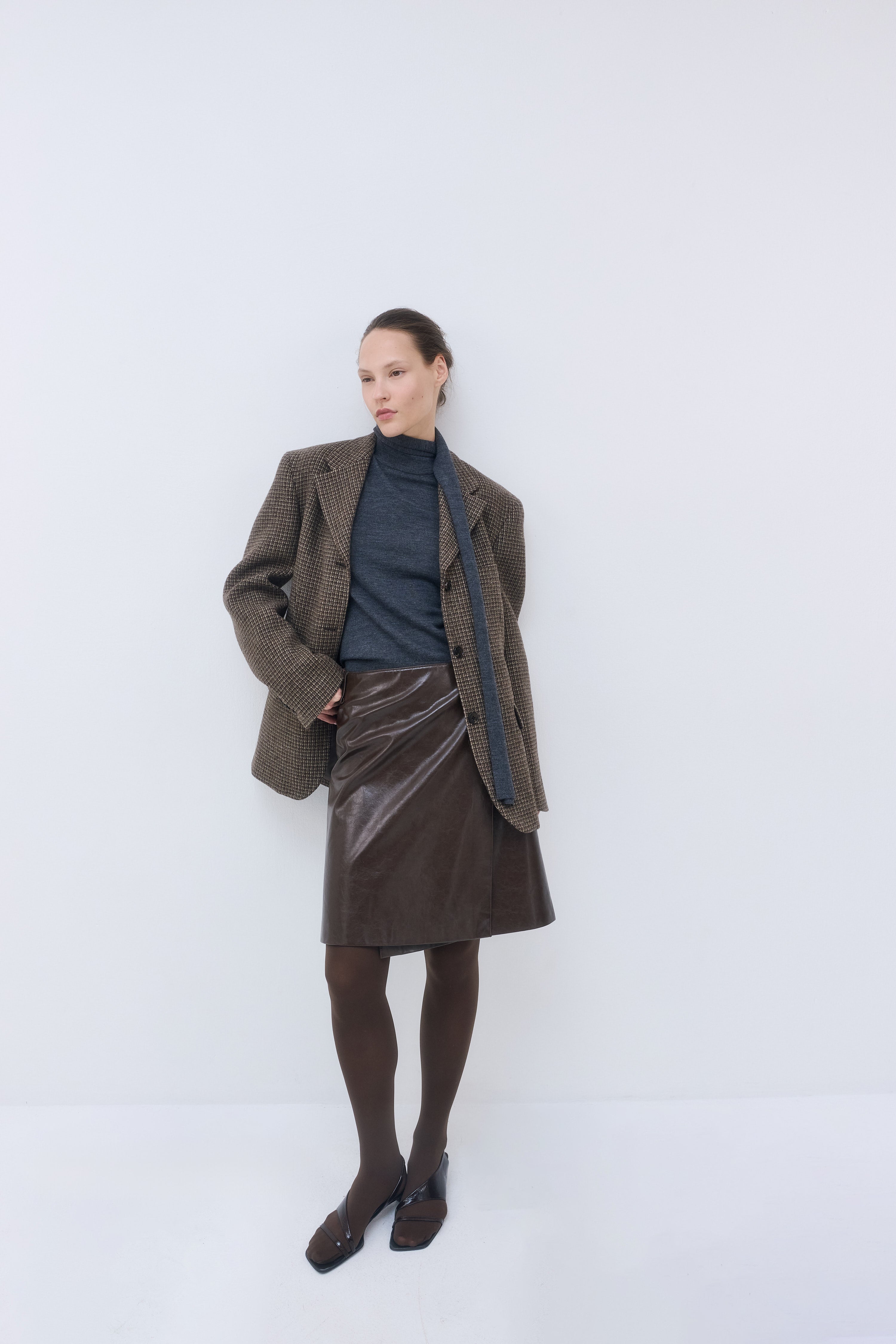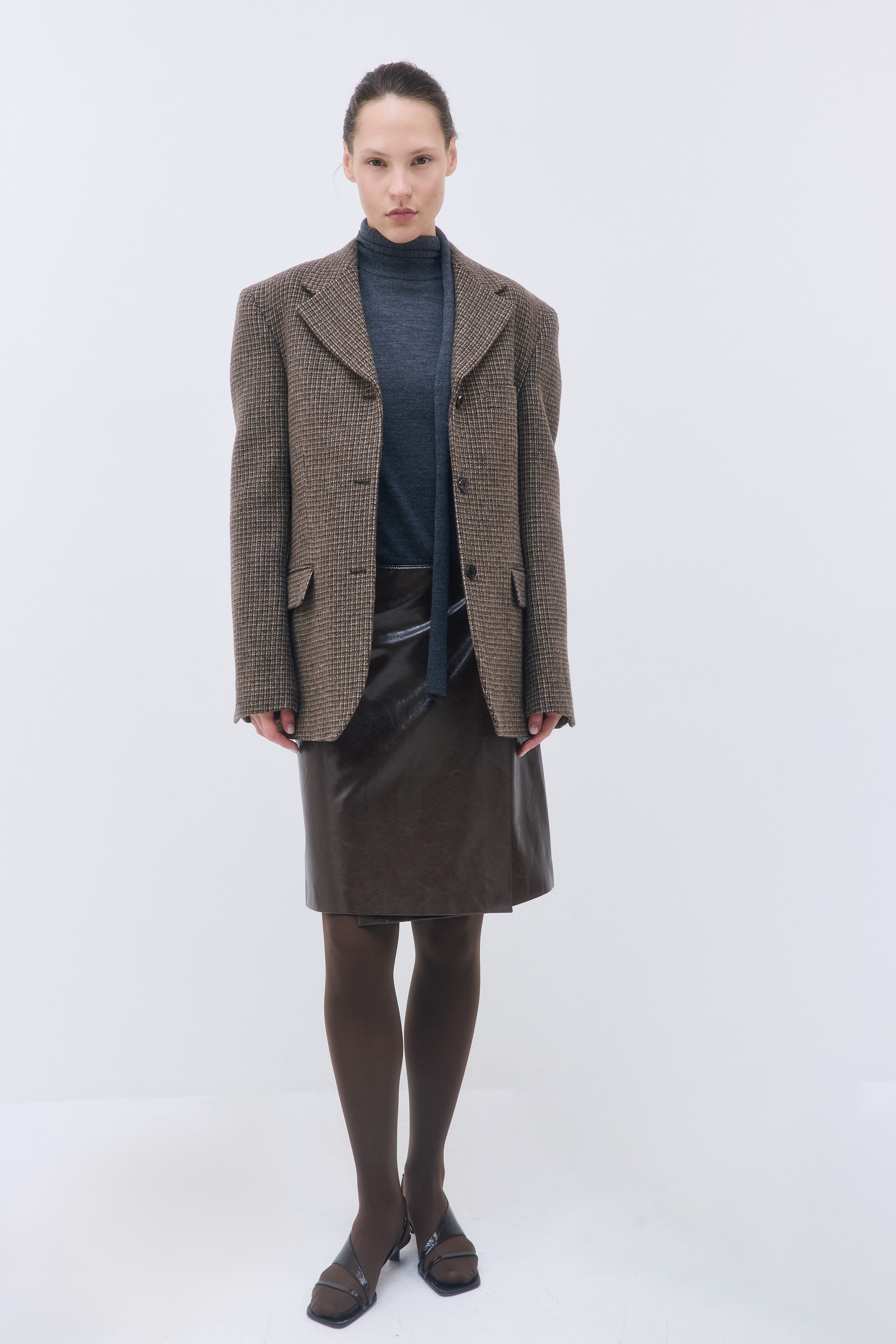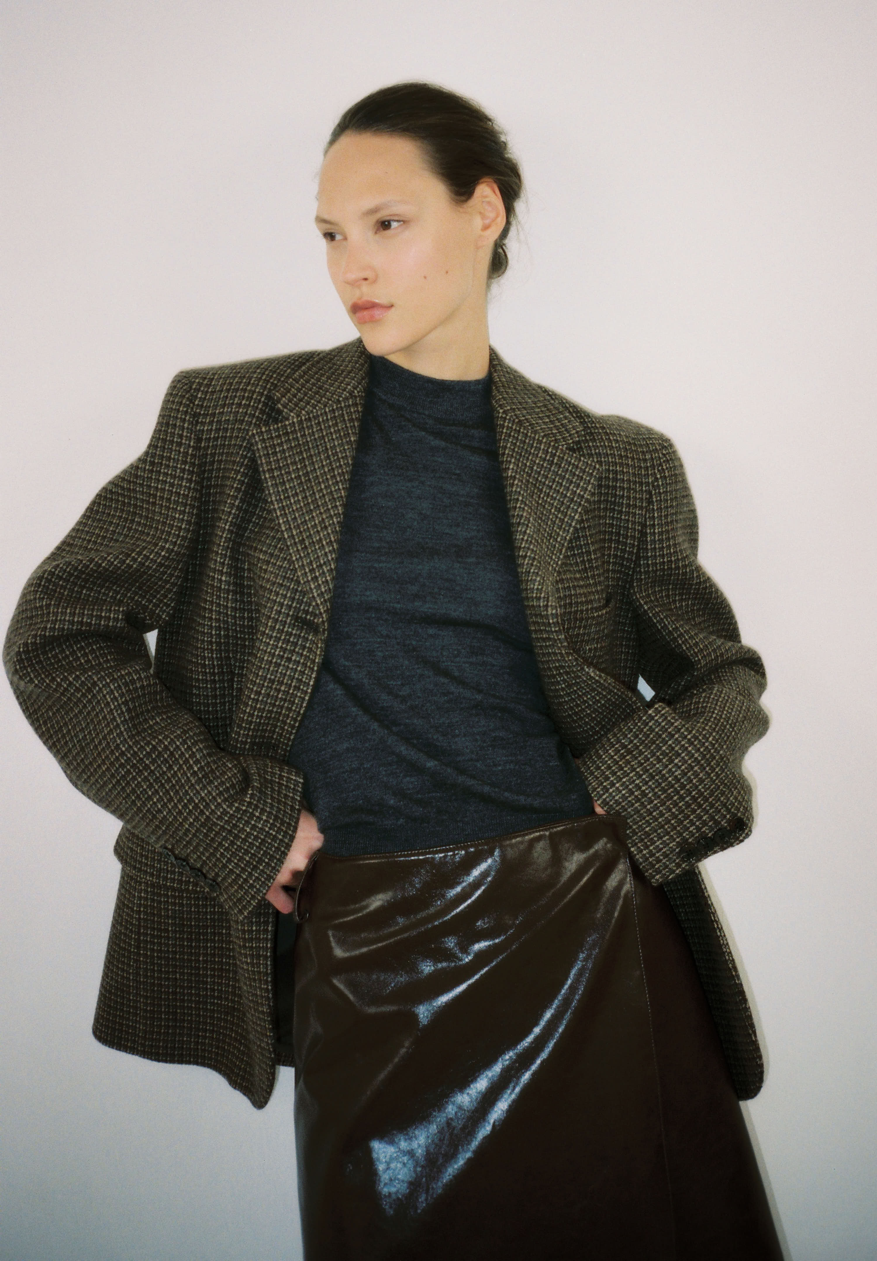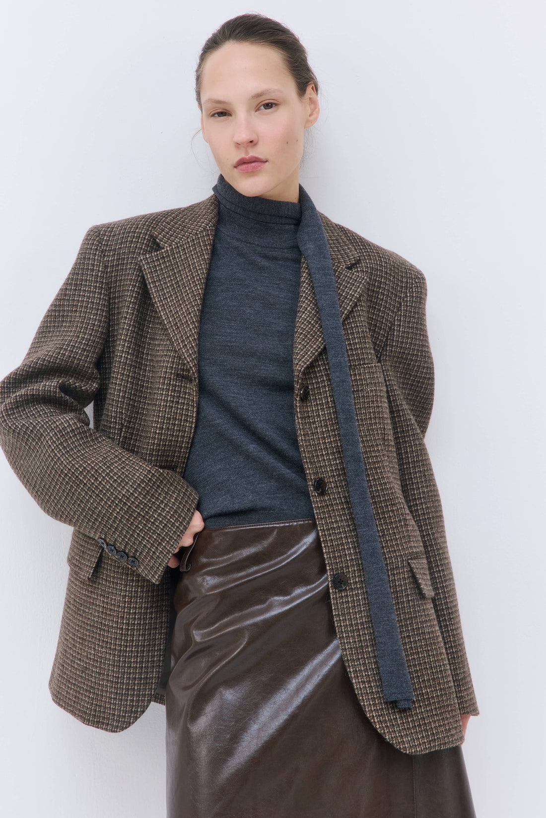 Released as part of our limited edition winter collection; A classic blazer like jacket. Oversized fit. Complete with a lapel collar. Featuring two front flap pockets. Tonal, dark brown buttons. All-over brown plaid pattern. Tonal embroidered logo. Fully lined. Detailed with two side pockets. Style it with our new, classic Fitted Thin Wool Long Sleeve and iconic No. 15 Denim for a sleek winter look.