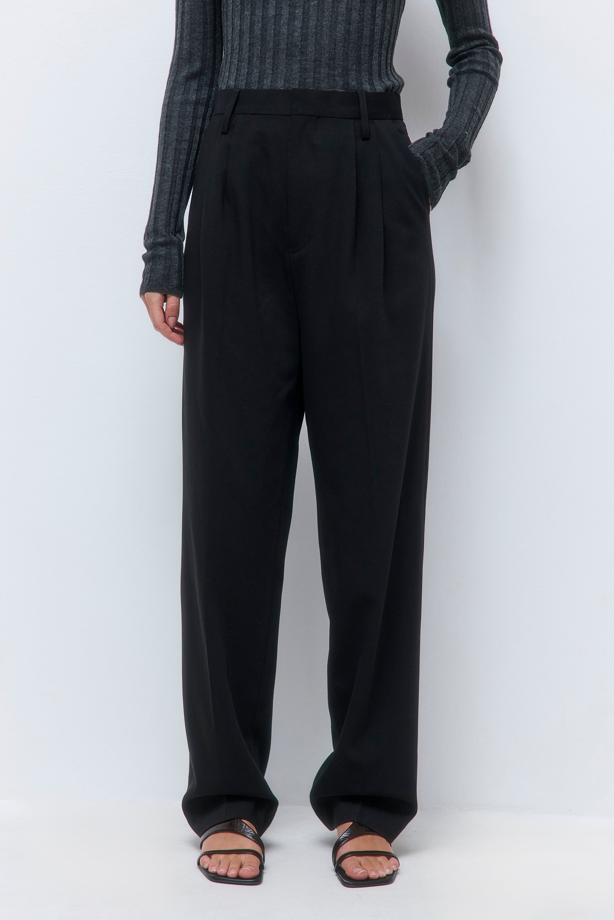 Welcoming new, timeless pieces to our iconic Daddy collection. The ultimate day-to-night pant. High waisted. Tapered leg. Full length pant. Featuring two front pleats. Two side pockets. Zipper closure with inner hook. Half-lined. Tonal embroidered logo on the back. Includes back pockets. Style it with our luscious Classic Long Sleeve T Shirt and our sleek new Double Breasted Daddy Blazer for a sophisticated, yet comfortable look.