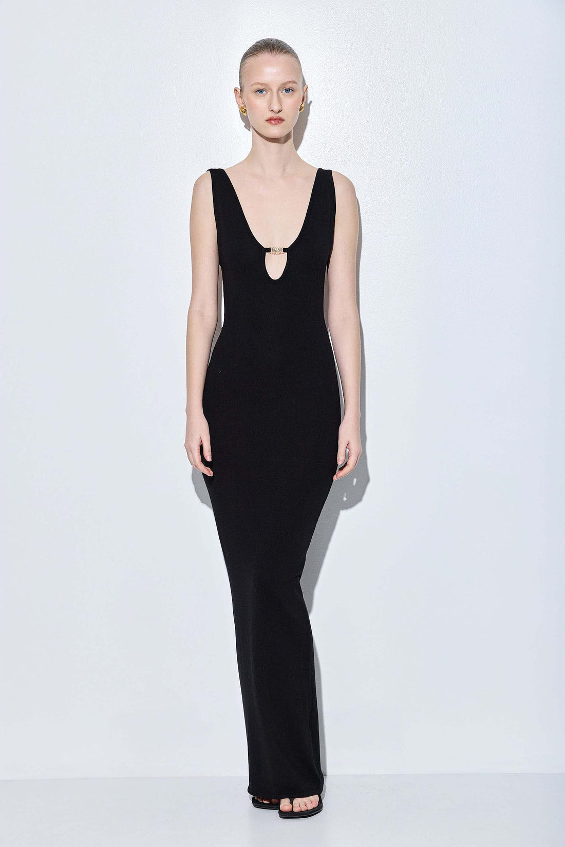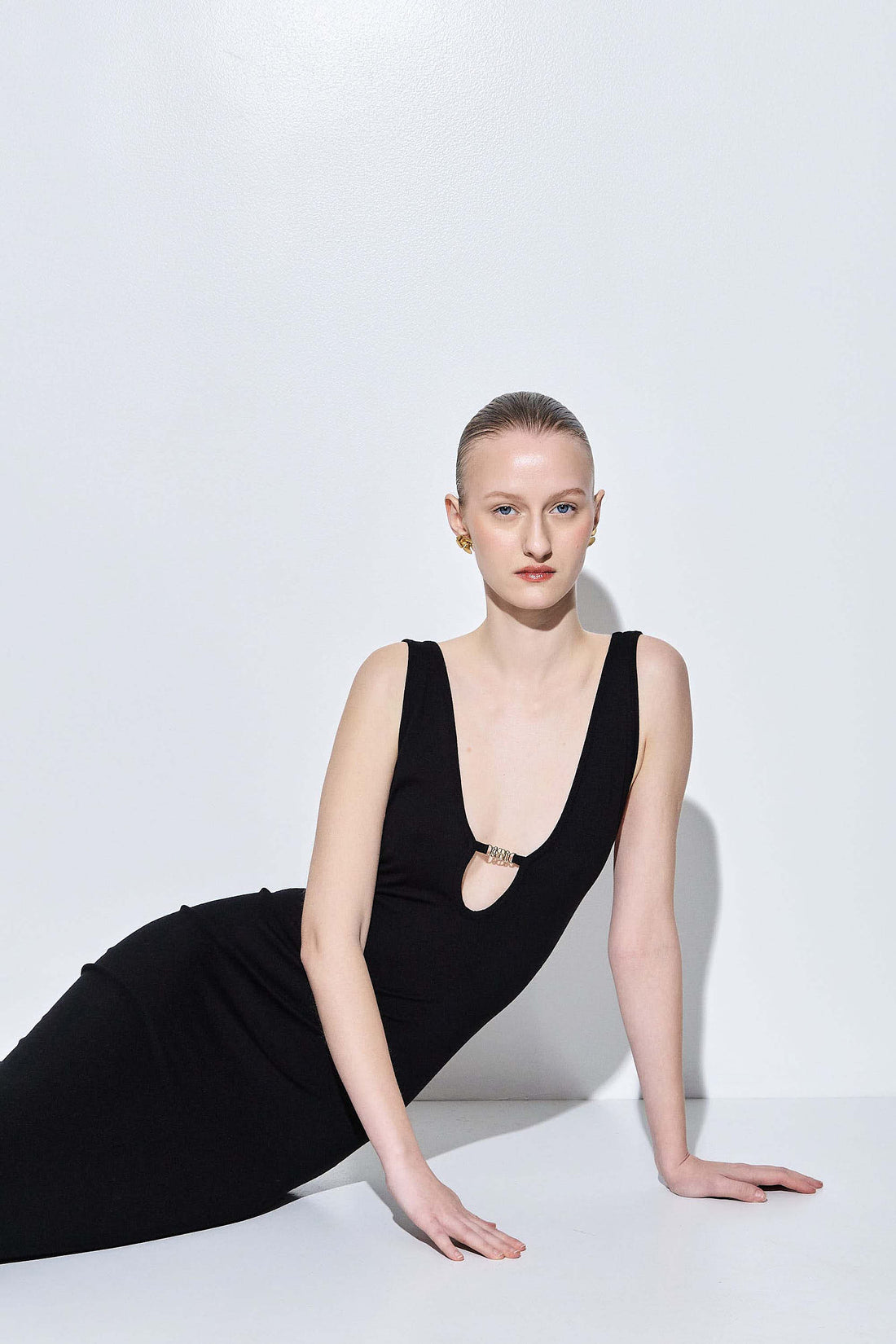 Our new V neck buckle maxi dress is a is the ultimate wardrobe must-have. Sleevleess. Fitted silhouette. Clean Finish. Fully fashioned. Soft and slightly stretchy fabric that hugs the body. Featuring a deep v neck and buckled cut out at the front center. elegant open back with delicate gold logo buckle details. Style it with our beautiful tailored daddy blazer for a classy and sophisticated look.