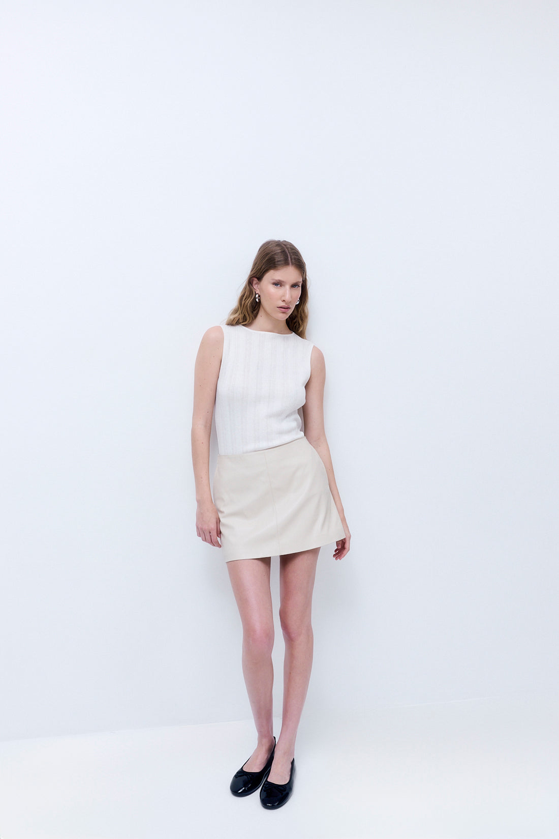 An effortless addition to your winter closet. Sits between mid and high waisted. Subtle A-line silhouette that stays structured without flaring out too much. Padded. Featuring side seam pockets and a discreet back zipper. Finished with an embossed tonal logo on the back. Style it with our iconic Stitch Detail Vegan Leather Jacket and pair those with our sleek Oval Sunglasses for a polished look.