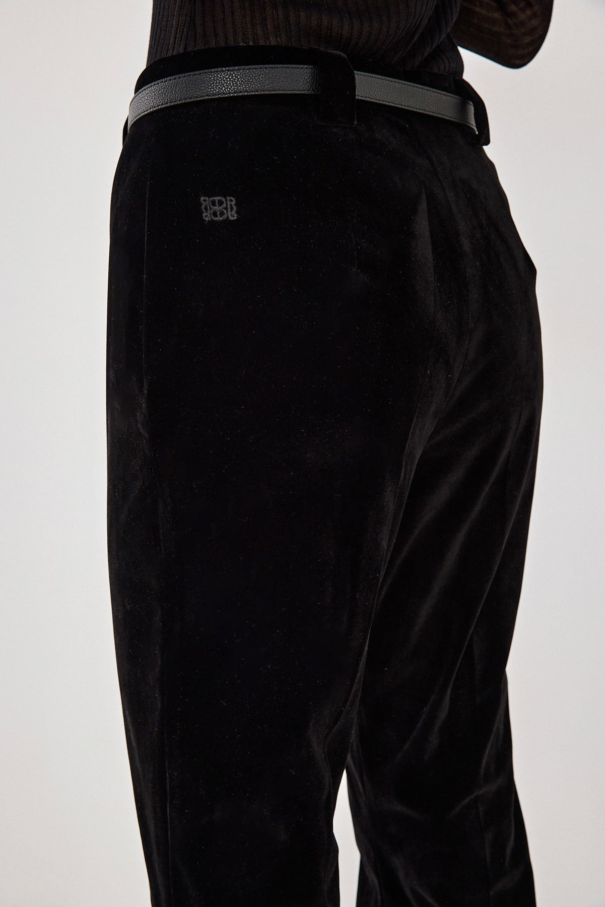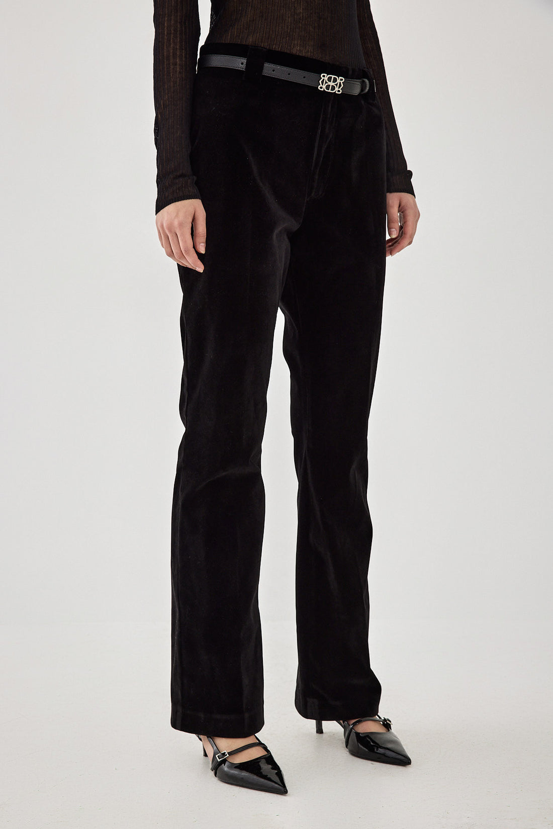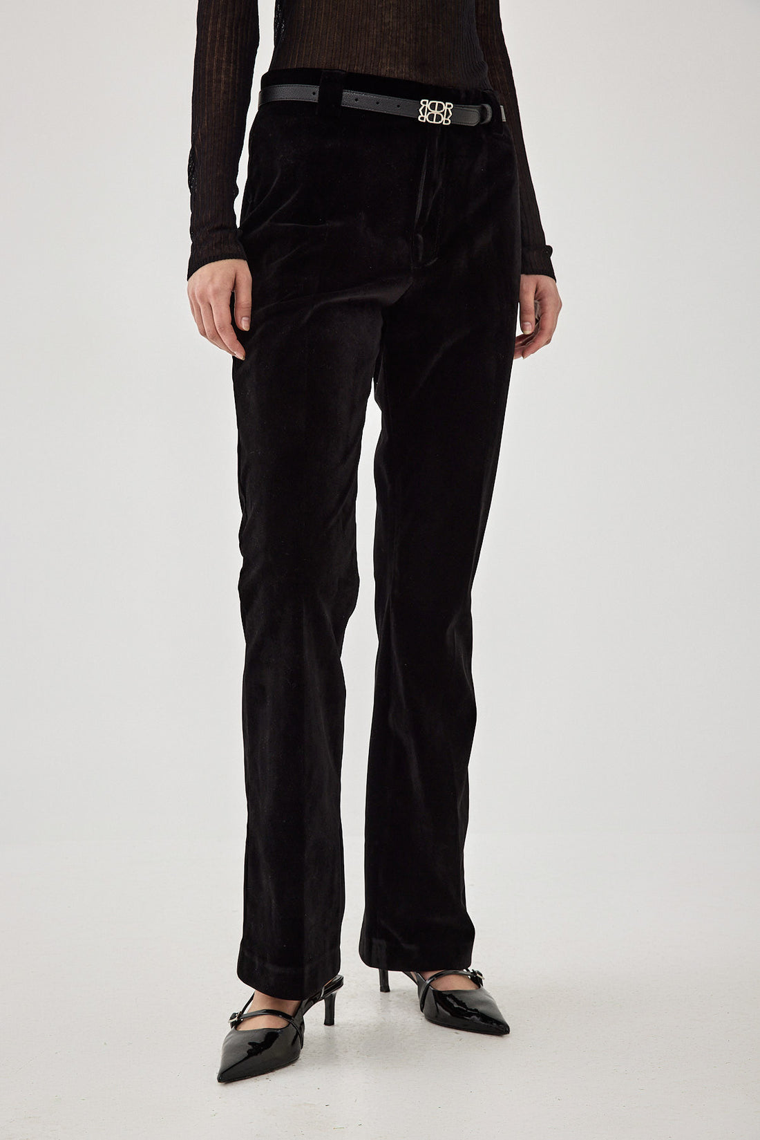 The ultra-chic bootcut silhouette in an elegant fabric material. Rigid velvet. High waisted tailored pants with a bootcut silhouette. Full length. Featuring wide belt loops. Front zip and metal hook closure. Embroidered logo detailing at the back. Style it with our sheer top, the velvet oversized blazer and a kitten heel for a perfect look for date night.